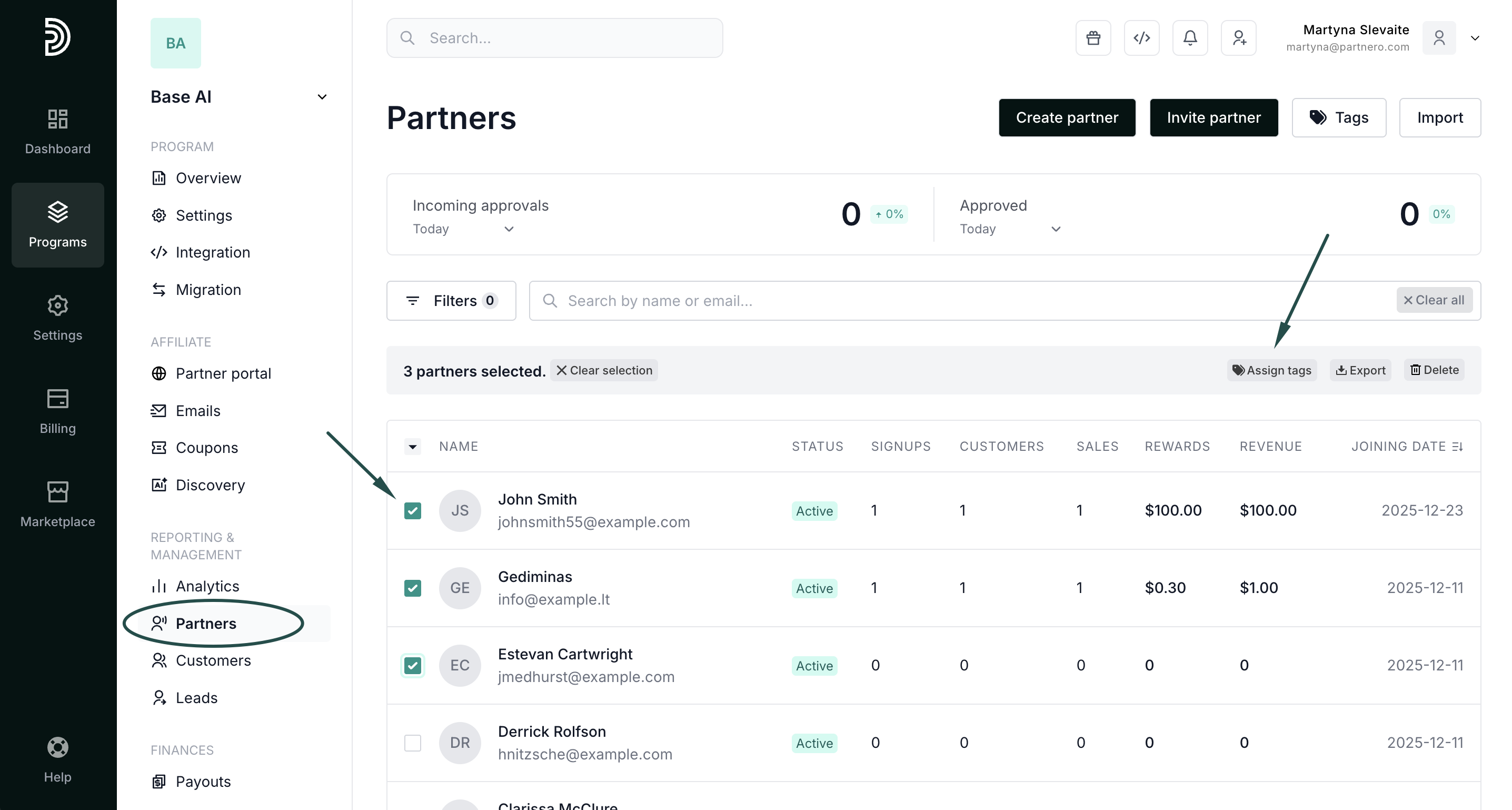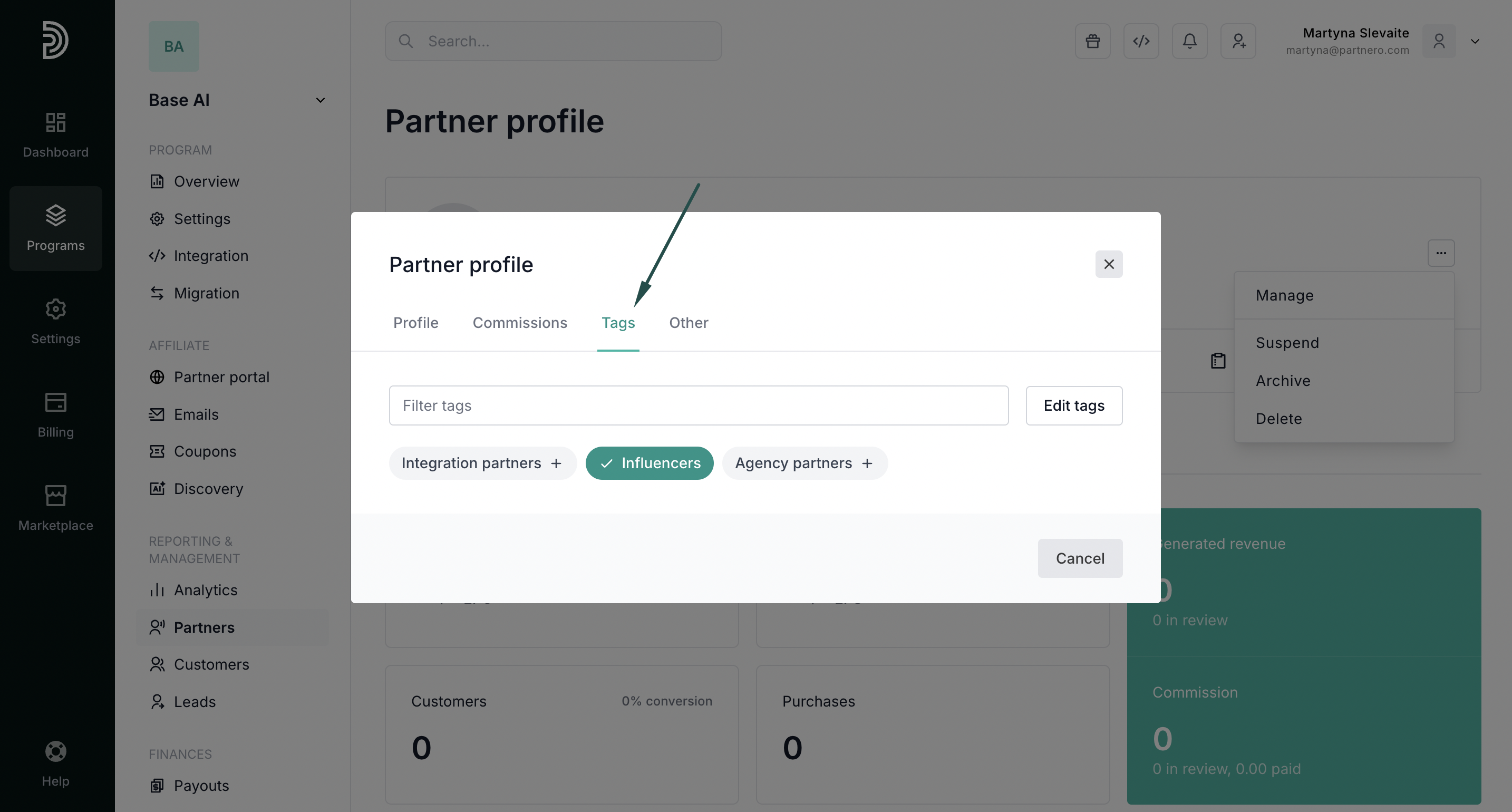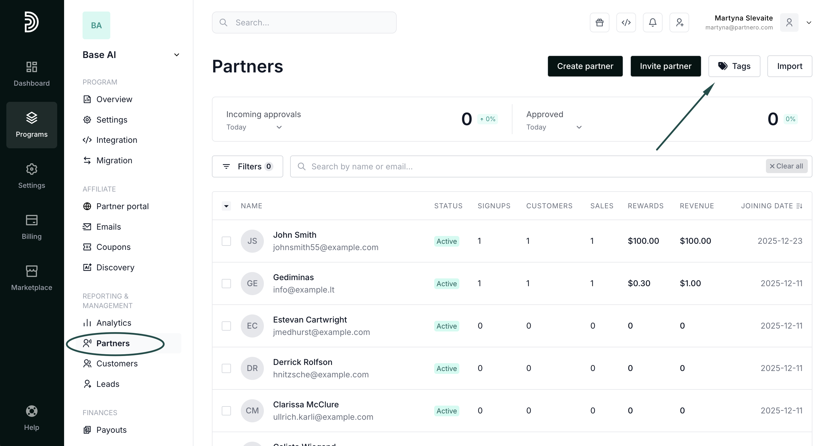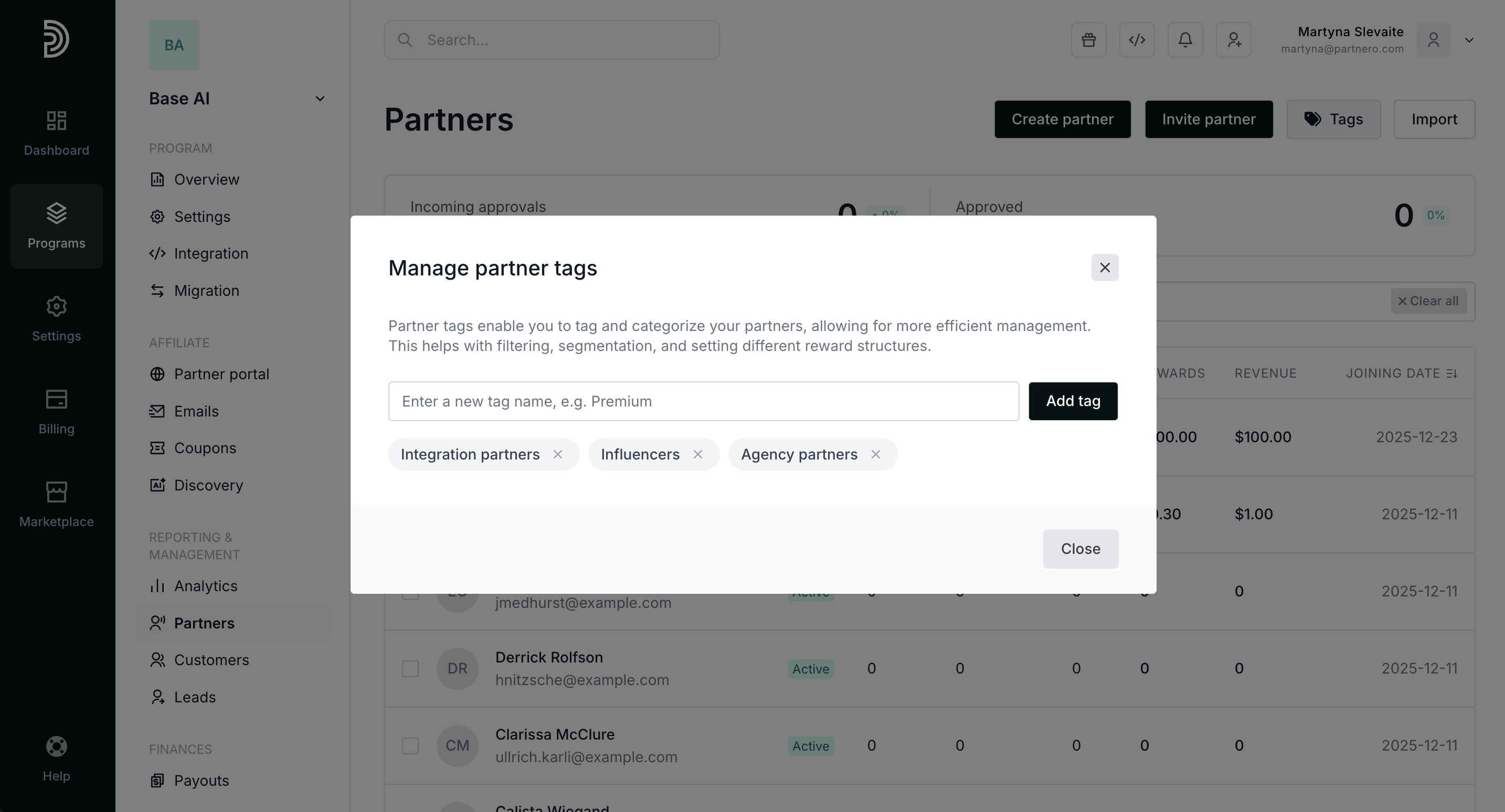 Partner tags enable you to tag and categorize your partners, allowing for more efficient management. This helps with filtering, segmentation, and setting different reward structures. For example, you can tag and offer different rewards to your integration partners, premium partners, and so on.