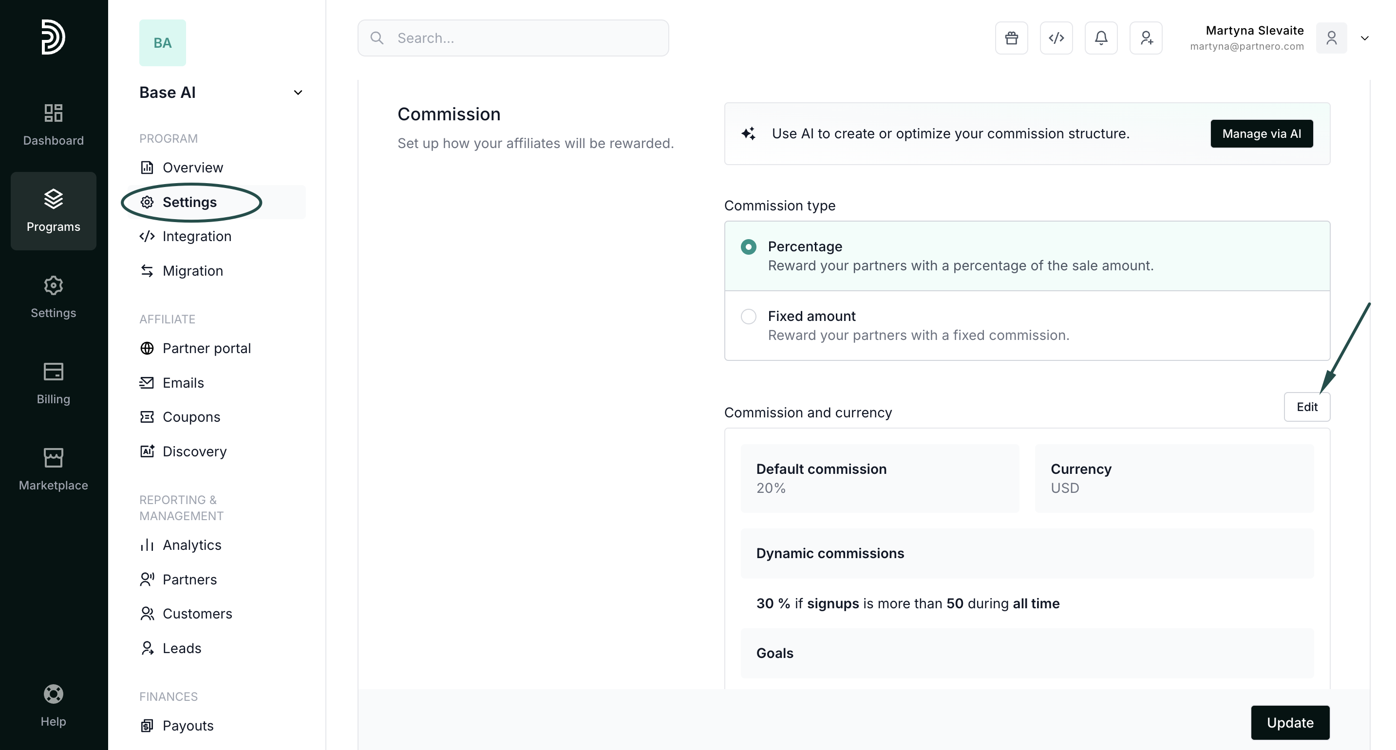 - Go to Settings under Program and click on Advanced commission. If you already have other advanced commissions set up, click Edit: