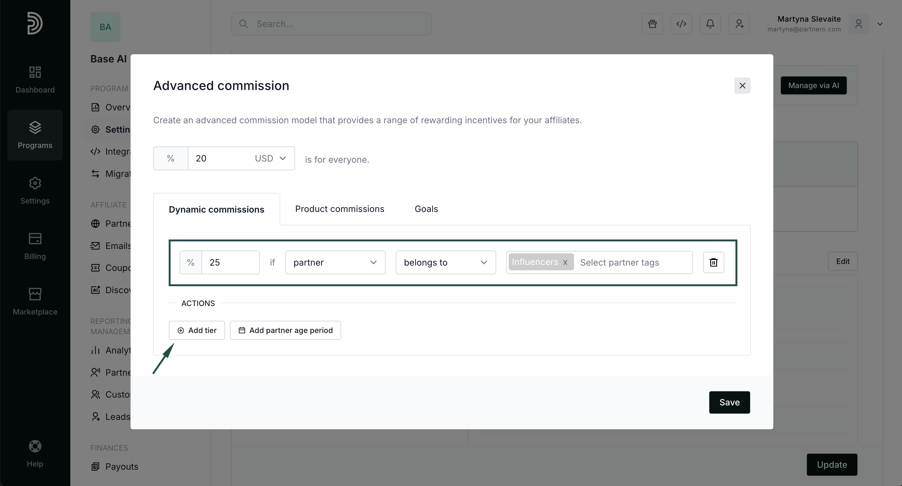 - In the Dynamic commissions tab, click +Add tier and set up the reward condition. In the example below, we're offering 25% commission if a partner > belongs to > "Influencers":