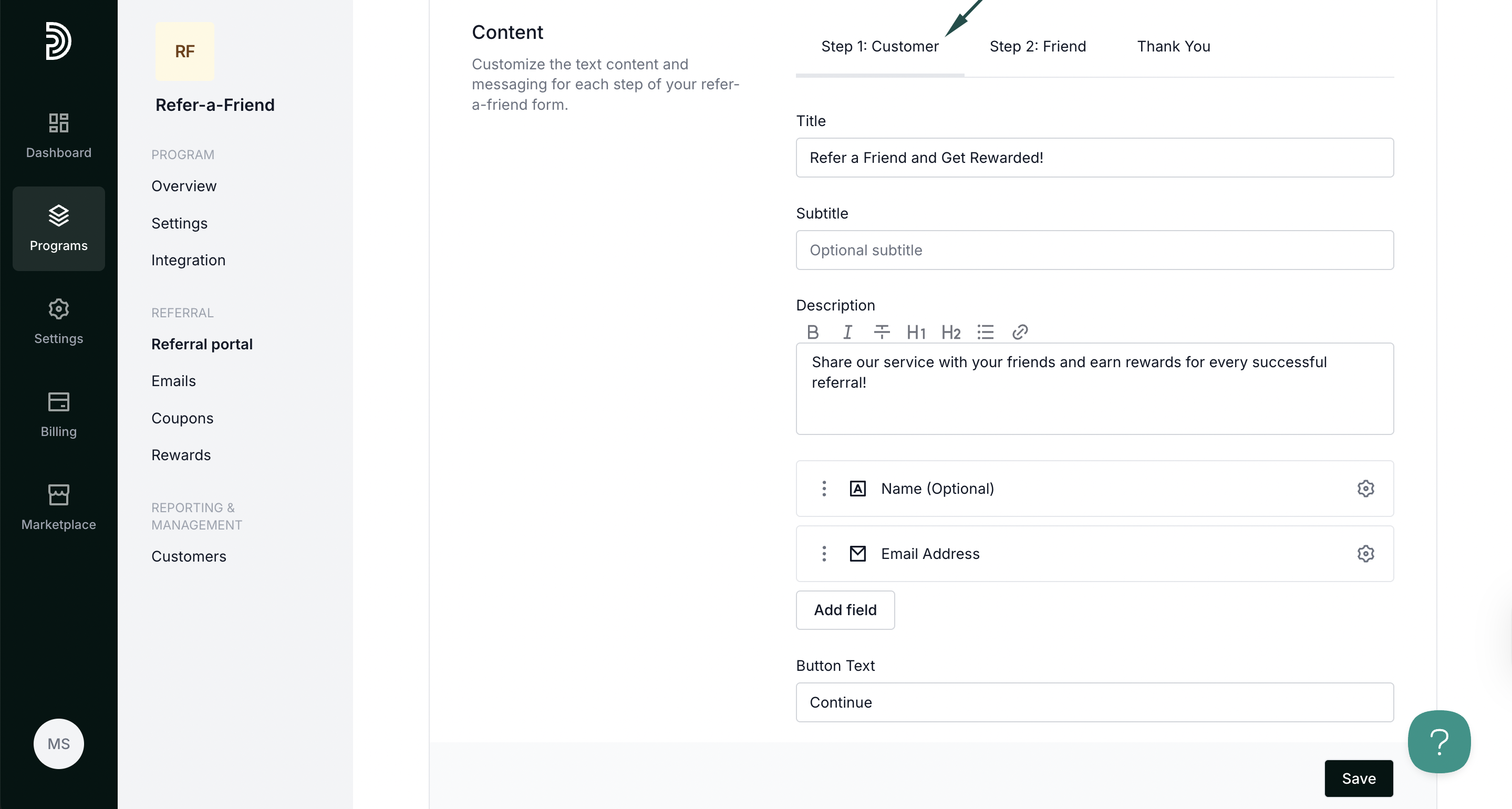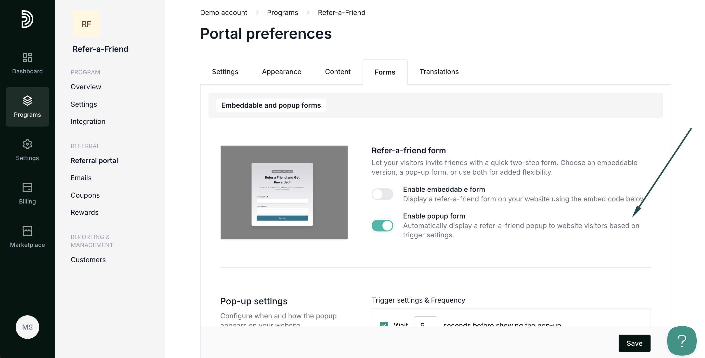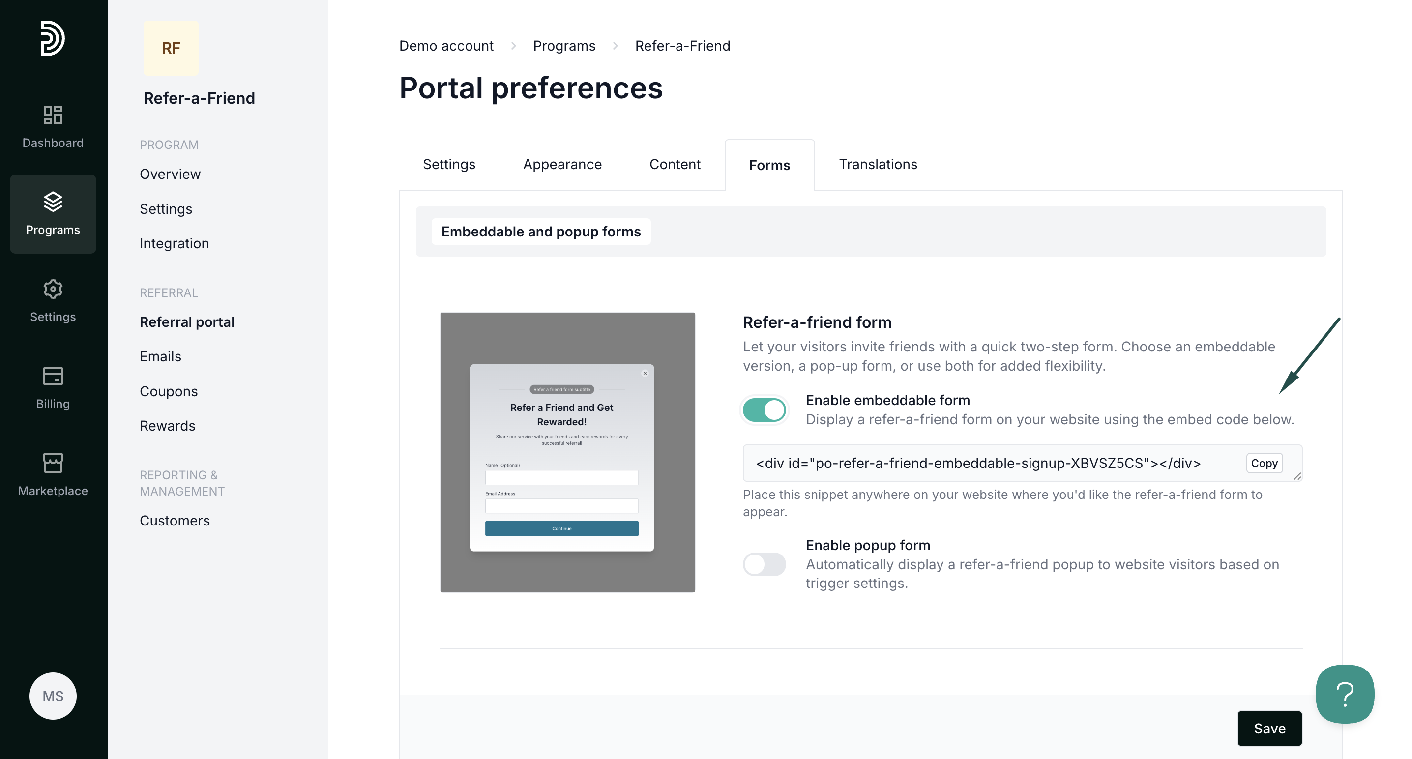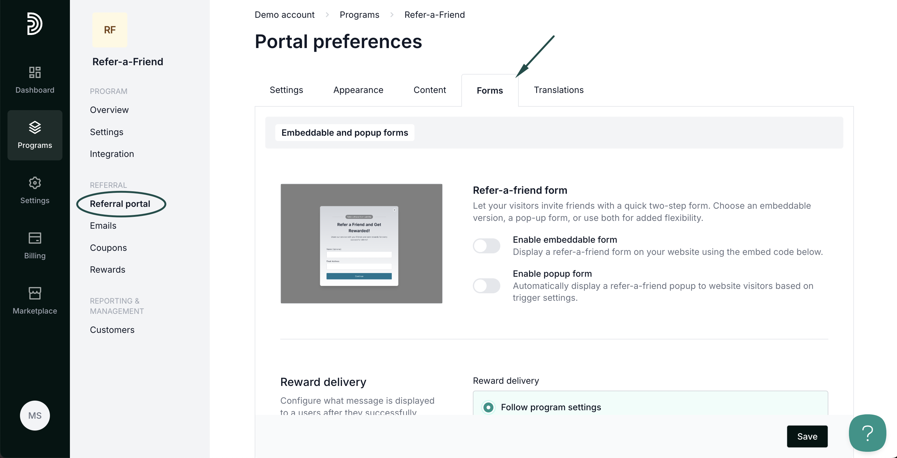 To customize and enable forms, open your refer-a-friend program and navigate to Referral portal. Switch to the Forms tab: