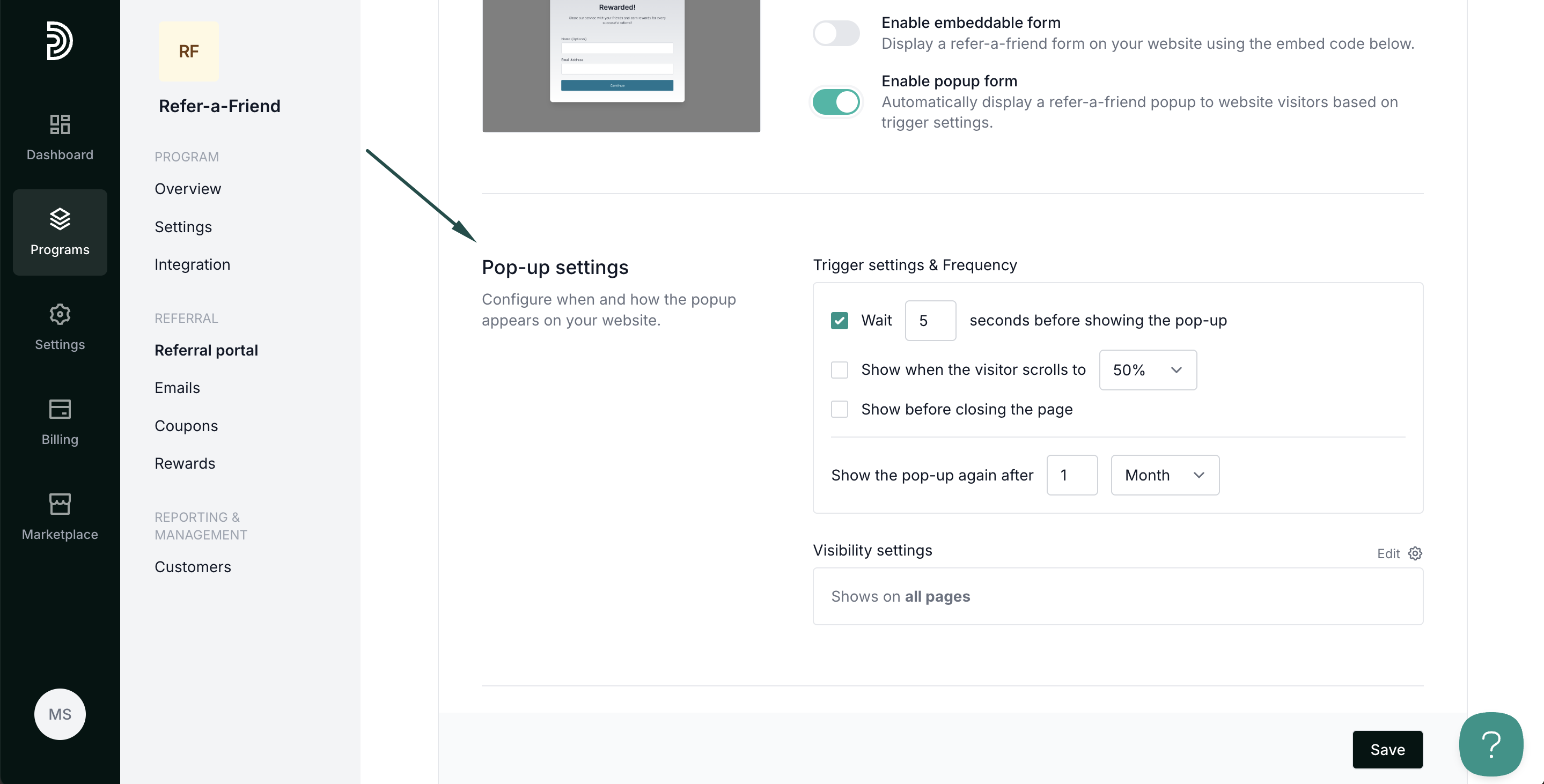 Embeddable and pop-up forms for refer-a-friend programs