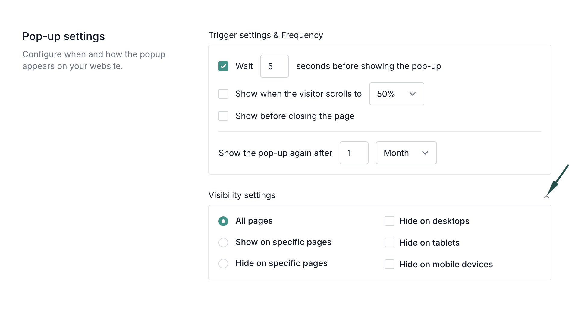 - Show before closing the page: the popup will appear if a visitor moves their mouse towards the closing of the page (tab).