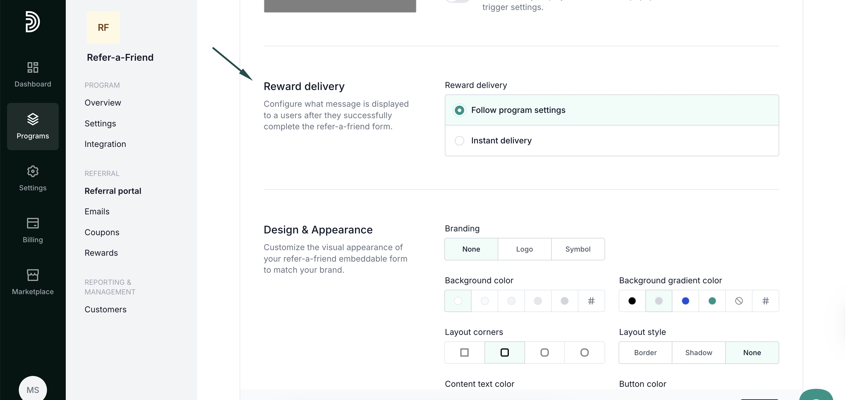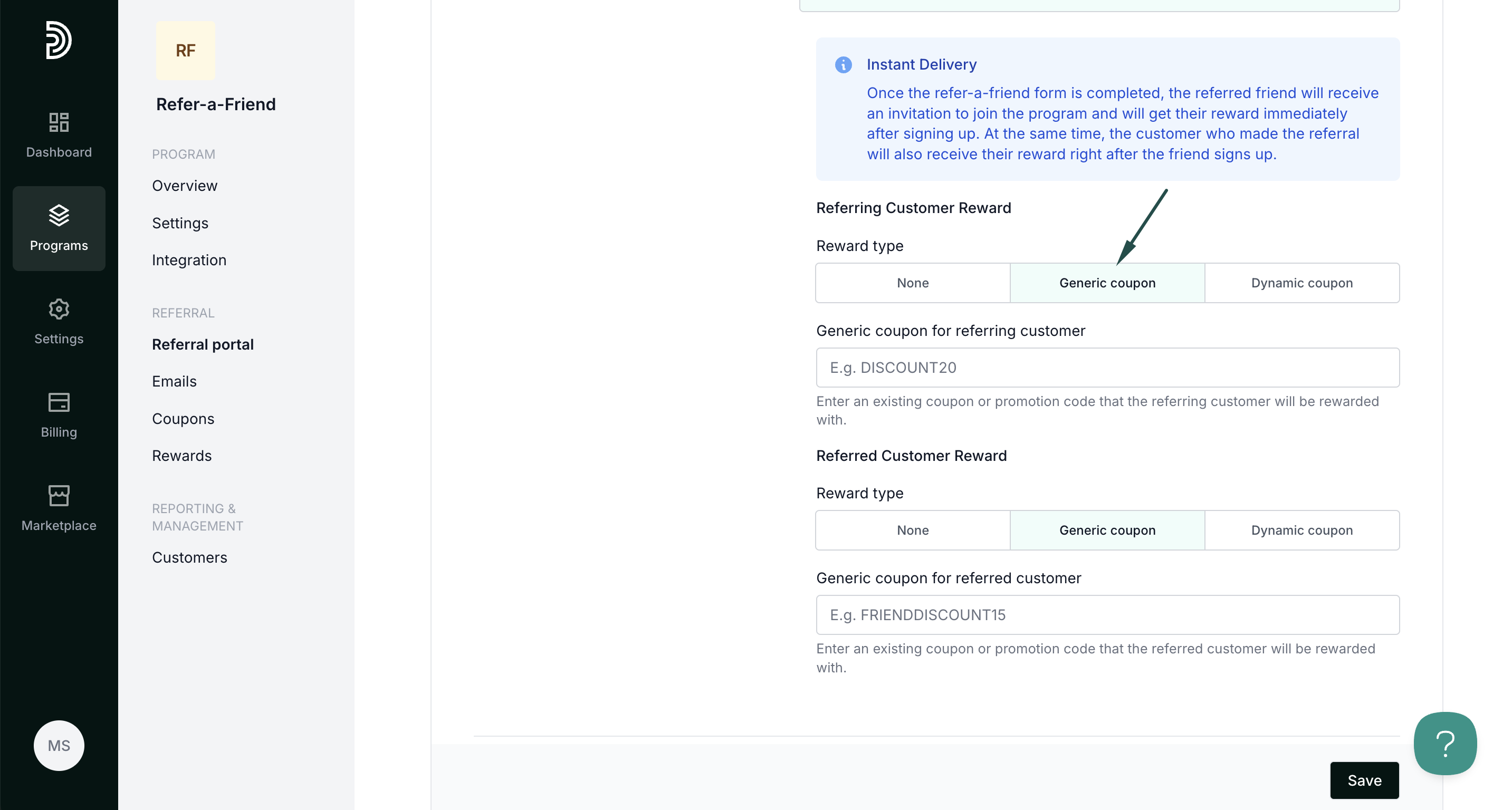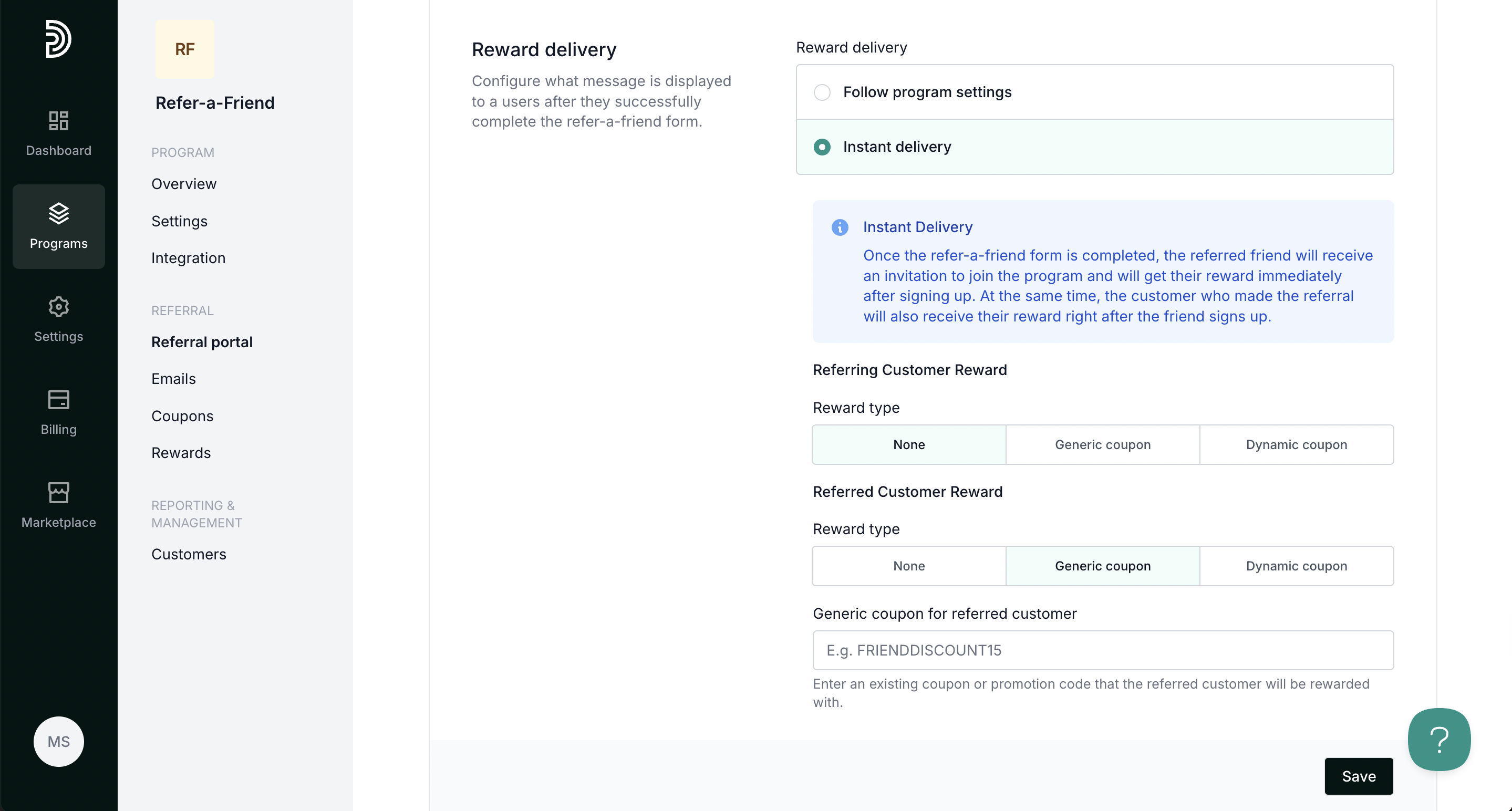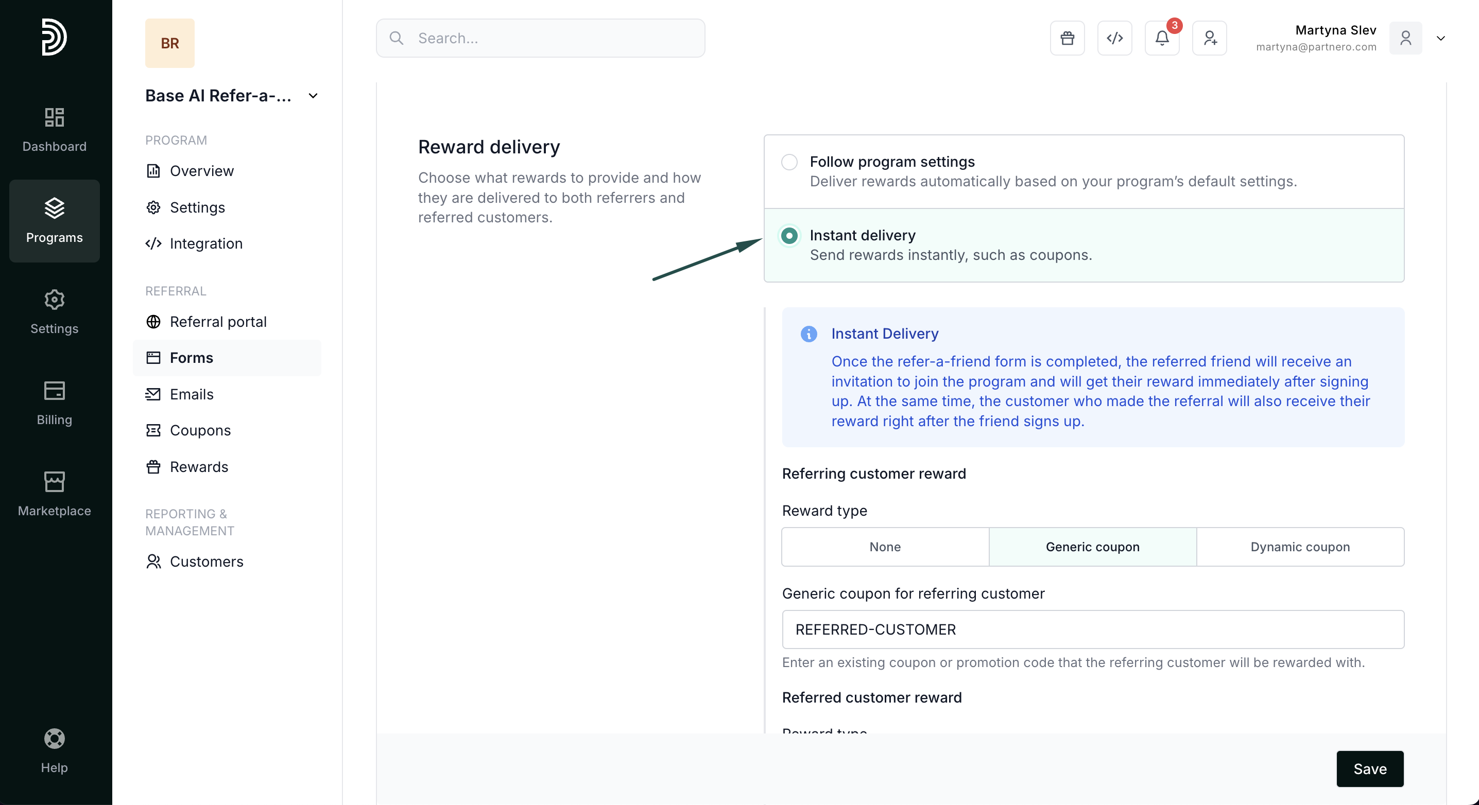 If you enable Instant delivery, additional settings will be presented to configure the rewards: