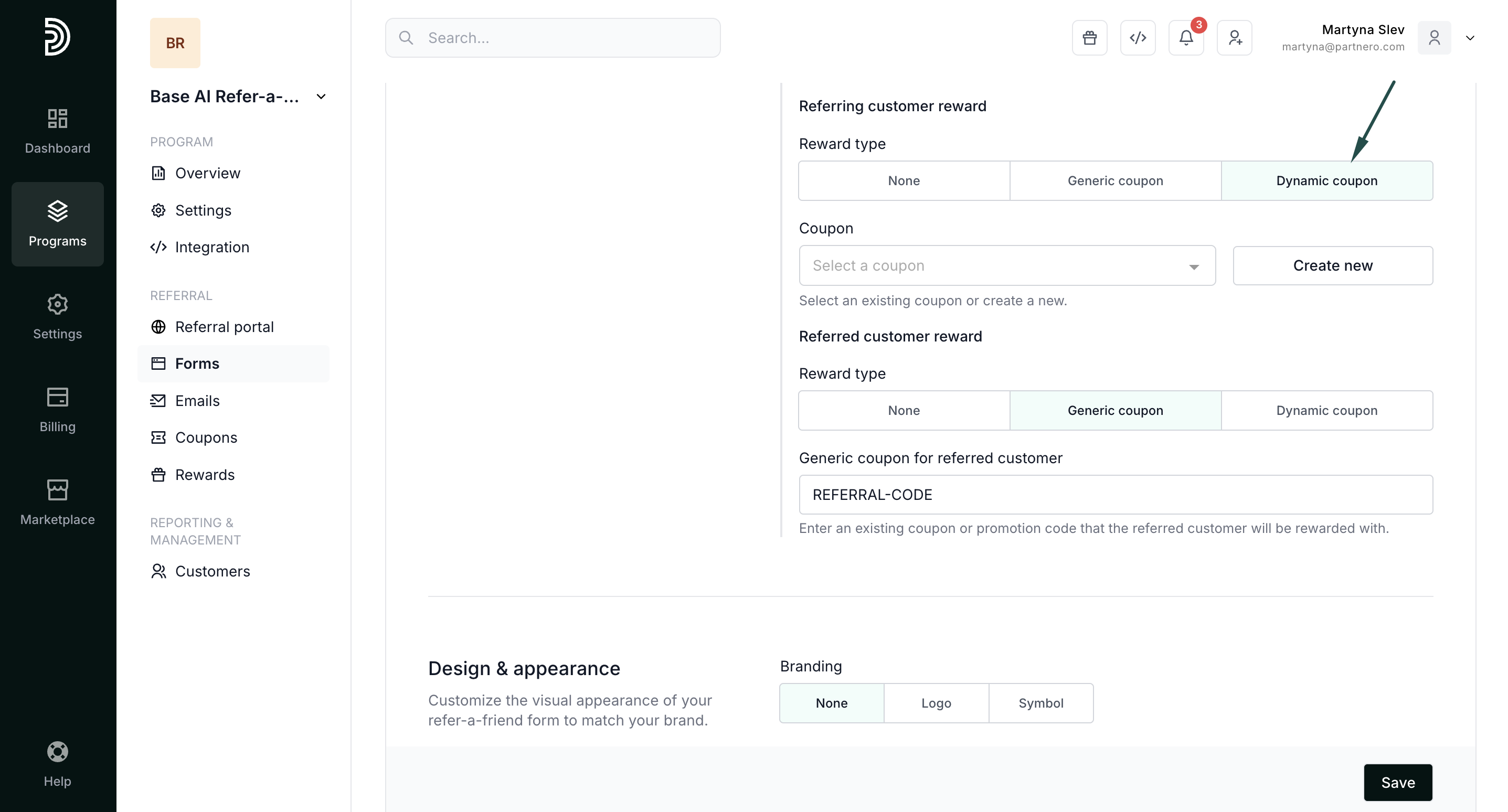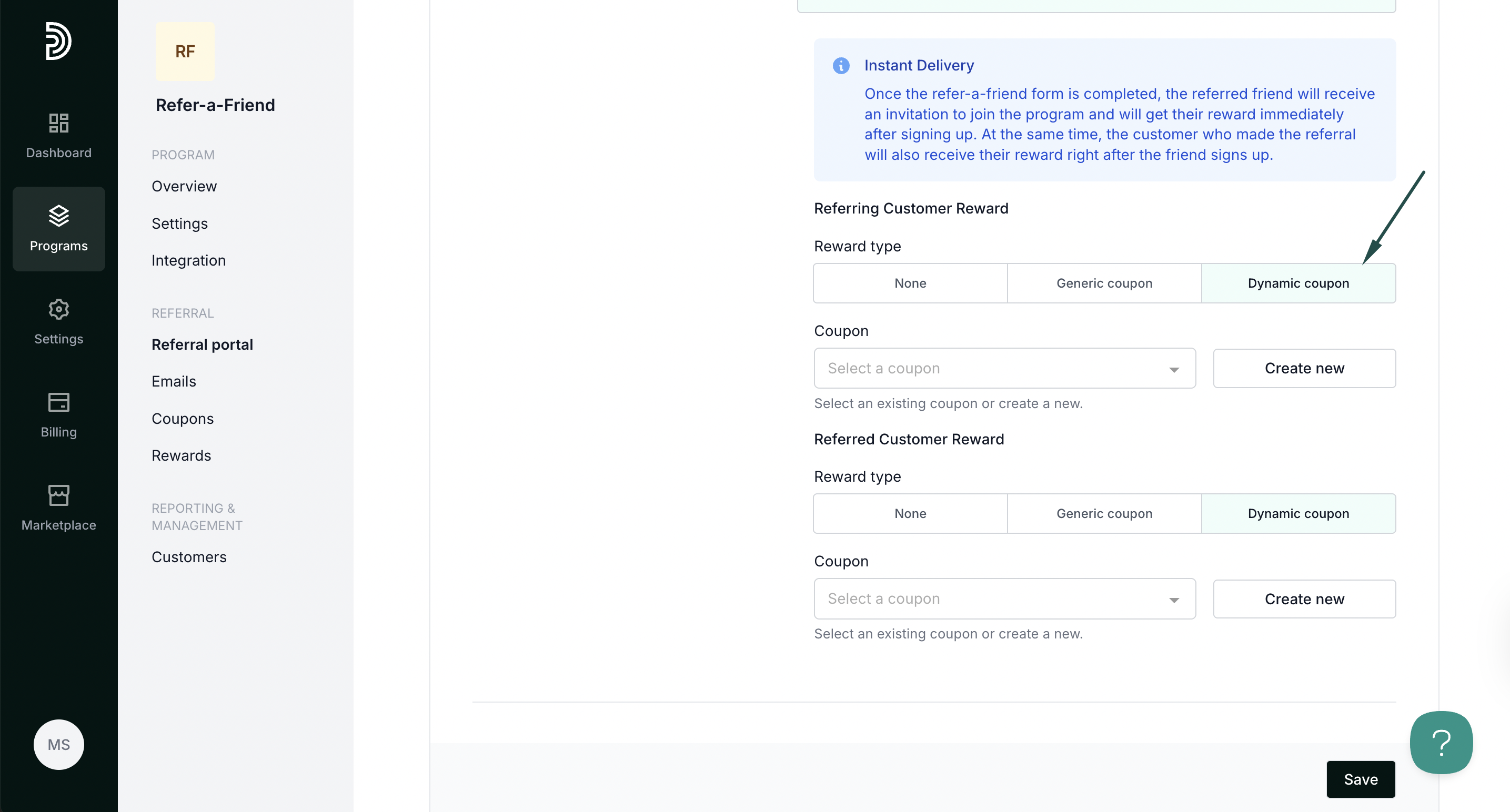 - Dynamic coupon - create new or select from existing dynamic coupons to use as a reward. Read more about dynamic coupons here.