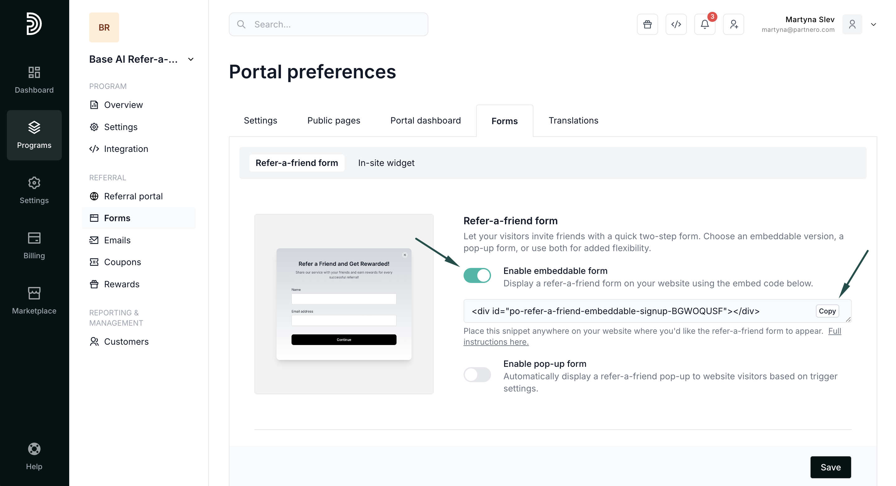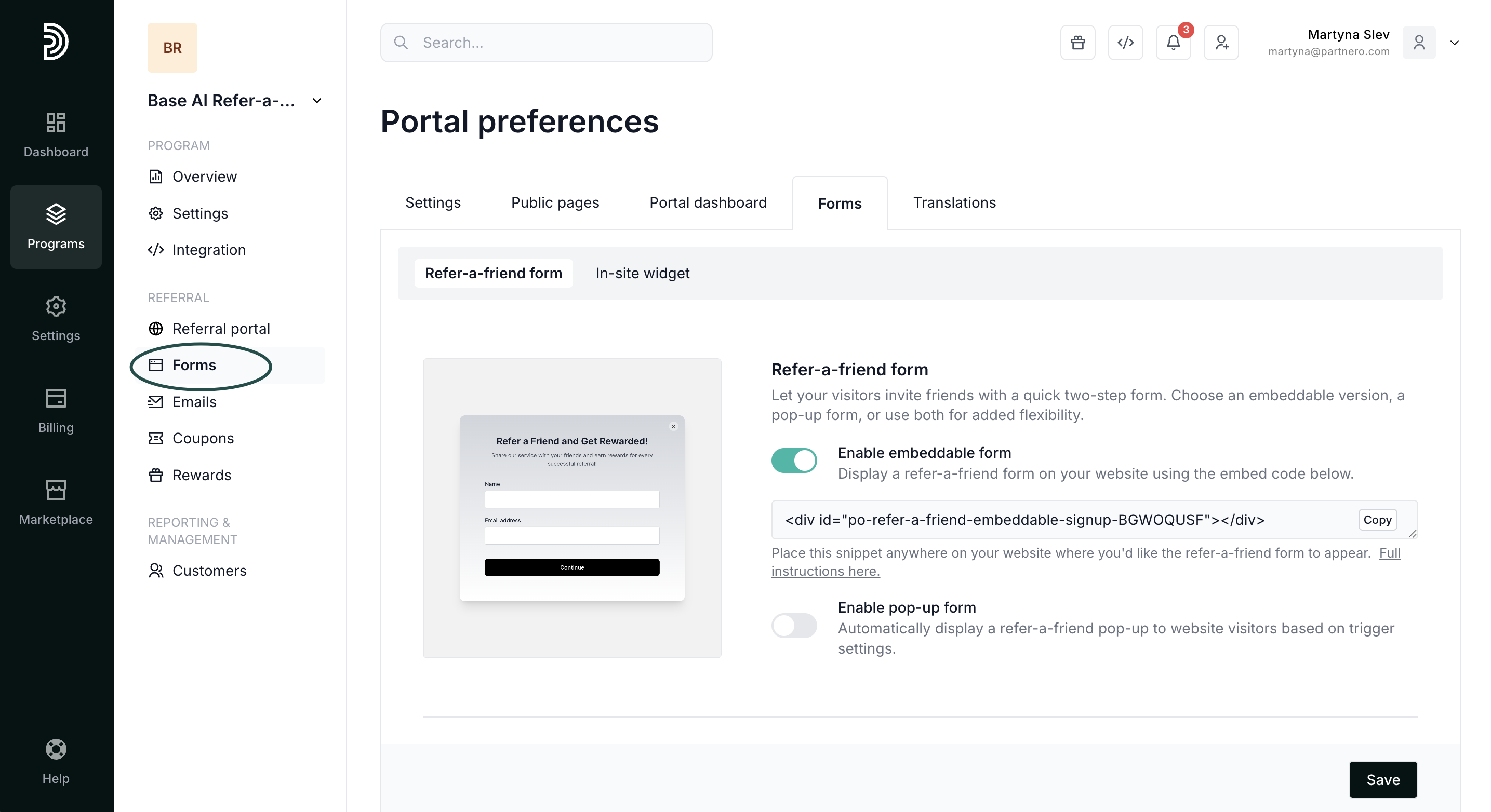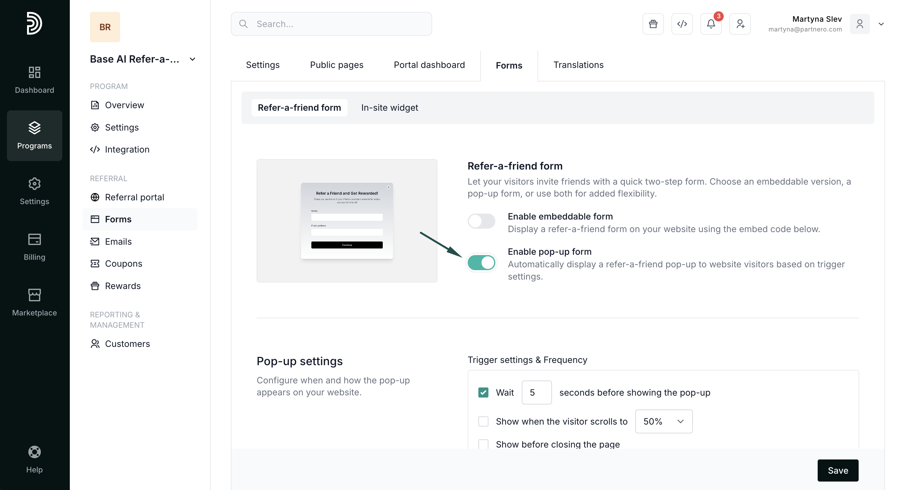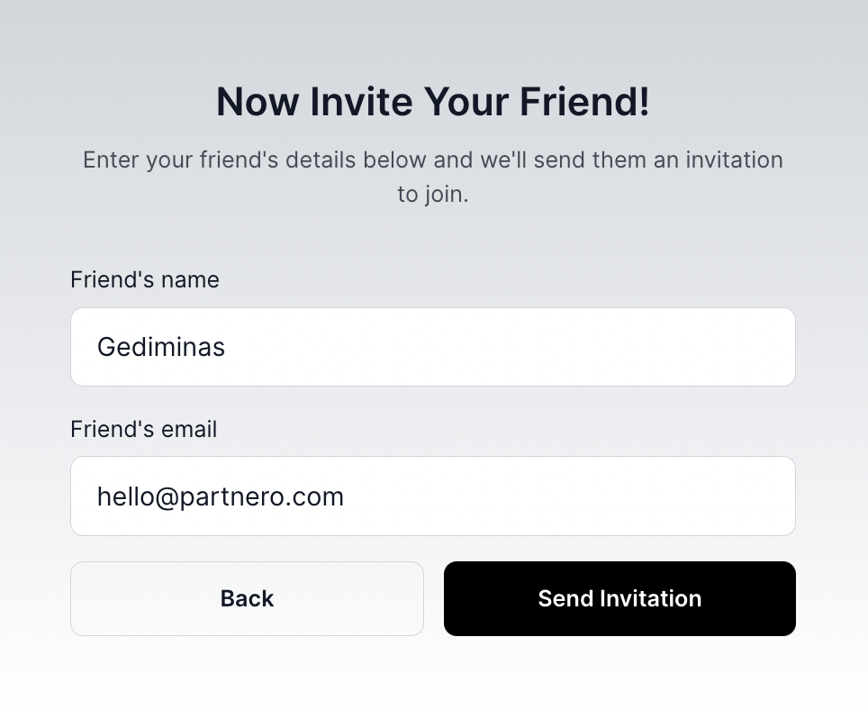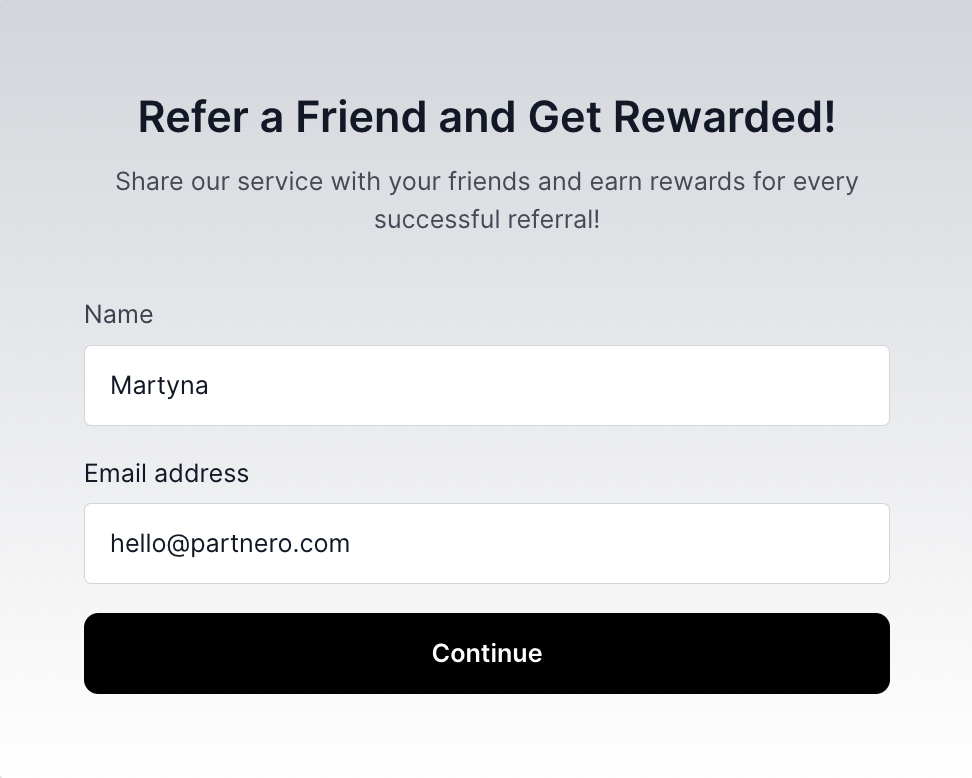 With Partnero refer-a-friend programs, you can enable your visitors to invite friends with a quick two-step form. Choose an embeddable version, a pop-up form, or use both for added flexibility. In this article, we'll review how to enable and customize the forms, rewards, and the process.