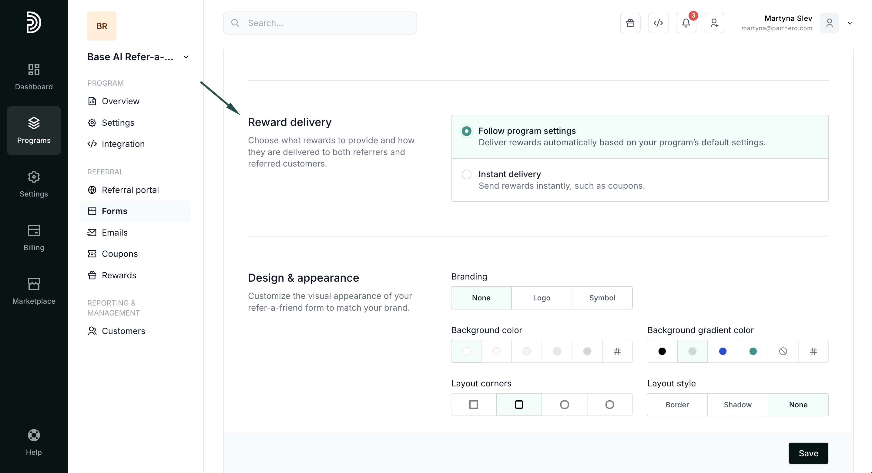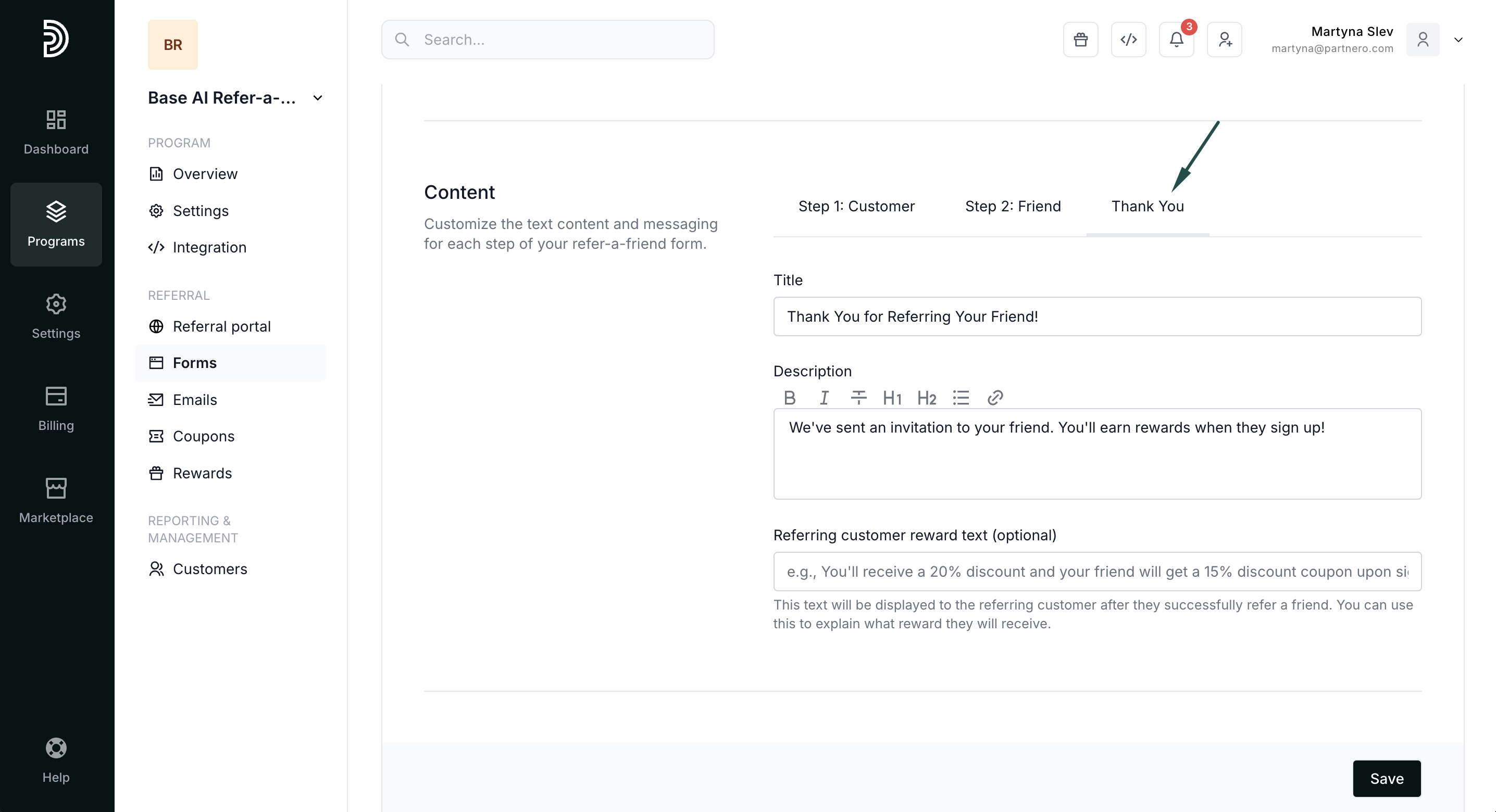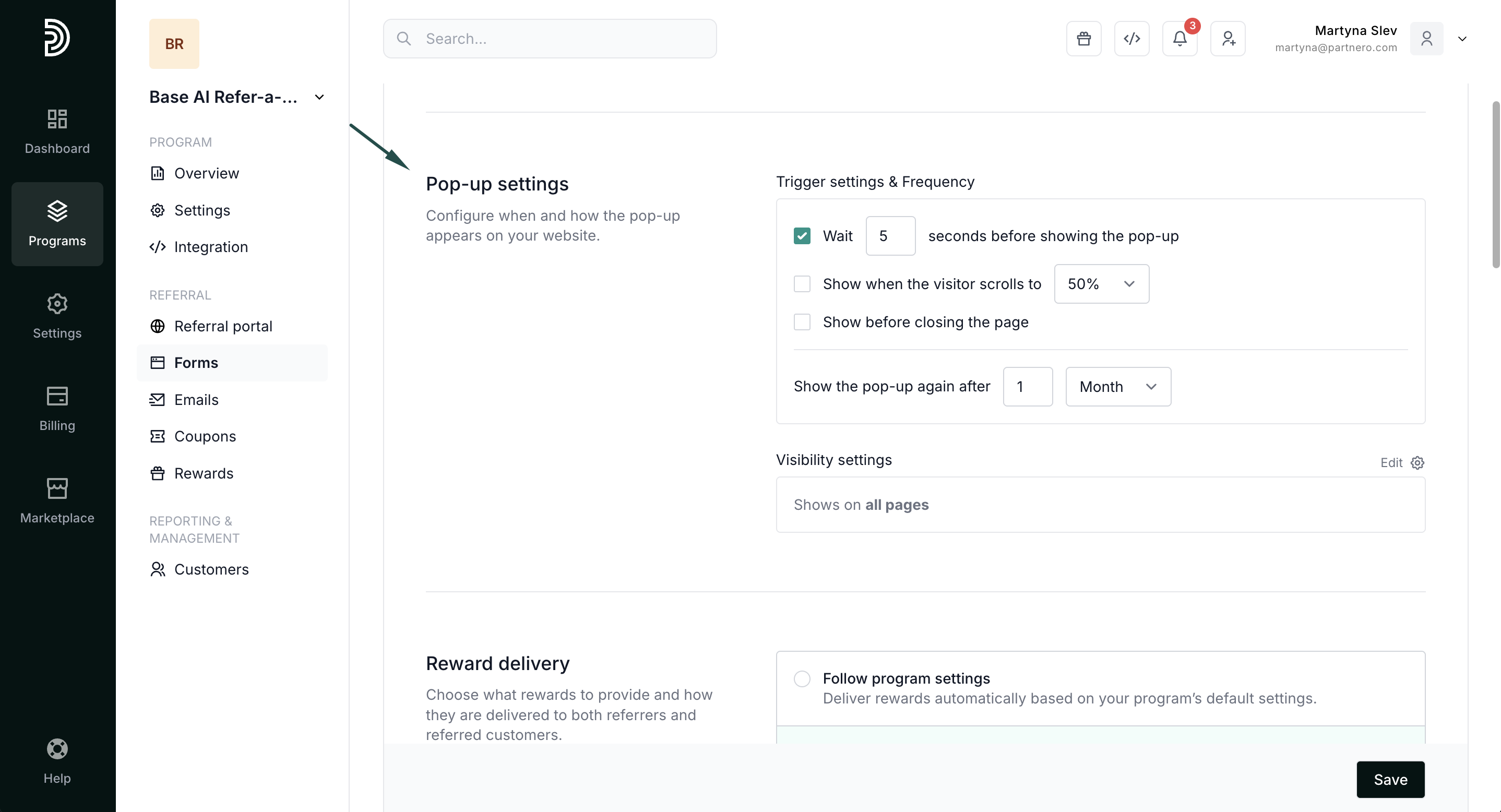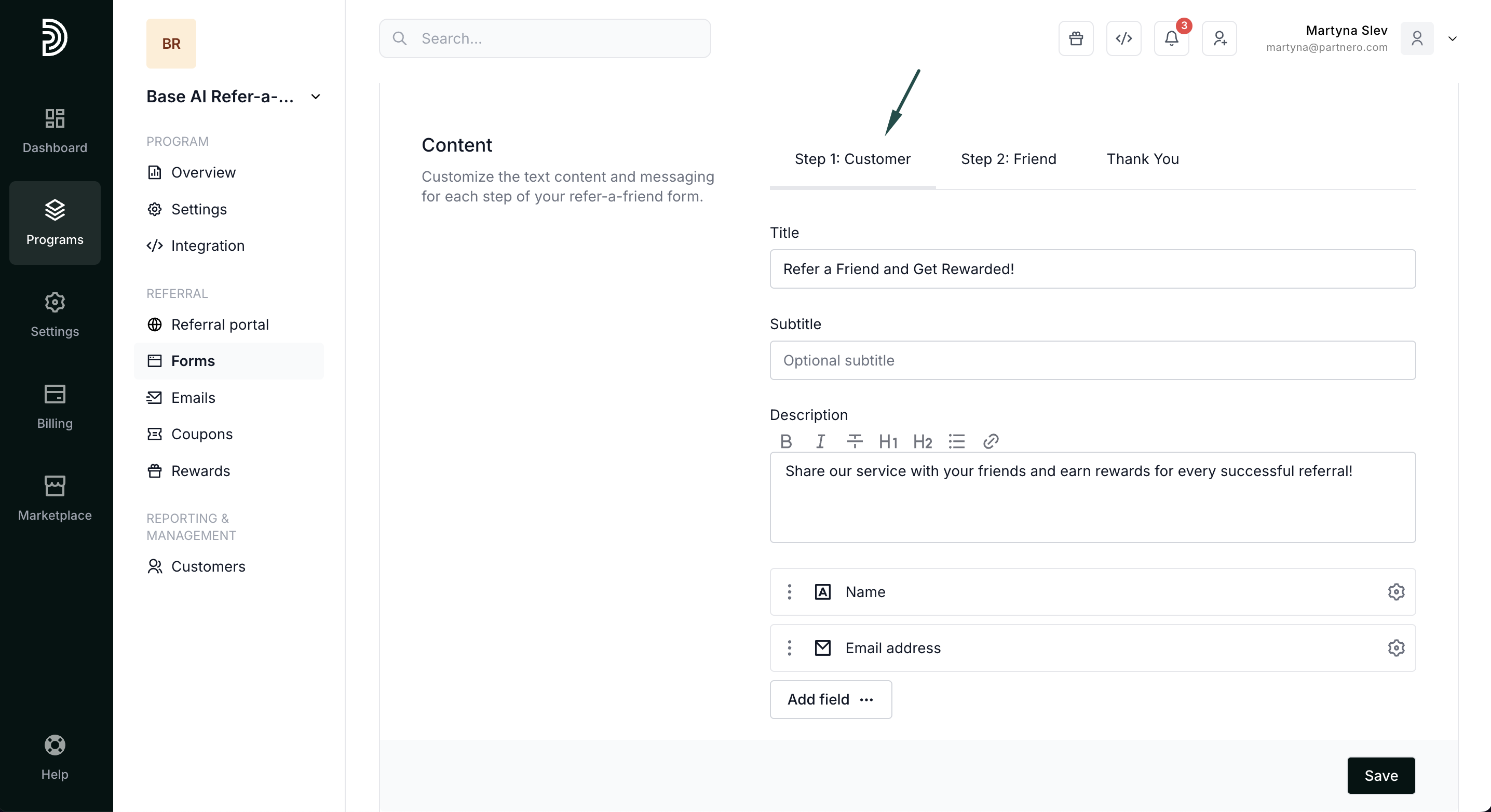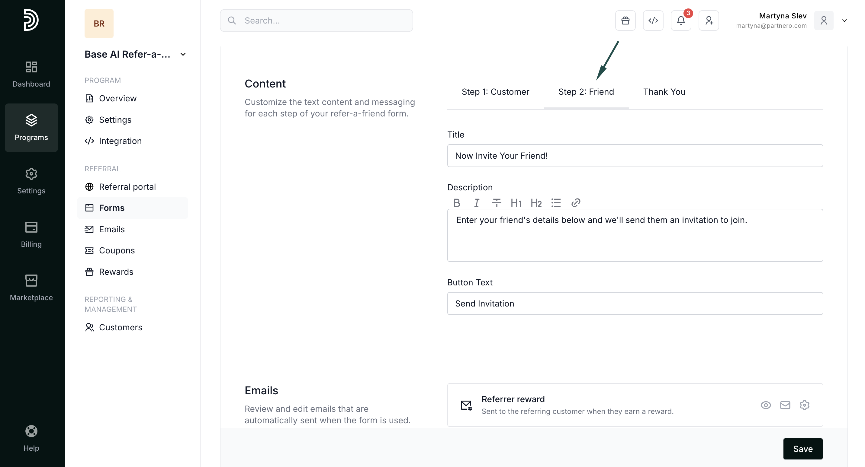 With Partnero refer-a-friend programs, you can enable your visitors to invite friends with a quick two-step form. Choose an embeddable version, a pop-up form, or use both for added flexibility. In this article, we'll review how to enable and customize the forms, rewards, and the process.