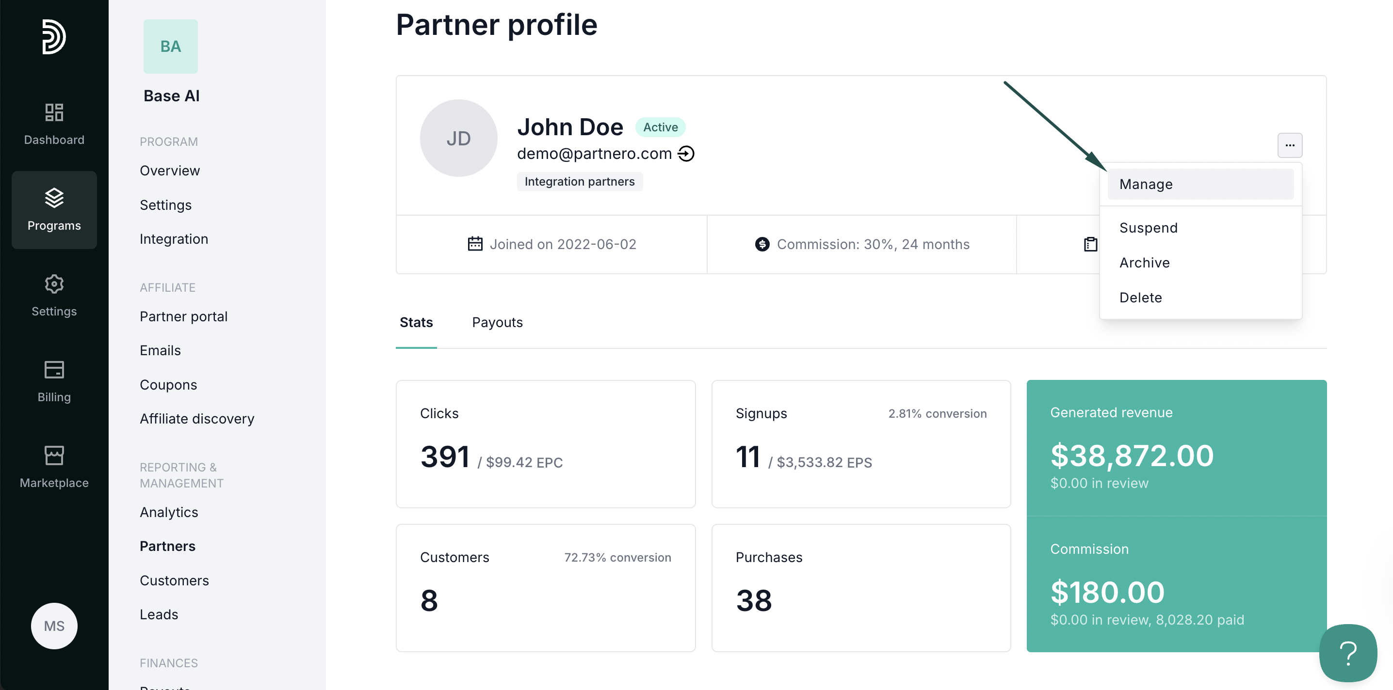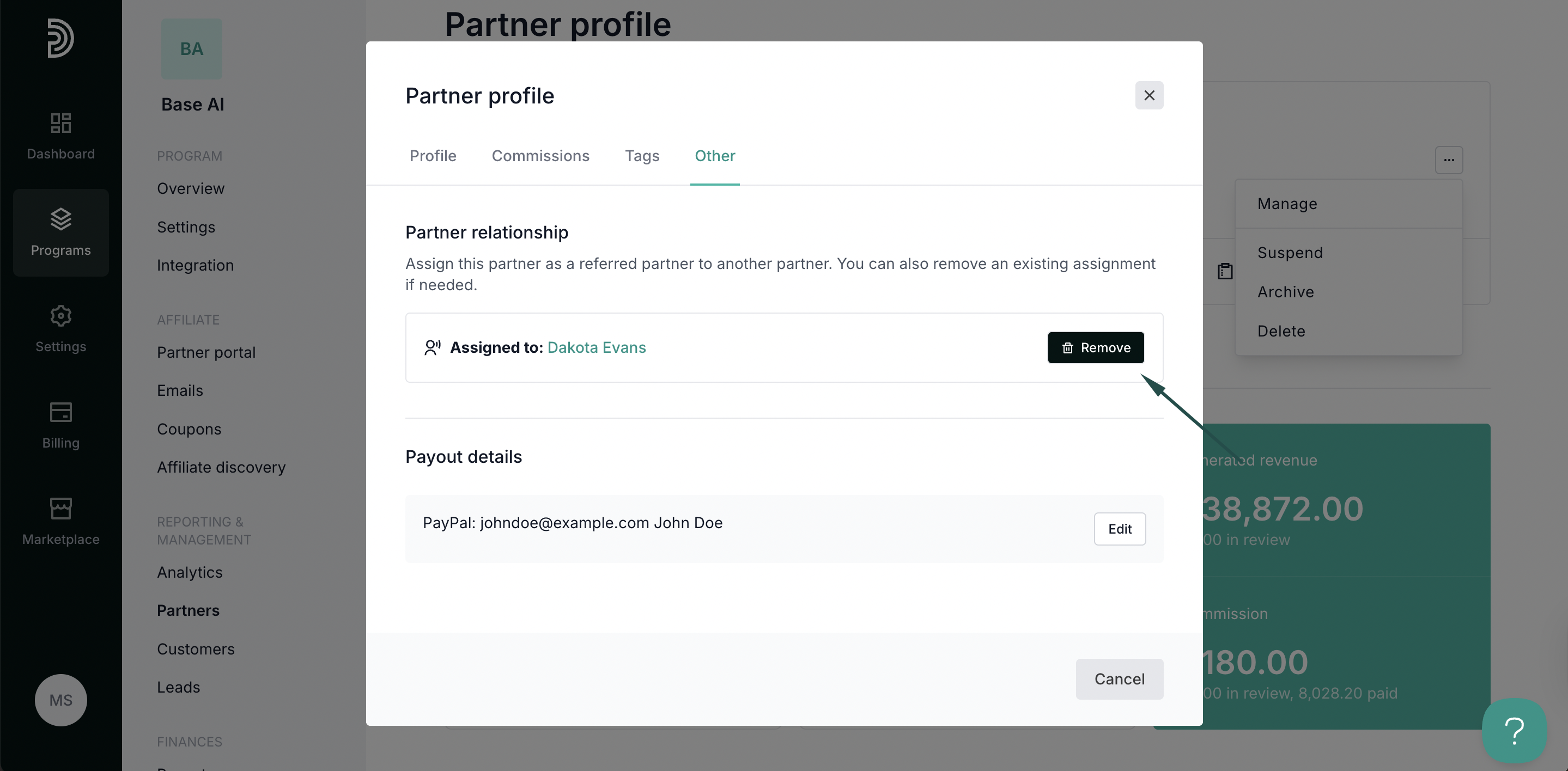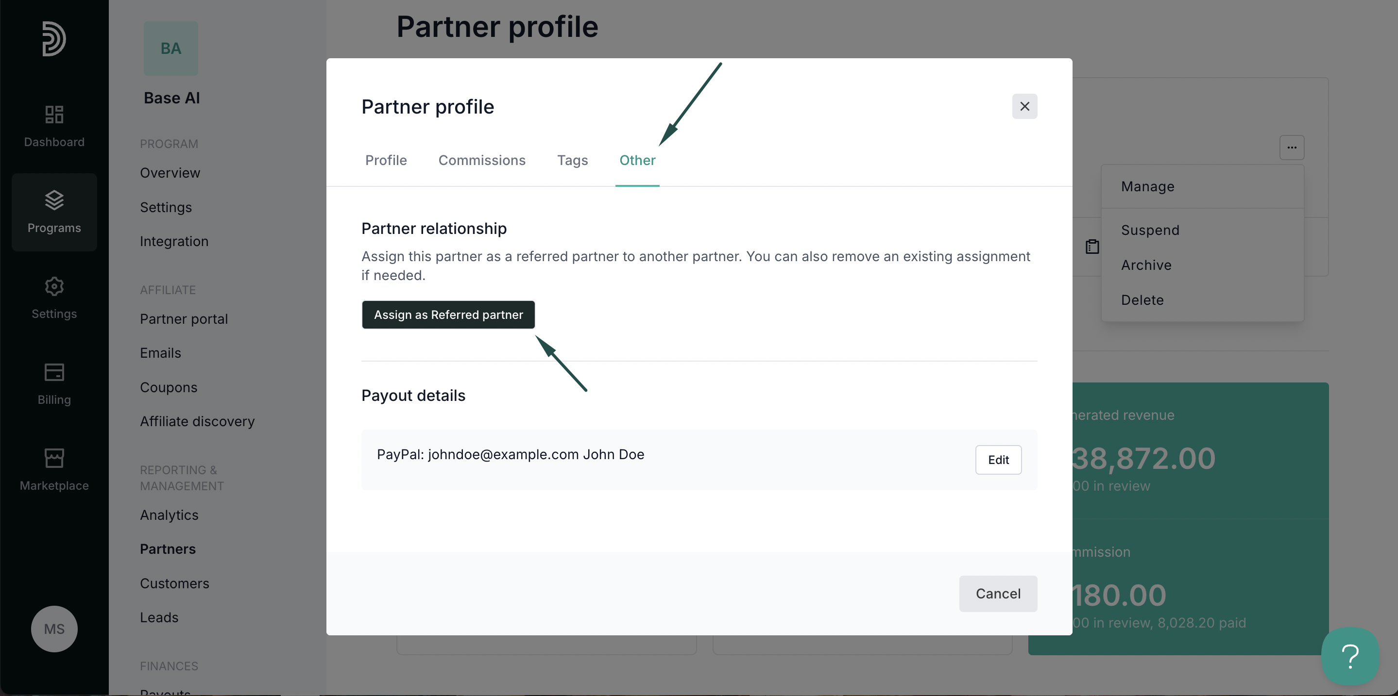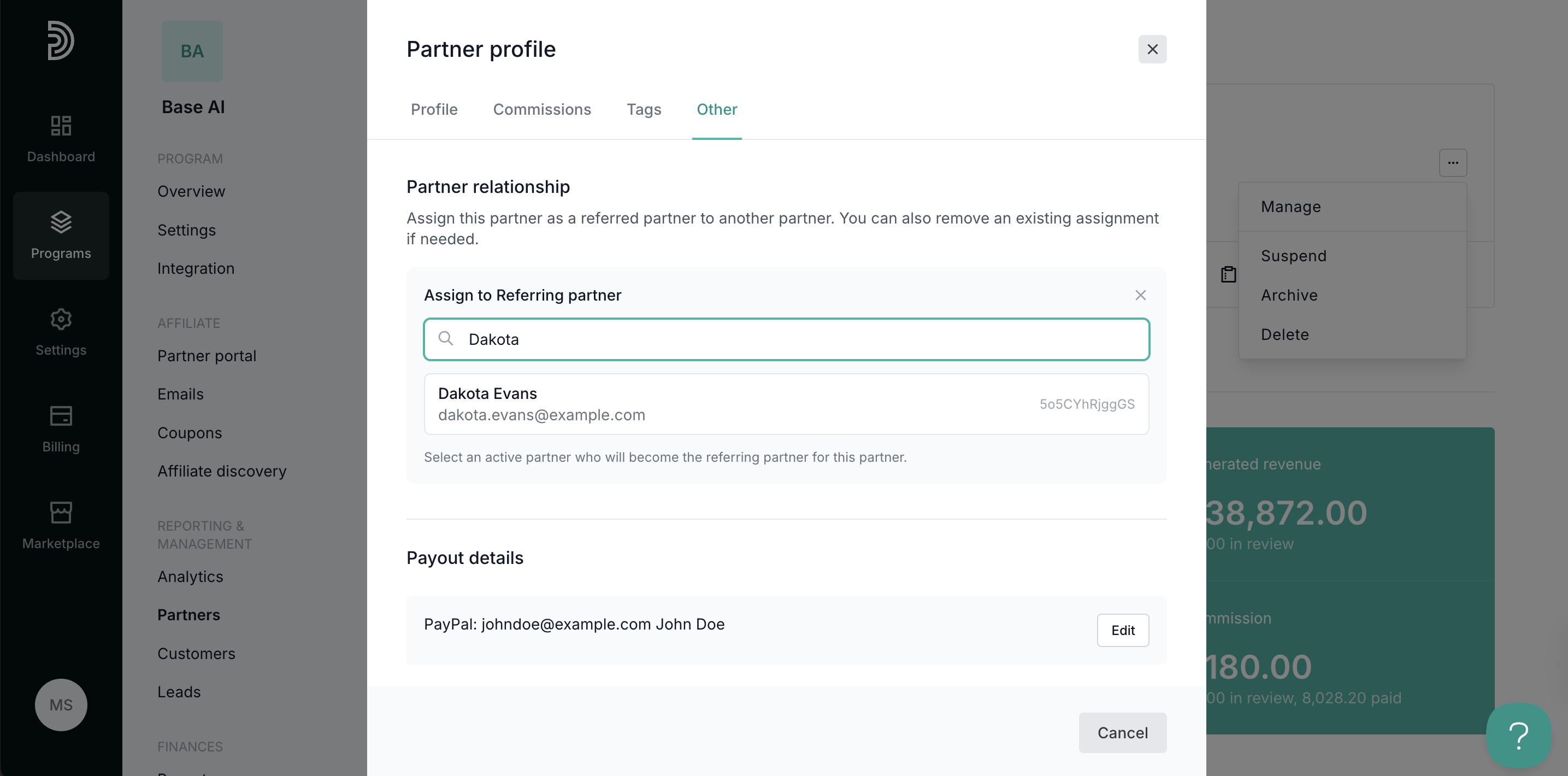 If you are using a multi-level commission structure, you can now manually manage referral relationships between partners. This allows program owners to assign or remove a referred partner directly from the Partner Profile.