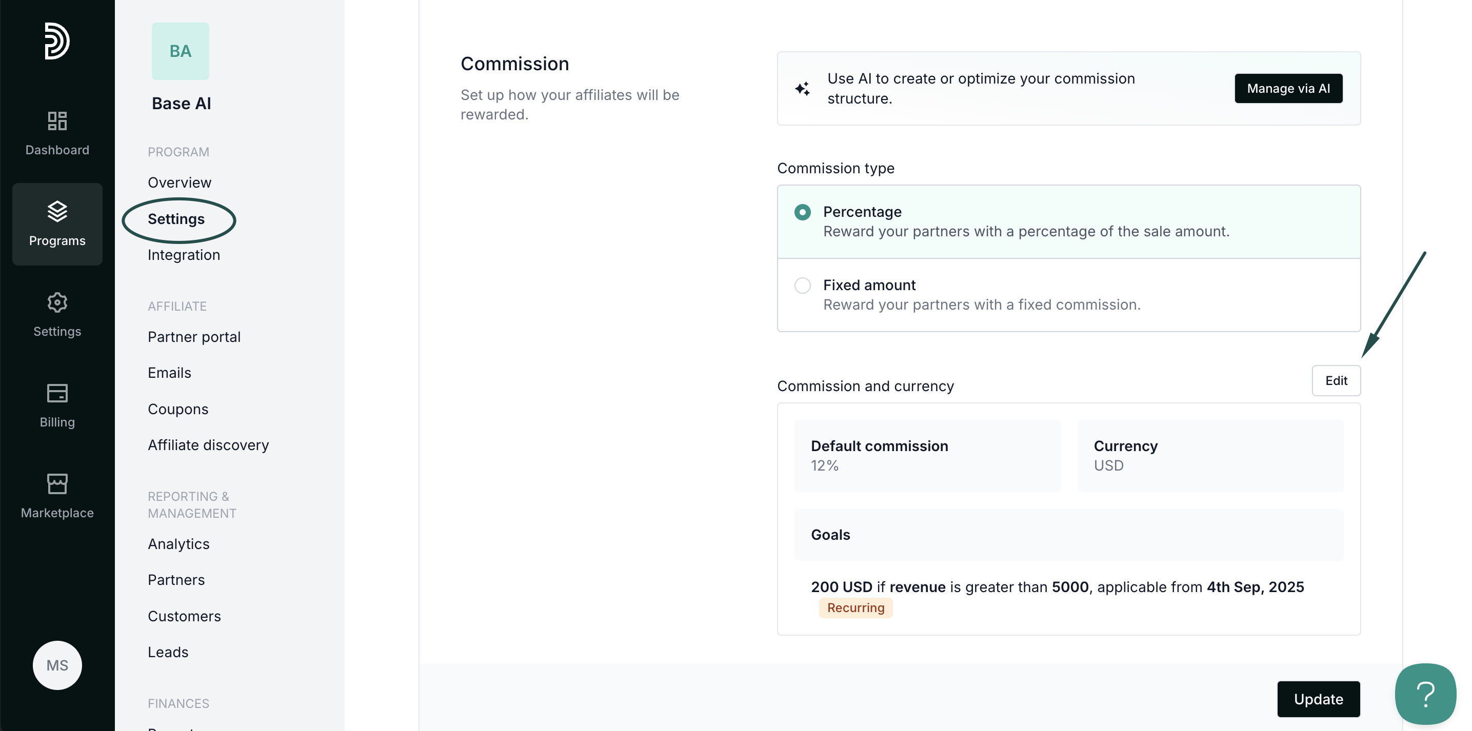 - Go to Settings under Program and click on Advanced commission.