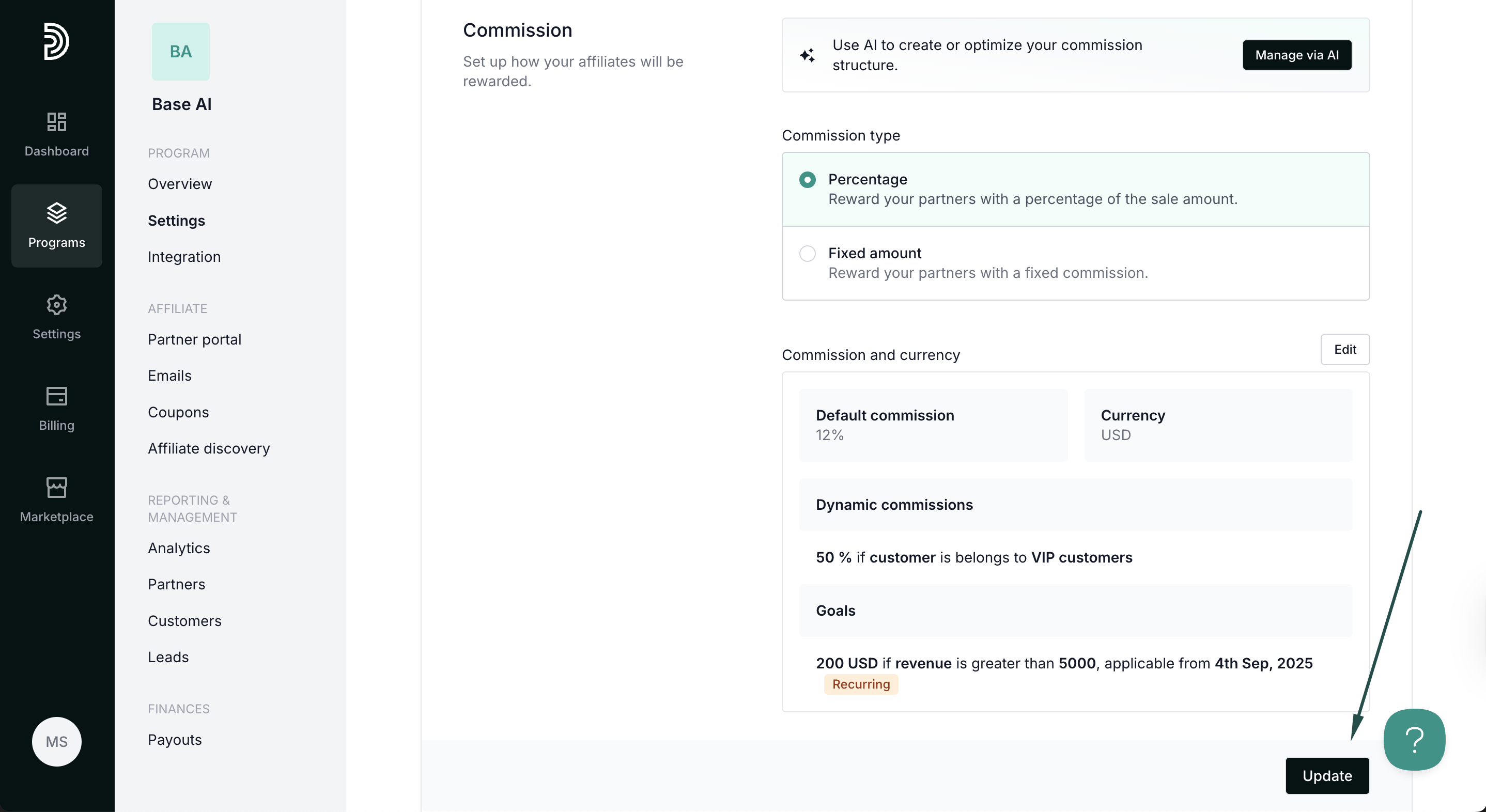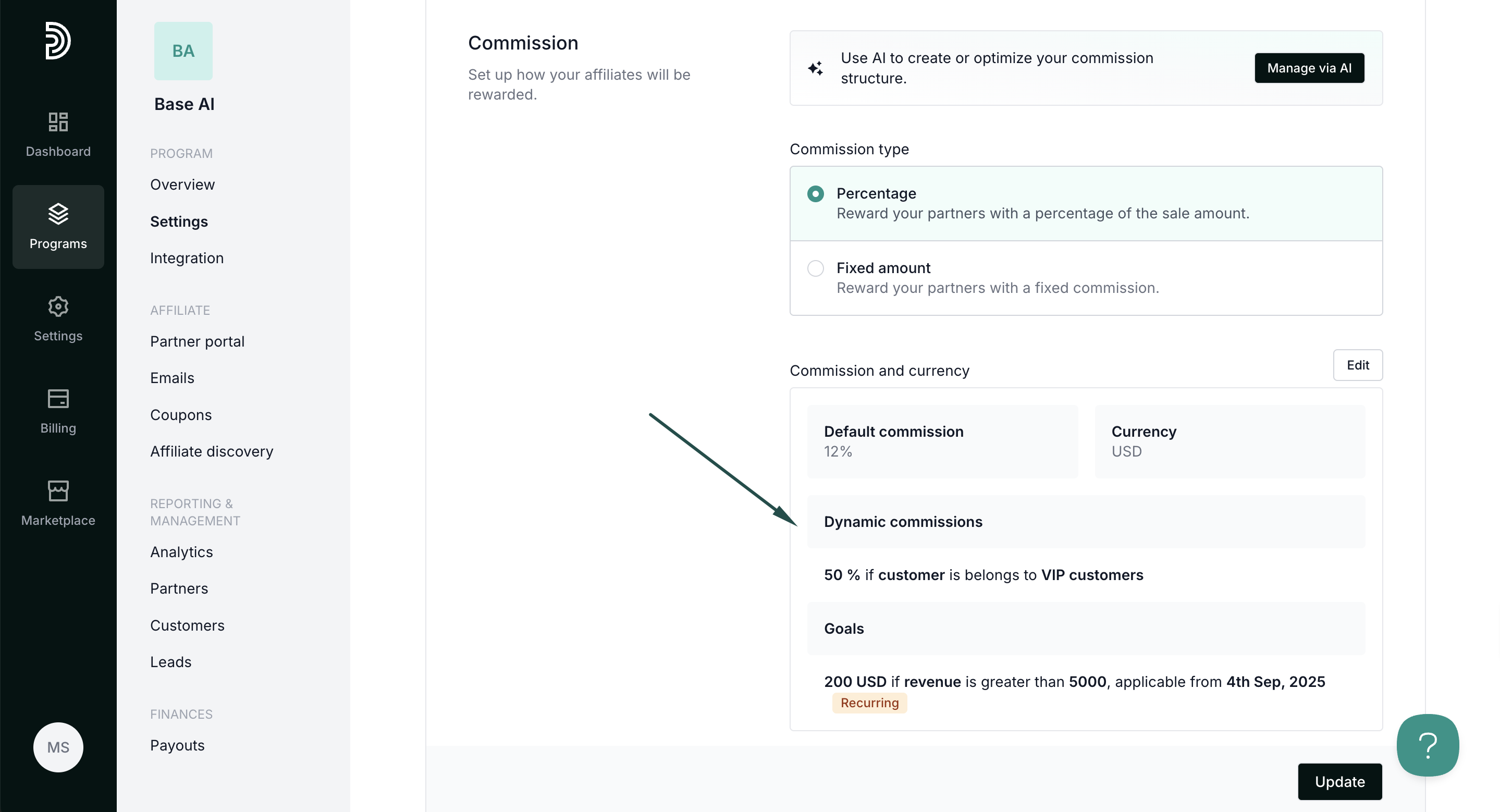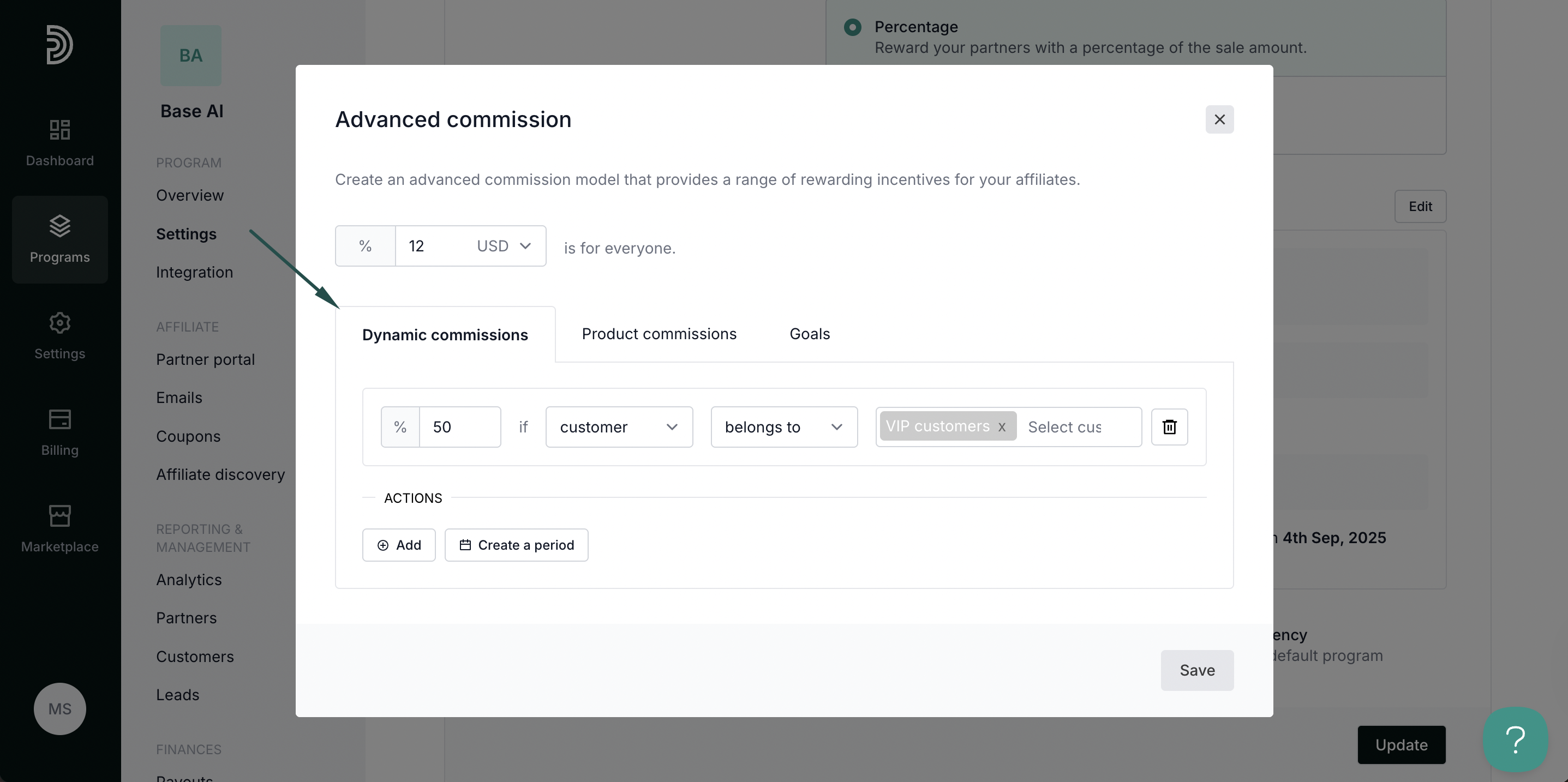 In the example below, we're offering 50% commission if a customer > belongs to >"VIP customers": - Click Save. You'll see the new condition displayed under the program commission settings: