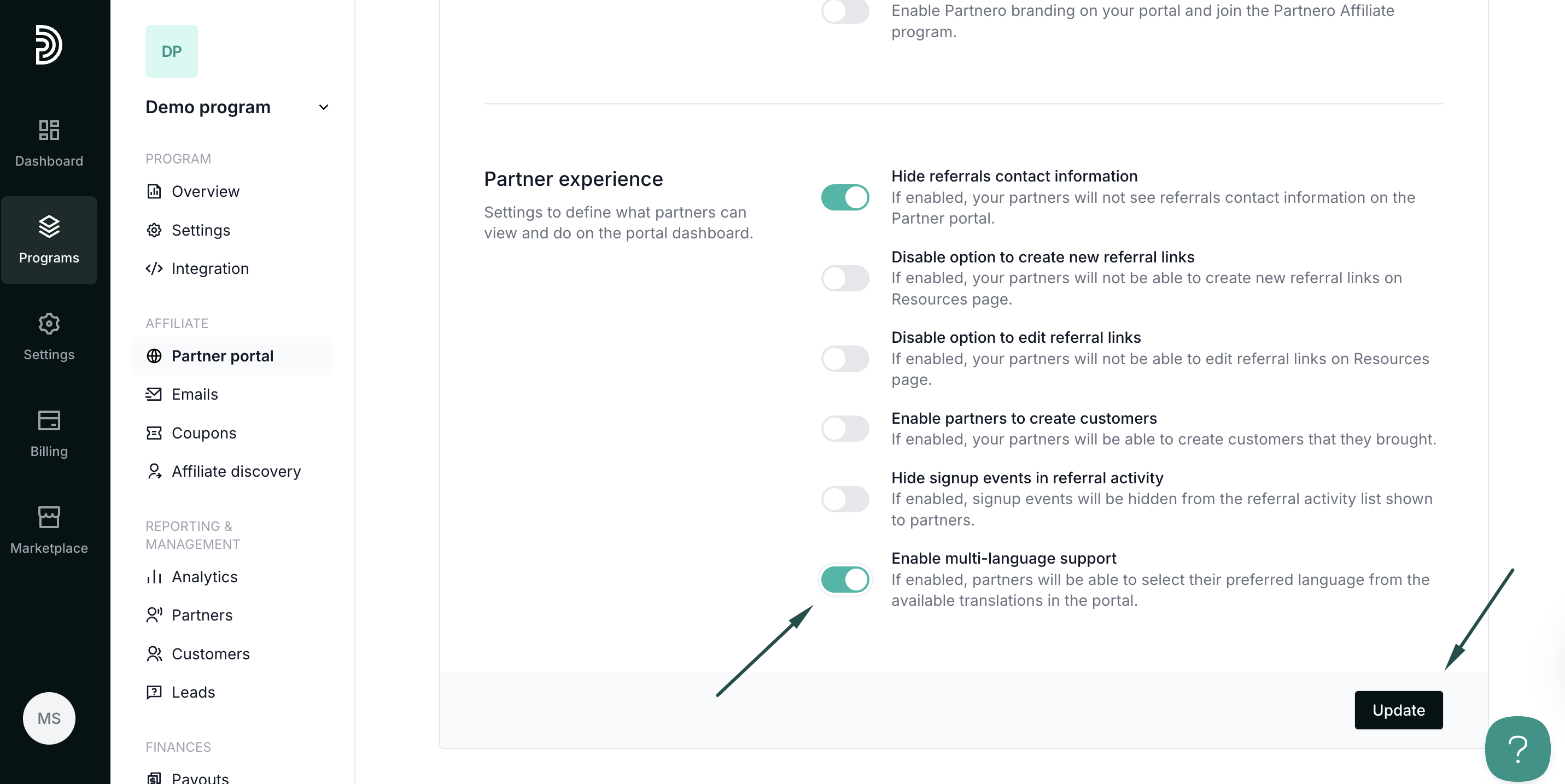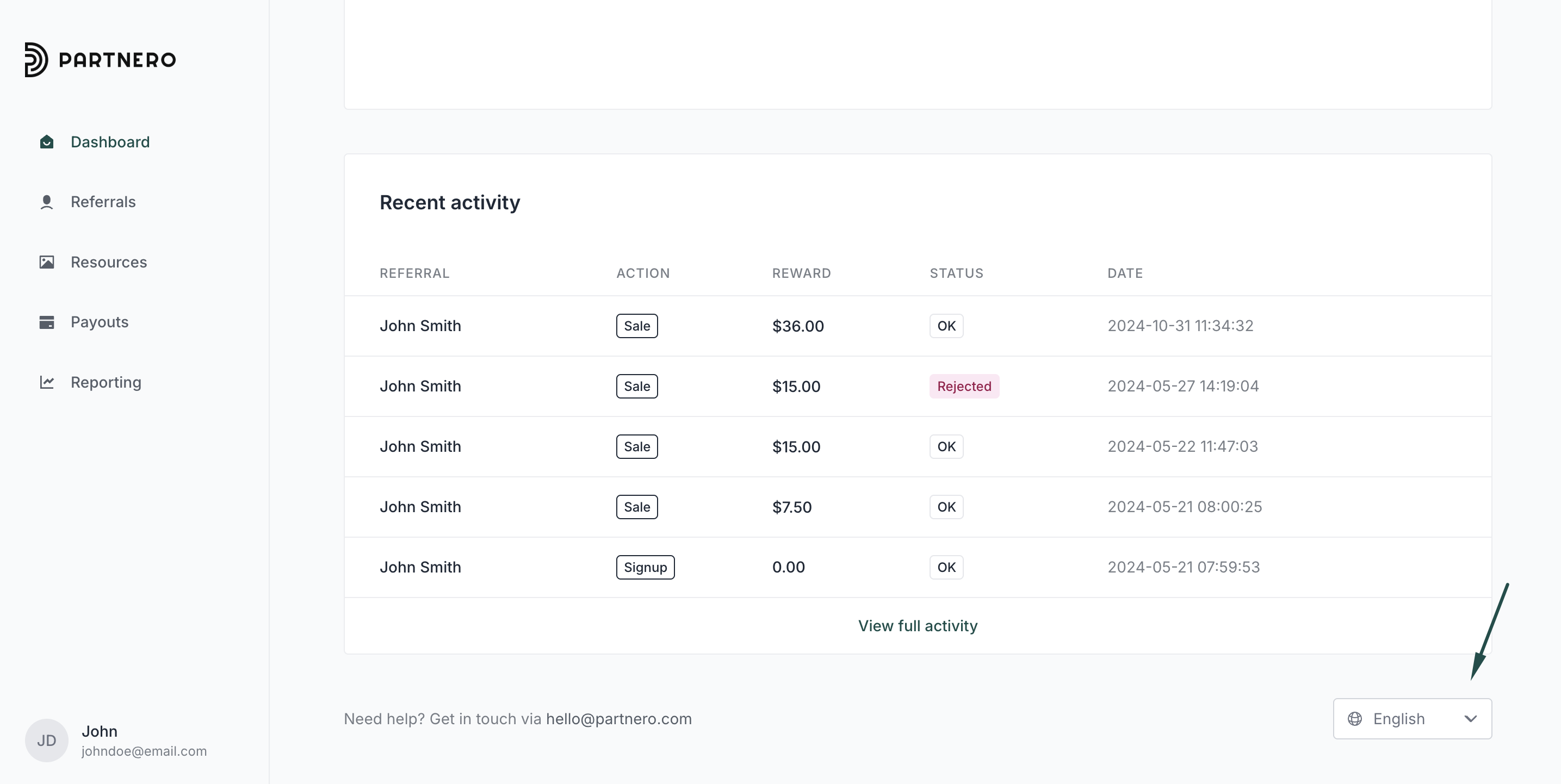 You can enable multi-language support for your affiliate and referral portals. When this feature is activated, partners can choose from the available language options when accessing the portal.