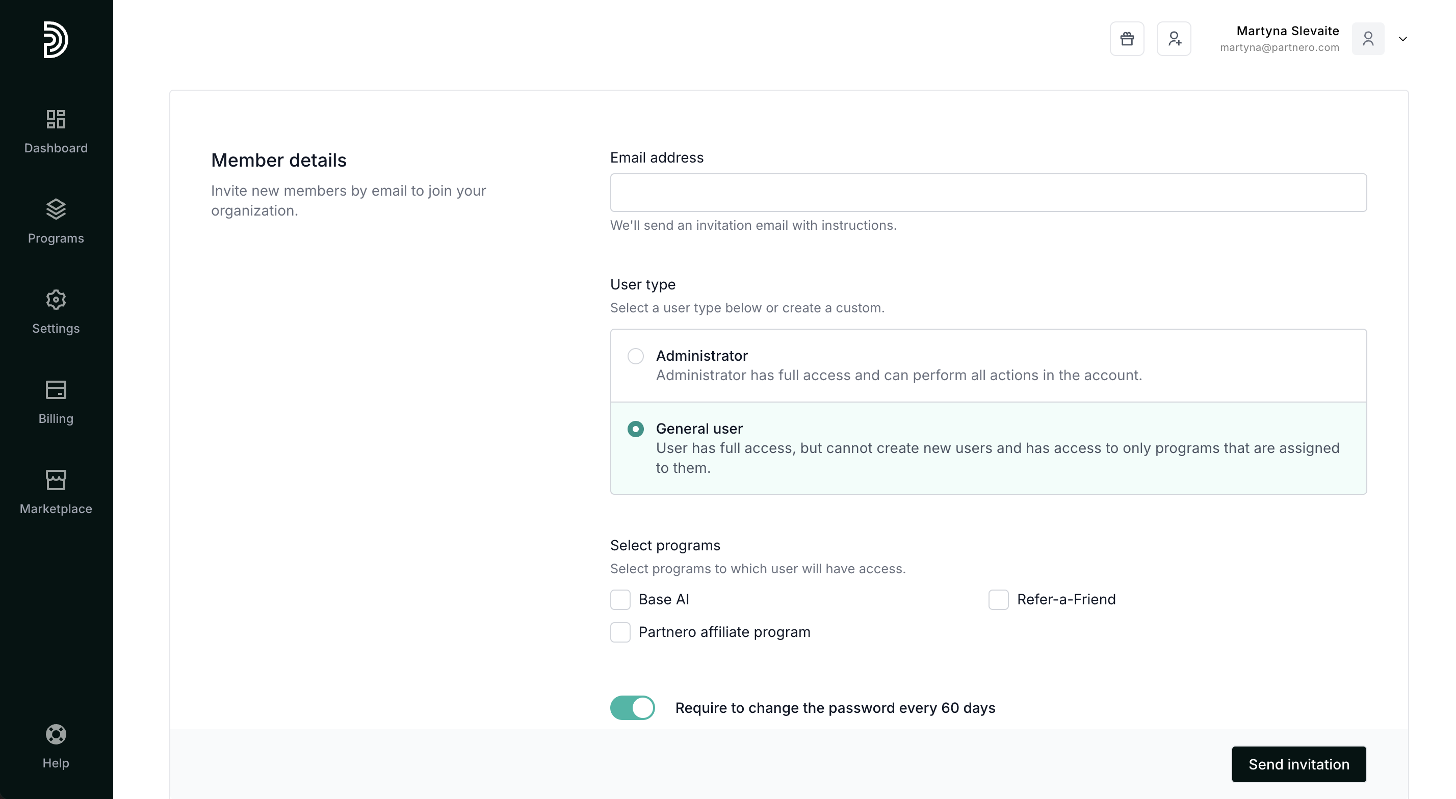 - In the Email address field, enter the user's email address to add to your account. Select the user type (Admin or General) and select which programs this user should access: