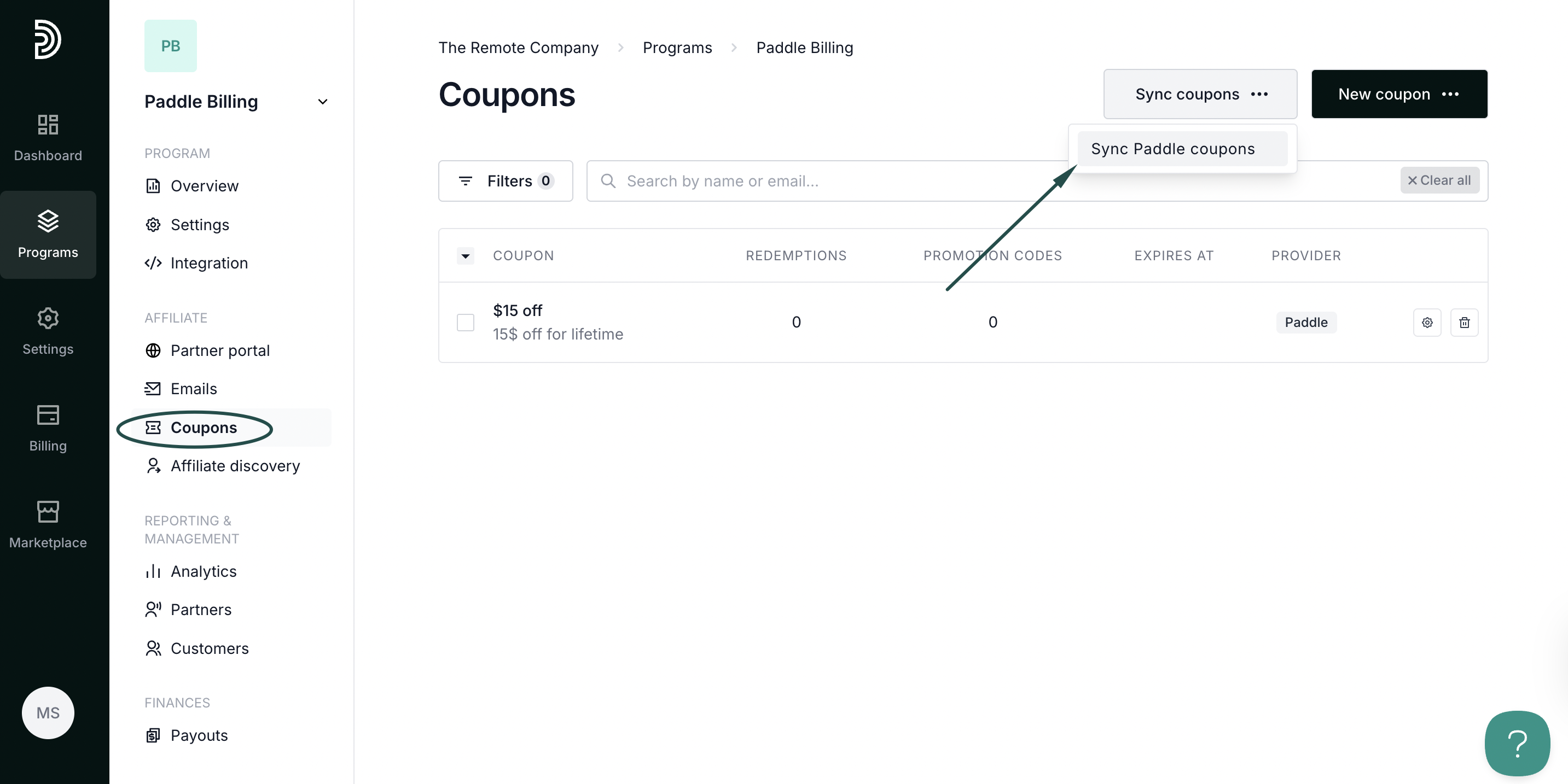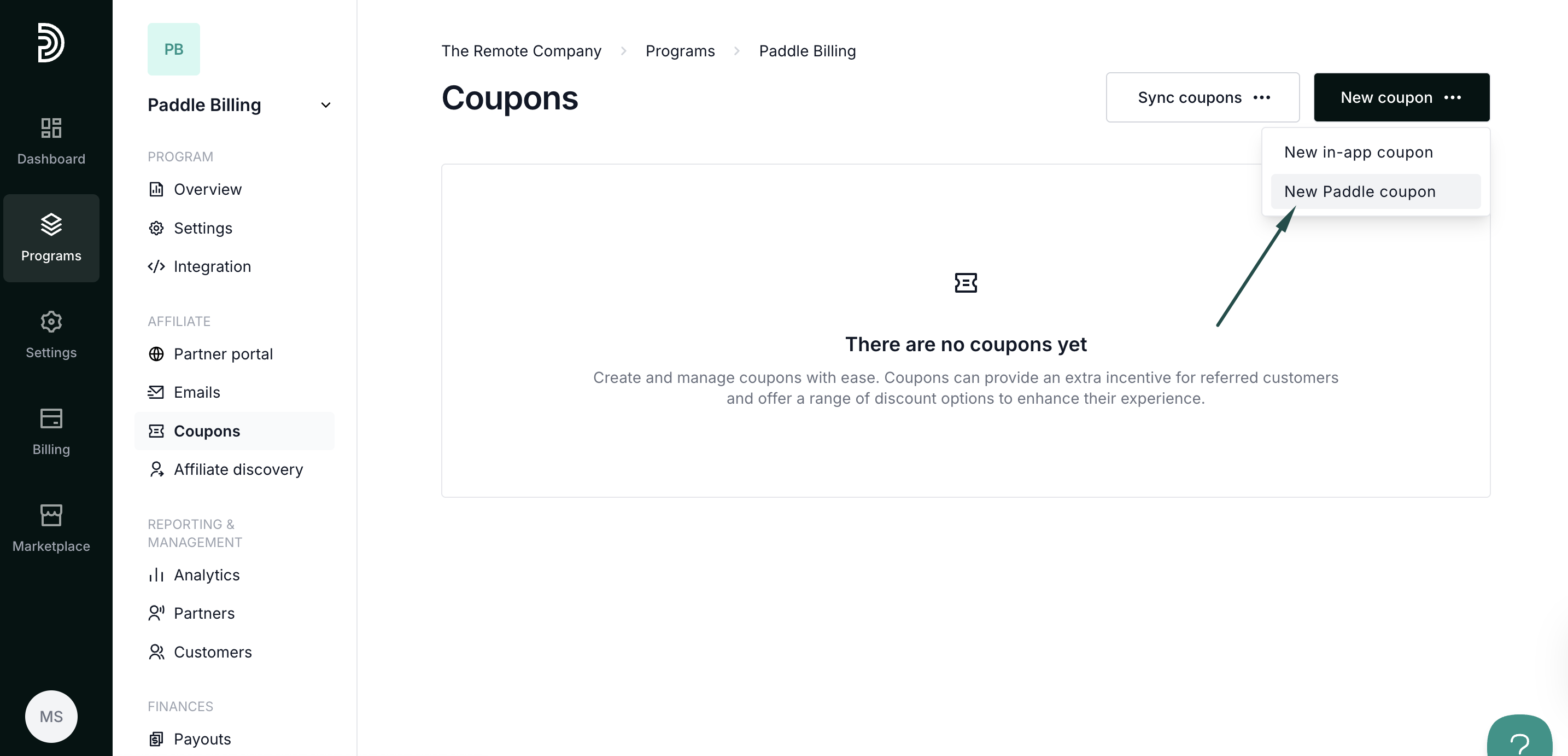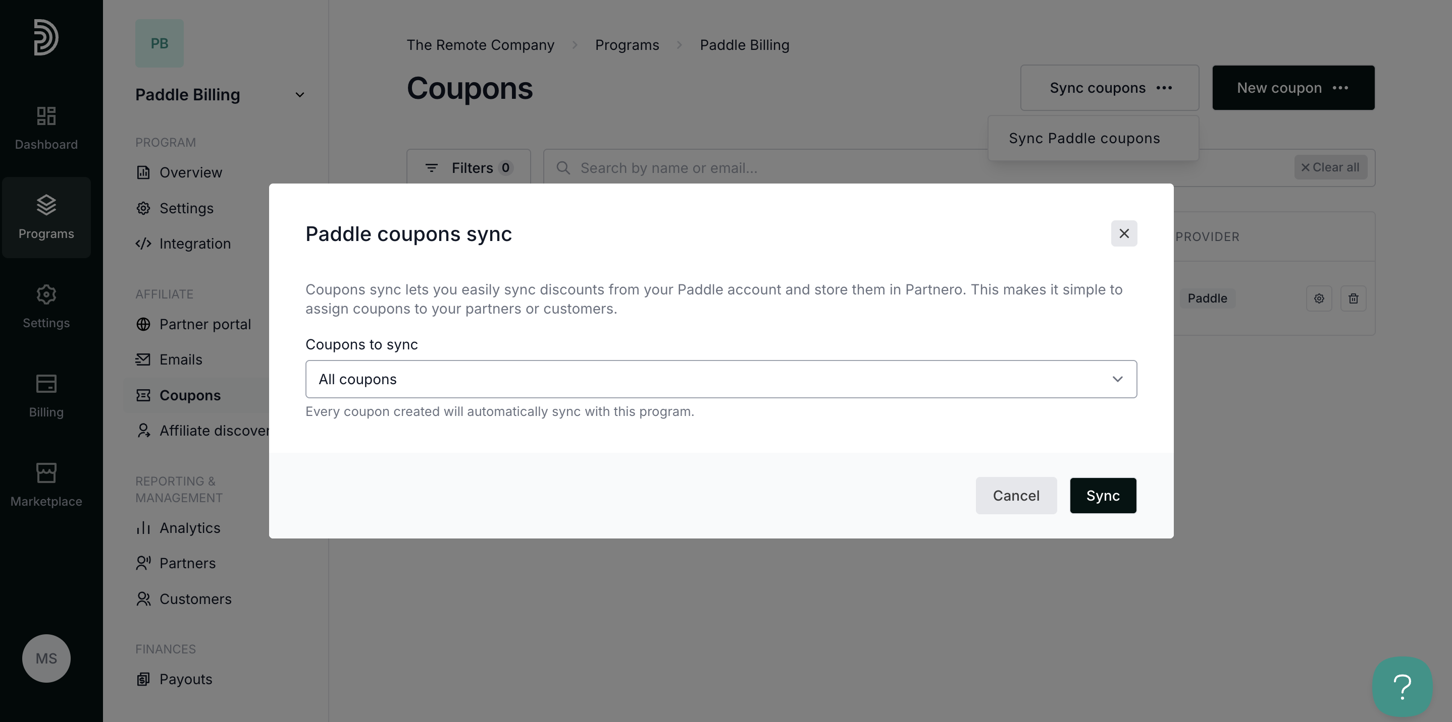 If you already have coupons on Paddle, you can sync them with Partnero: