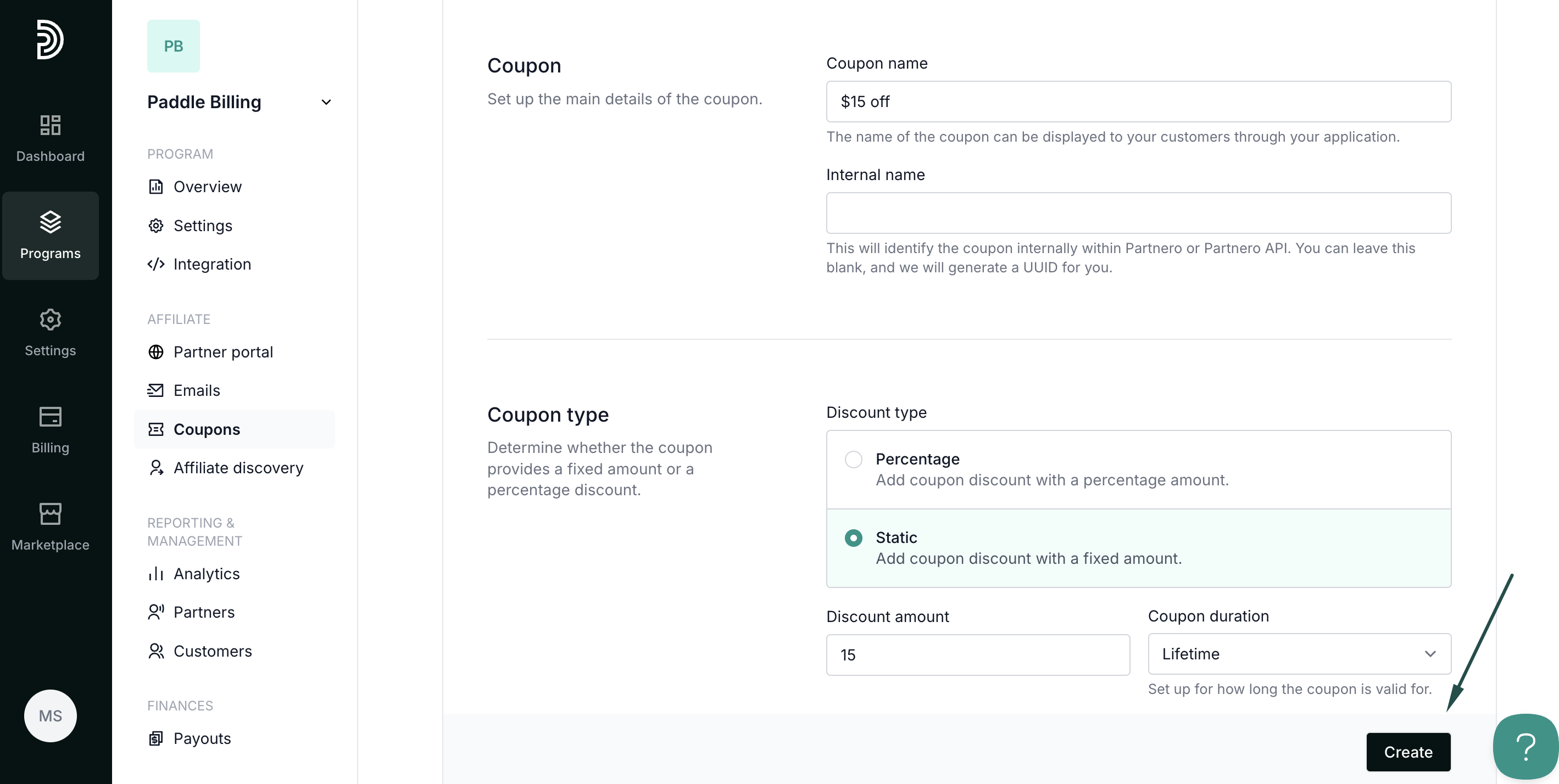 This option allows you to create new coupon codes directly on Partnero. After creating the codes, they are automatically synced with your Paddle account.