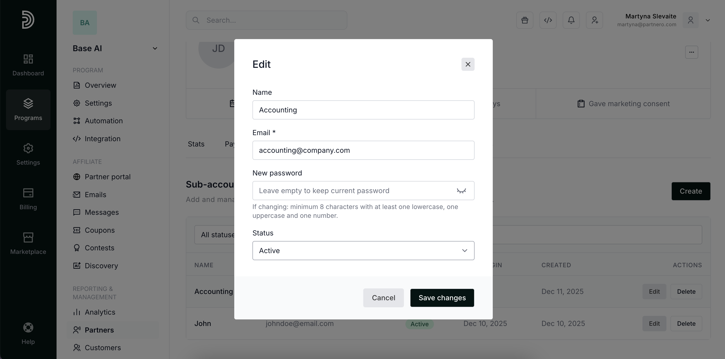Partner sub-accounts allow affiliate partners to create and manage additional users within their organization, giving team members role-based access to the Partner Portal.