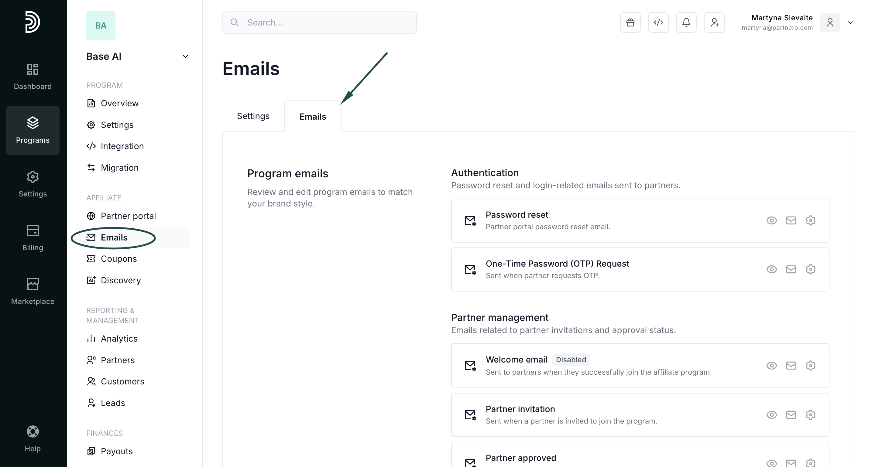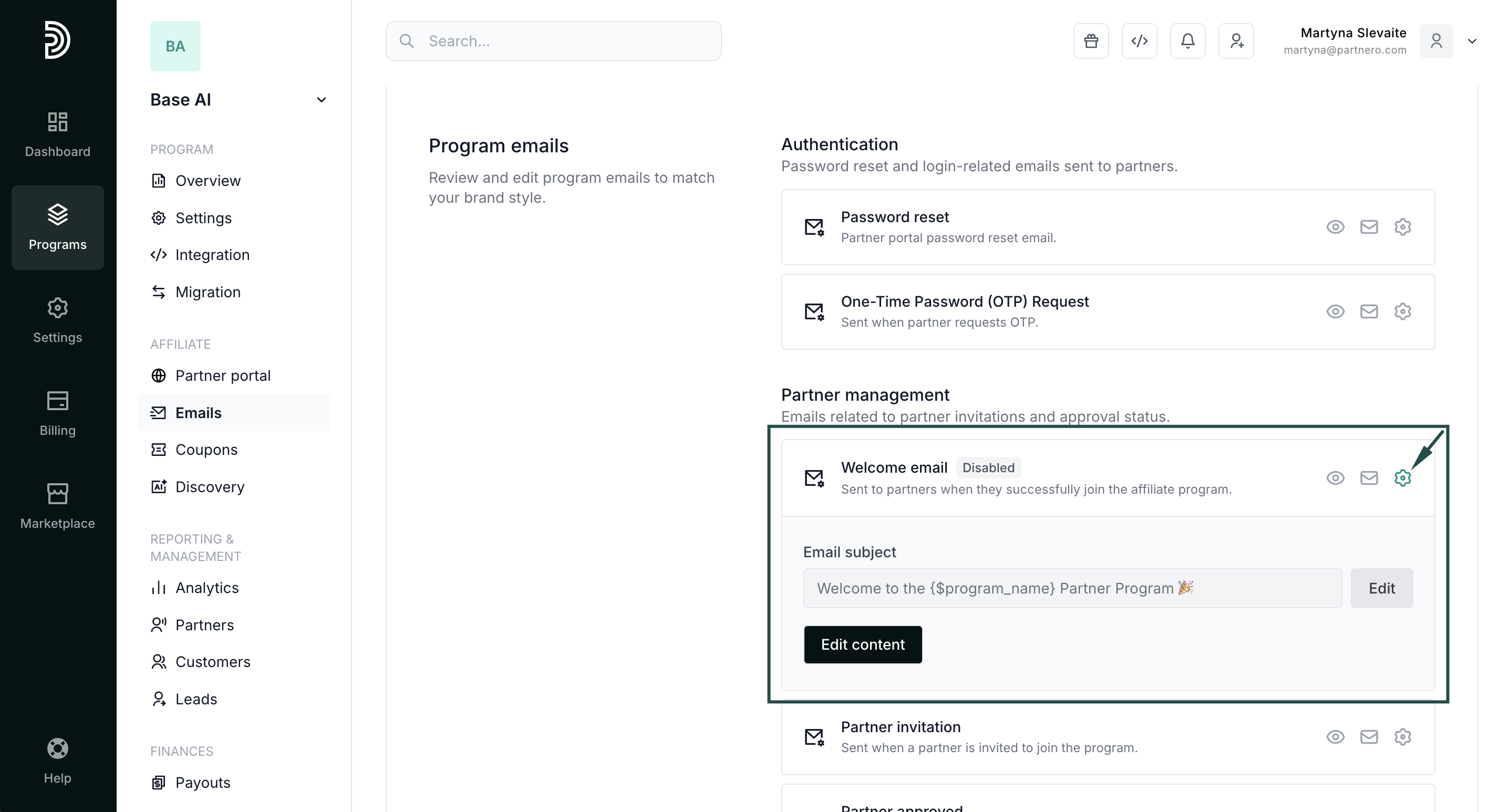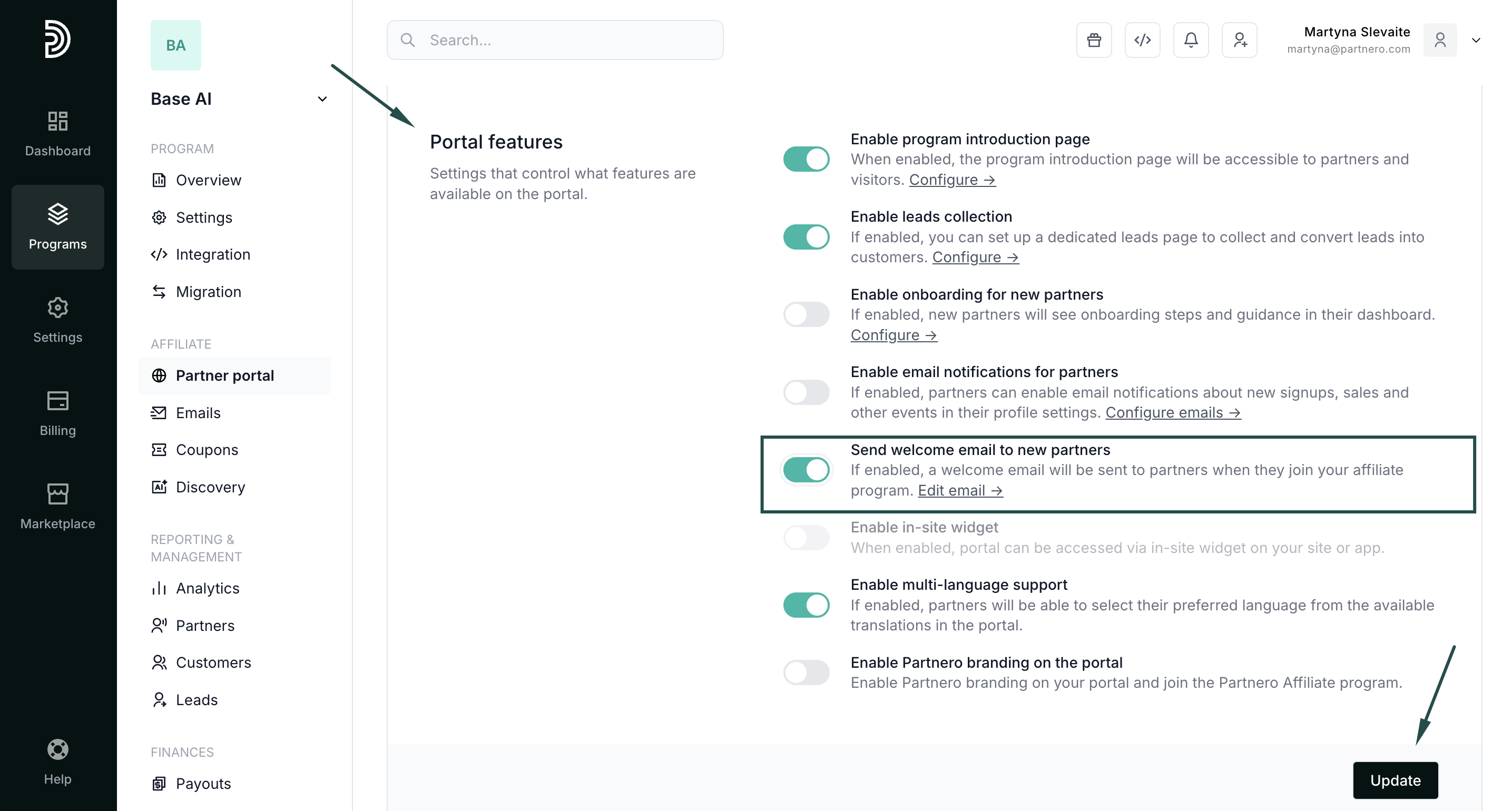 To start sending welcome emails to new partners, you must enable it in the Partner Portal settings: