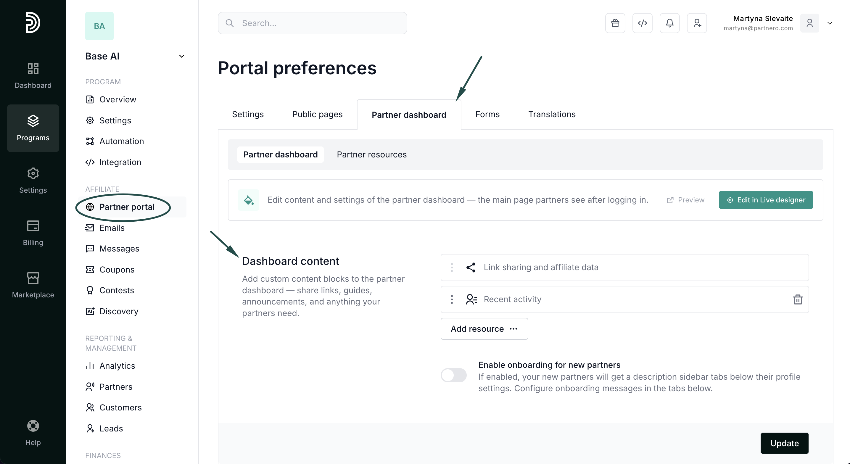- Open the Partner dashboard tab: