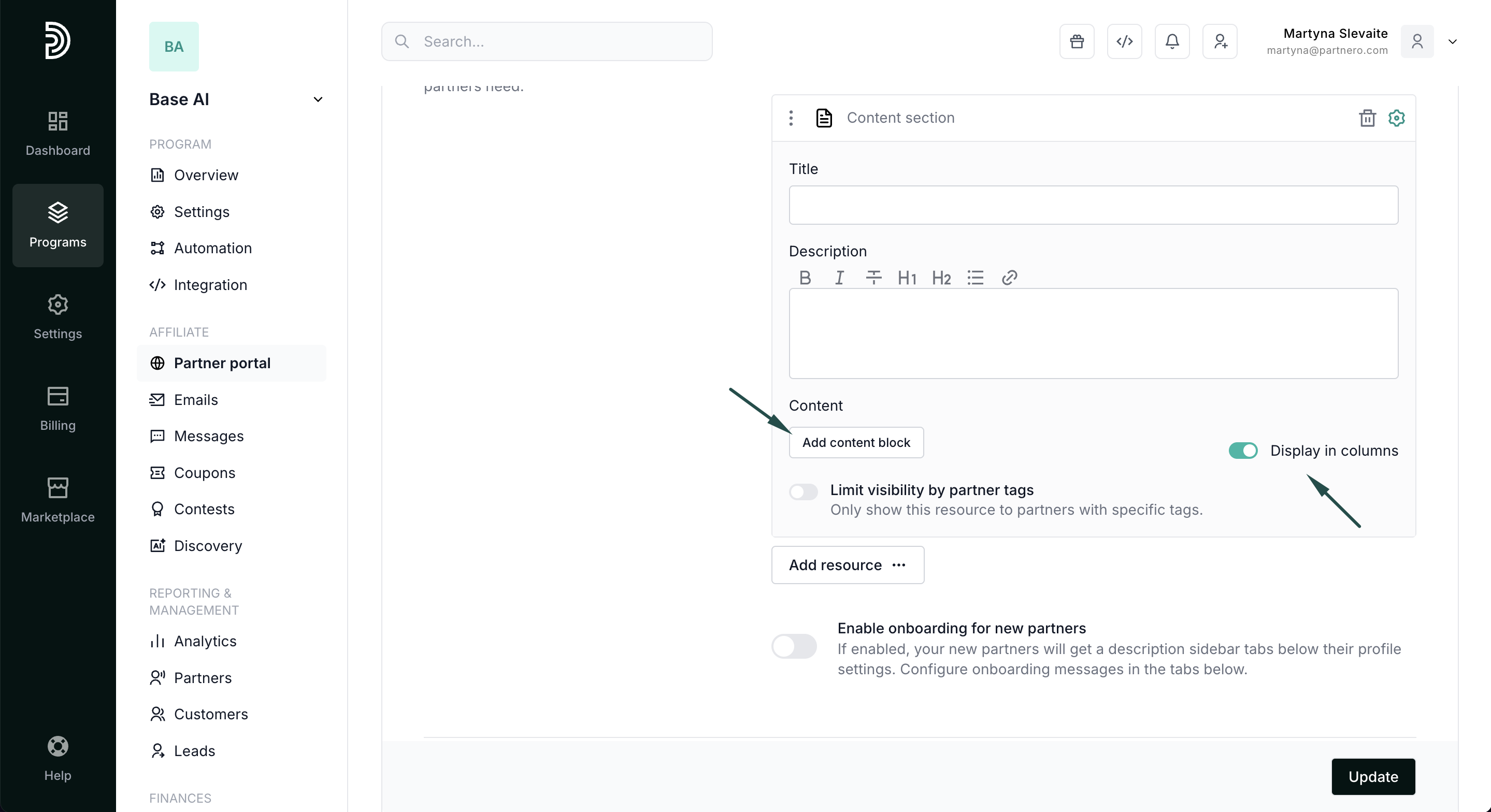 - Click Add content block under Content and toggle Display blocks in columns: