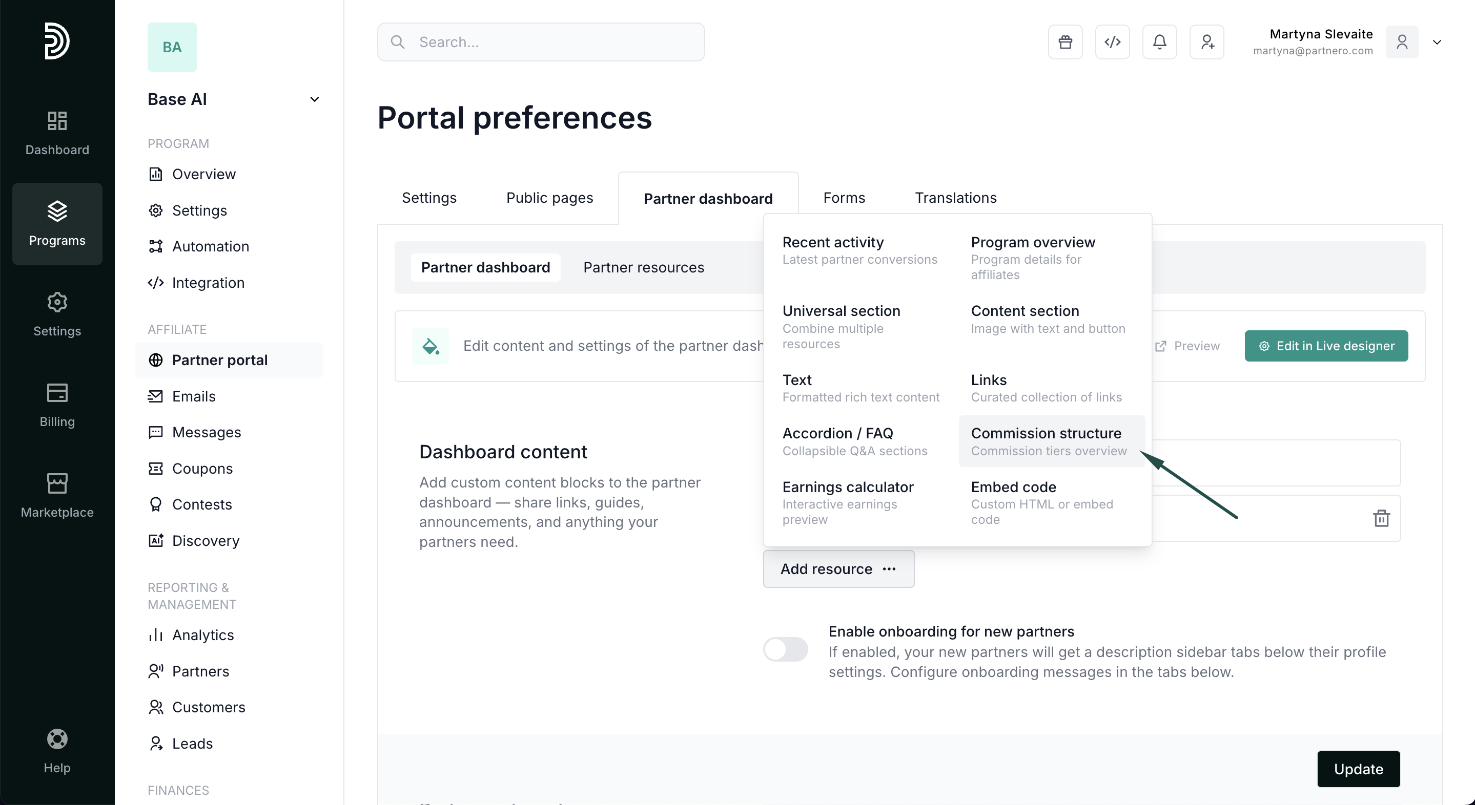 - Navigate to the Partner dashboard page and click to Add resource. Select Commission structure: