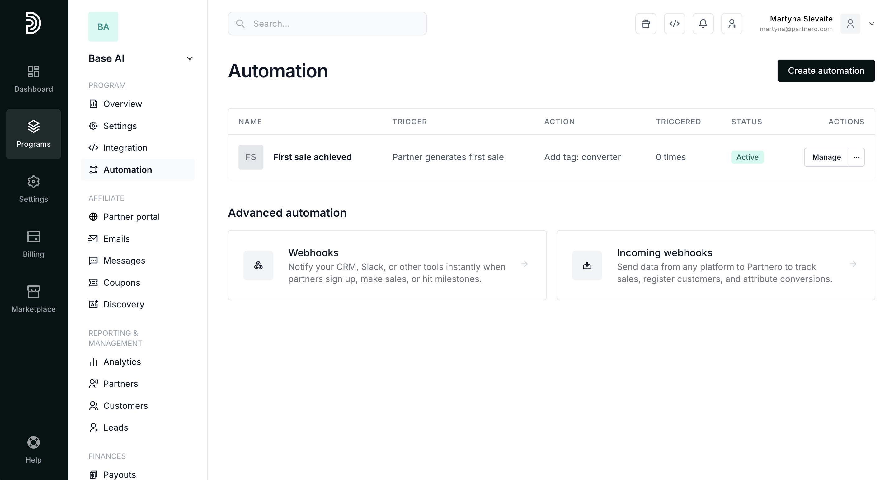 | Partner generates first sale | Fires when partner's referral makes first purchase |