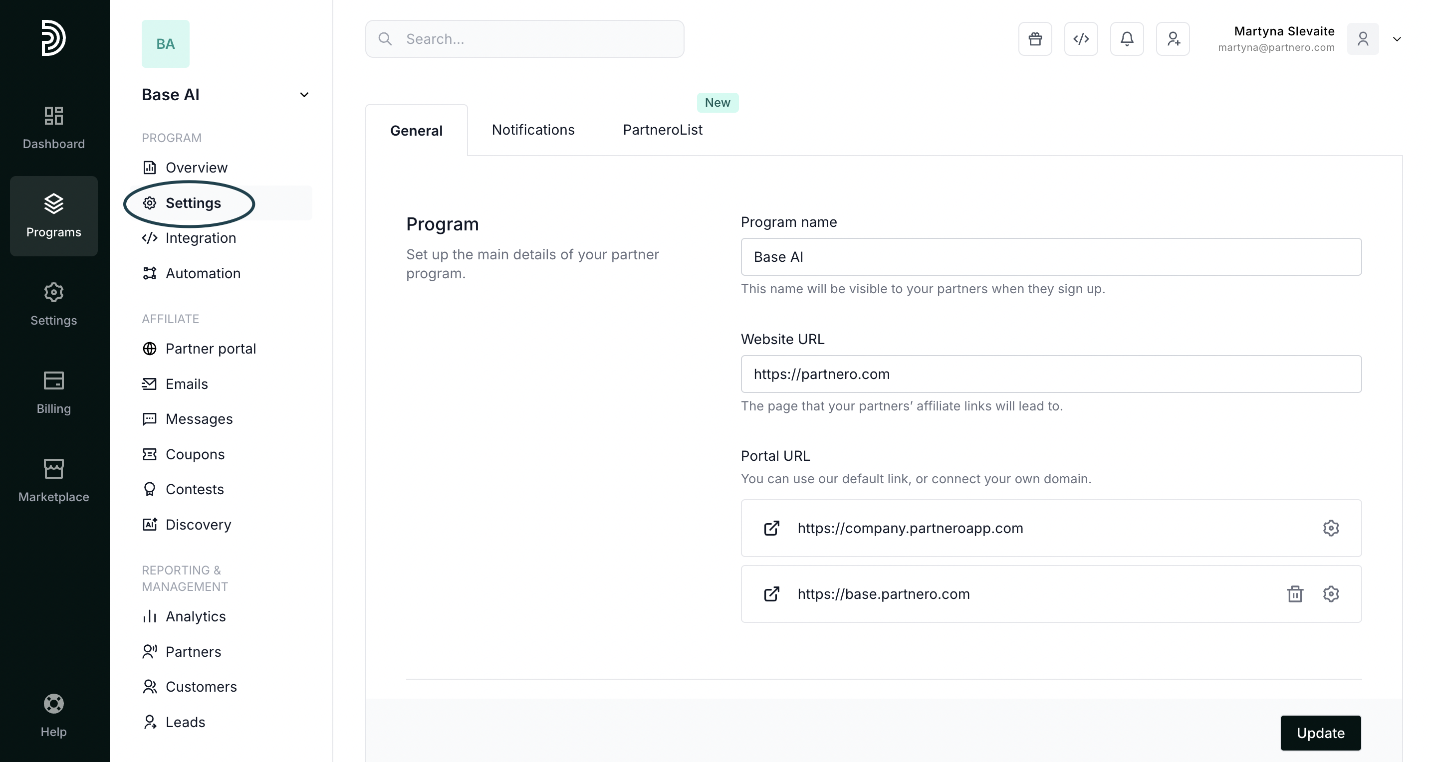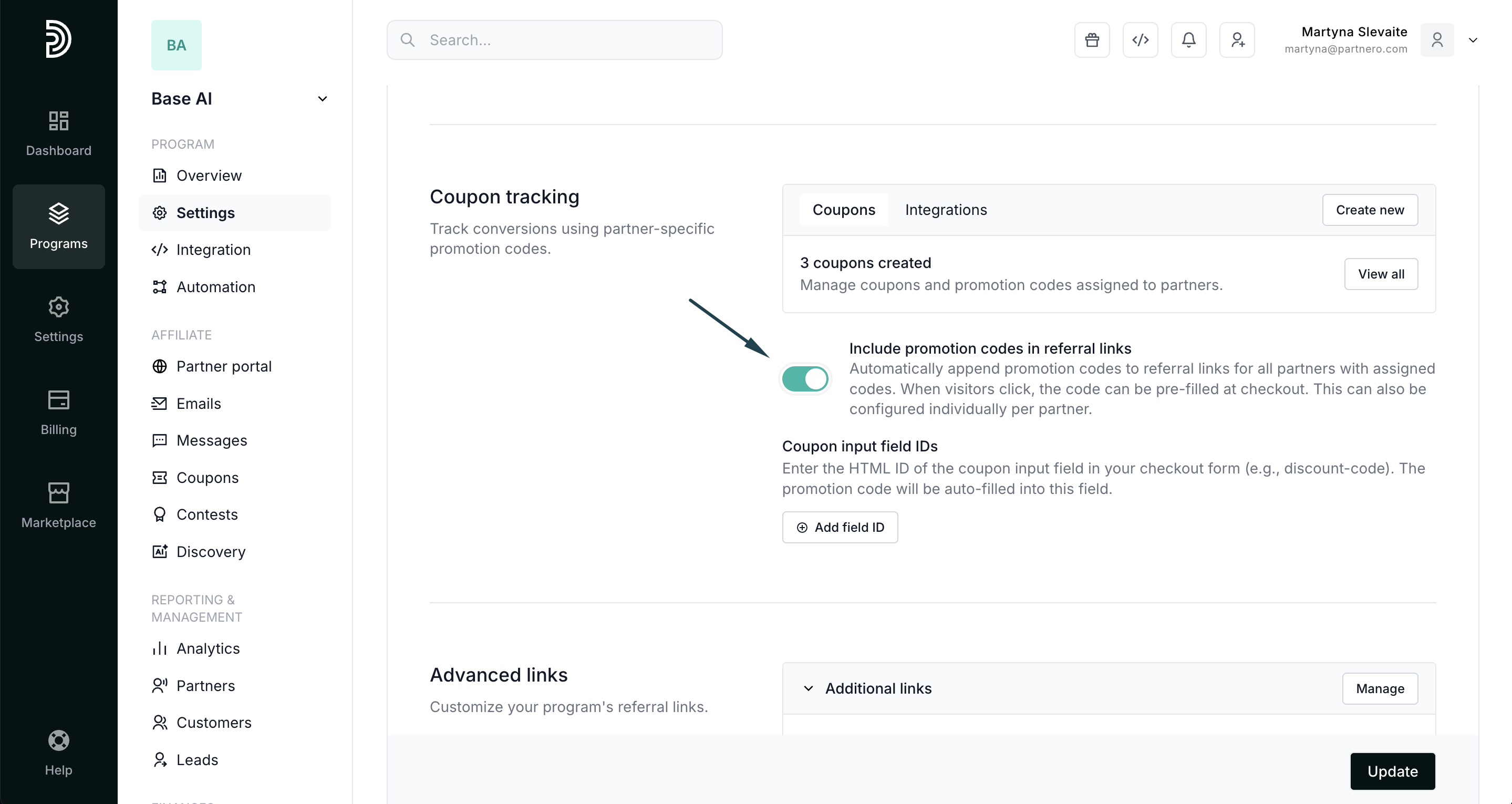 When enabled, this setting automatically appends the partner's promotion code to all their referral links. For example: