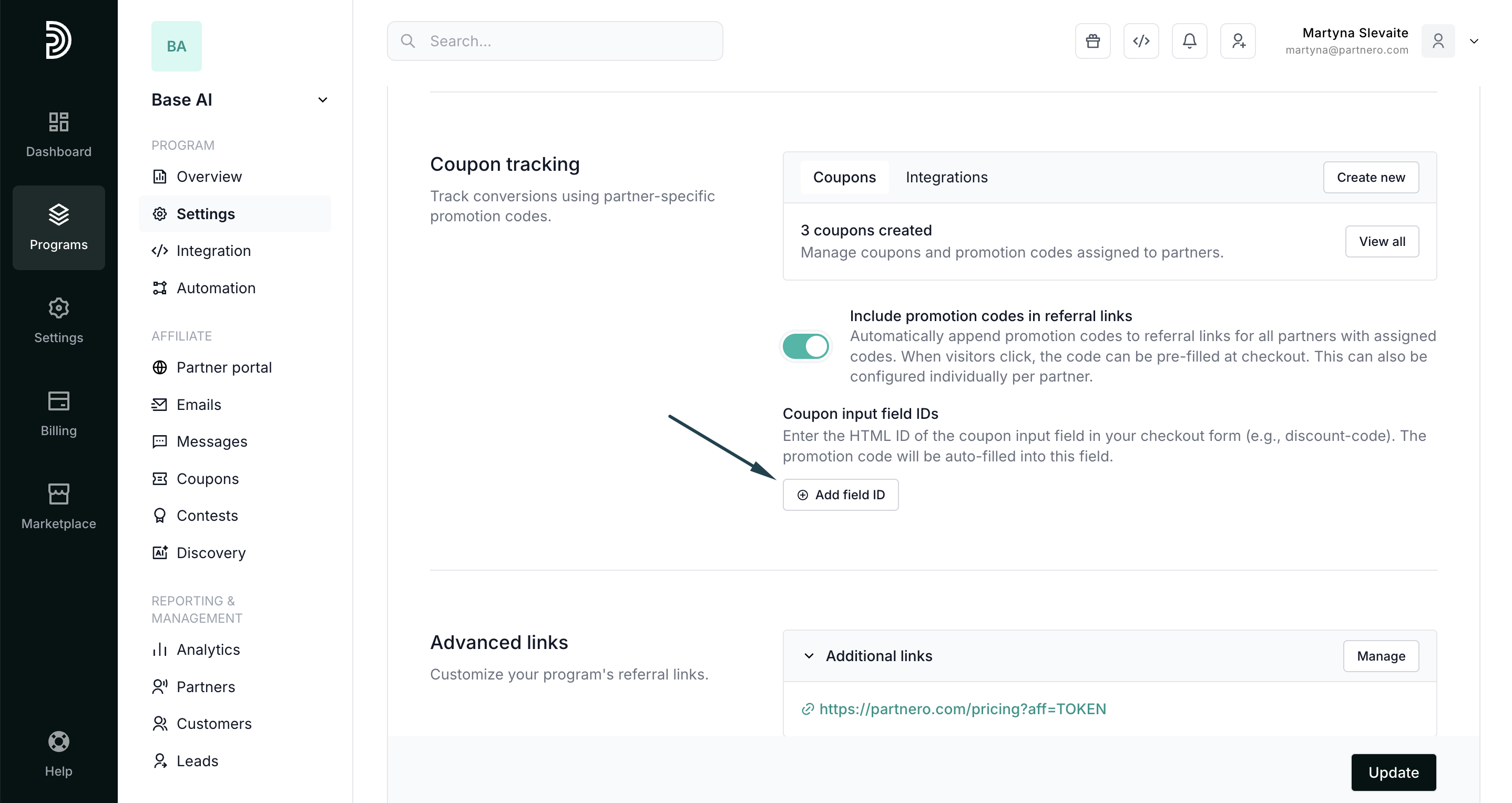 Auto-apply allows promotion codes to be automatically included in your partners' referral links. When a visitor clicks a referral link, the promotion code is passed to your website and can be automatically pre-filled in the coupon input field at checkout, creating a seamless discount experience for customers.