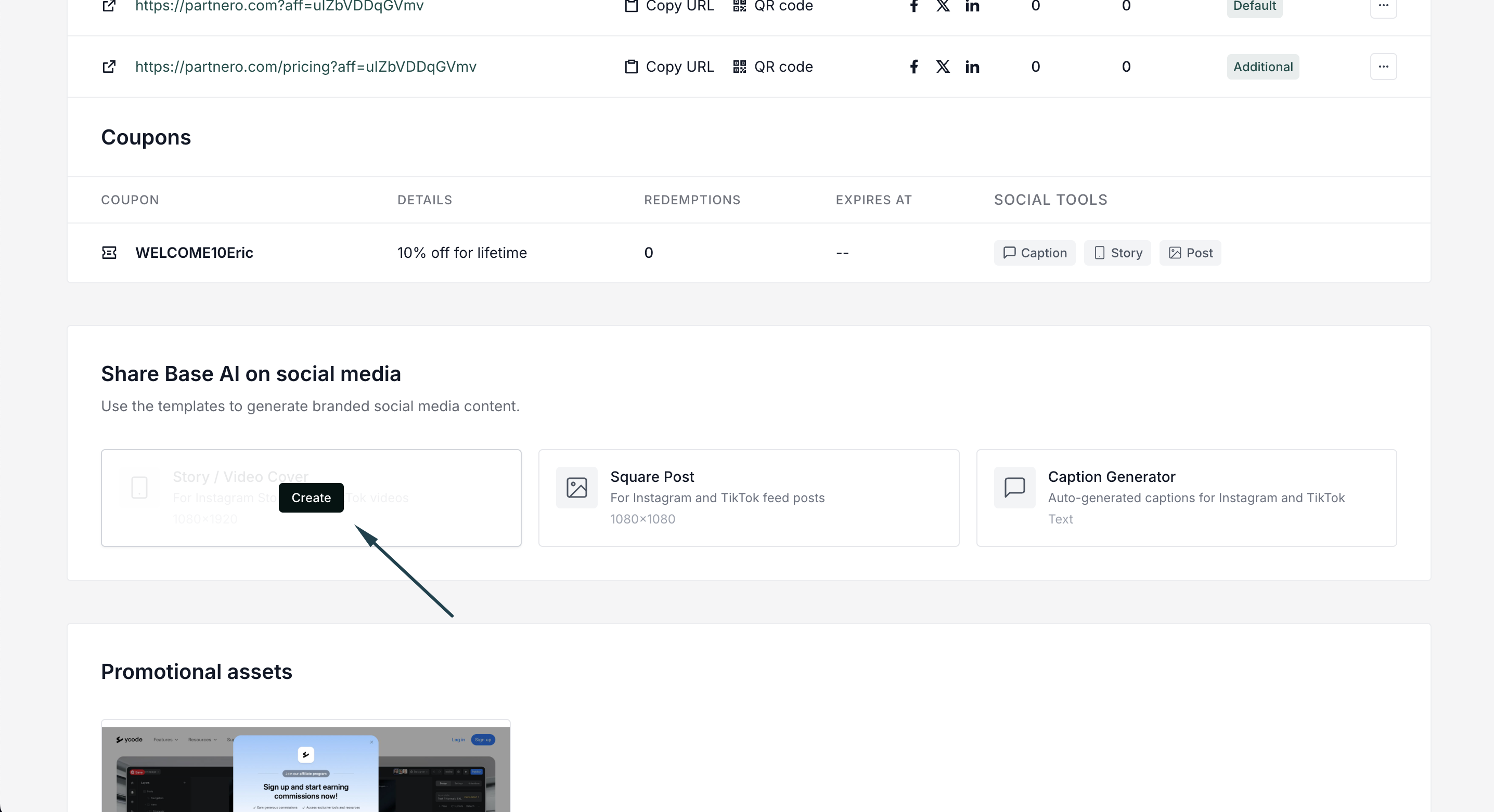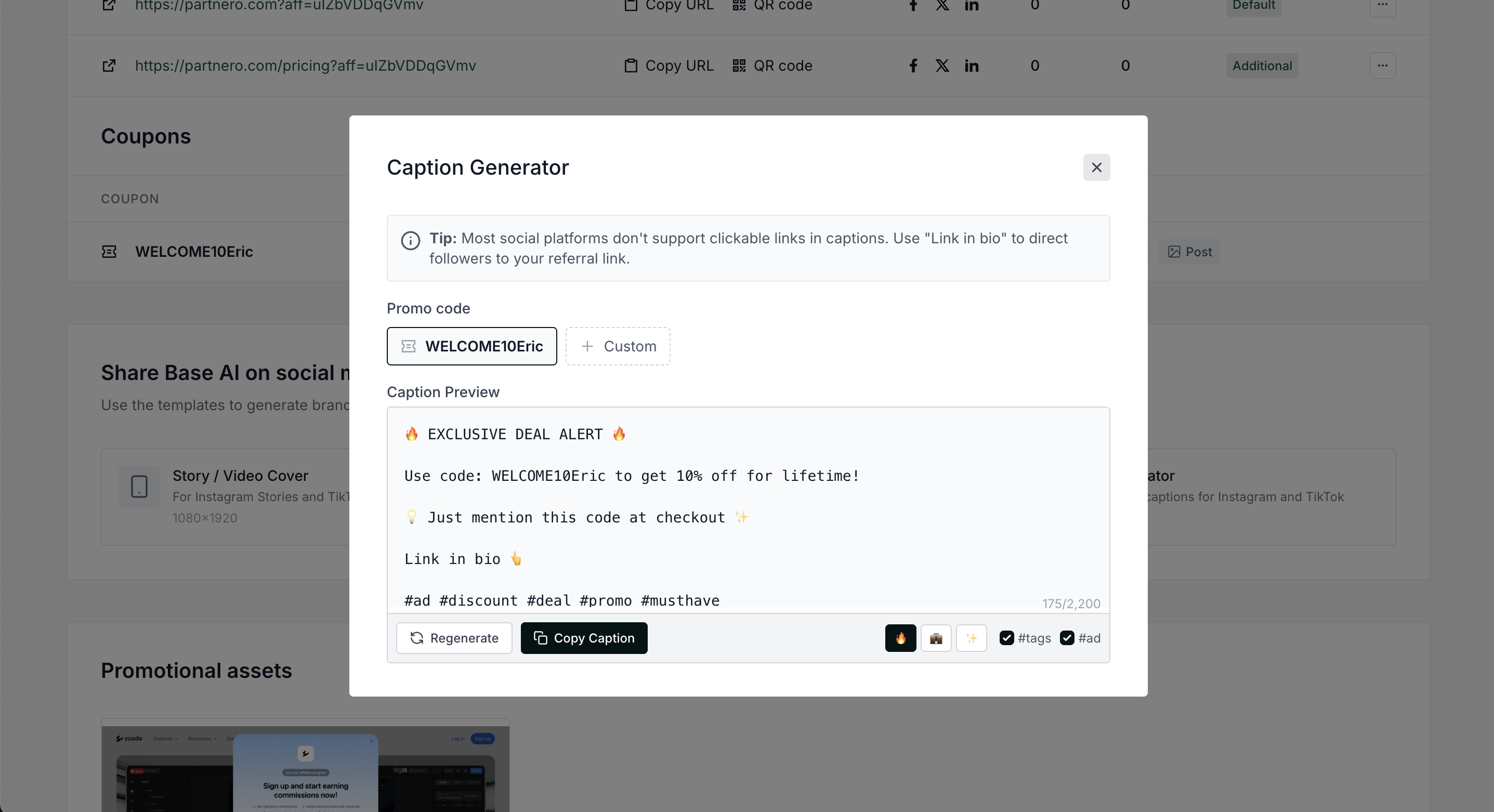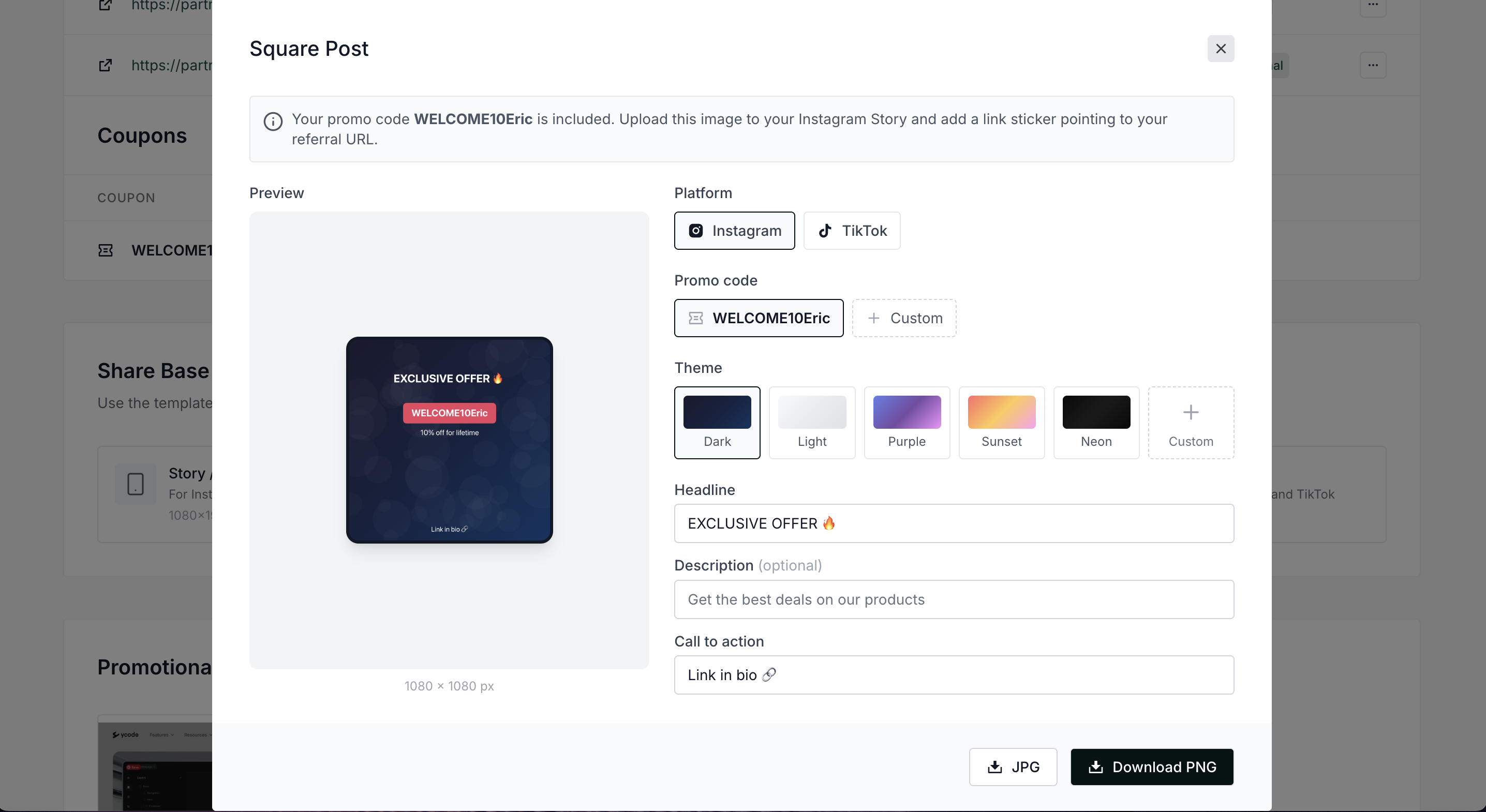 Partners will see ready-to-use templates for Instagram and TikTok that automatically include their promo codes and referral links: