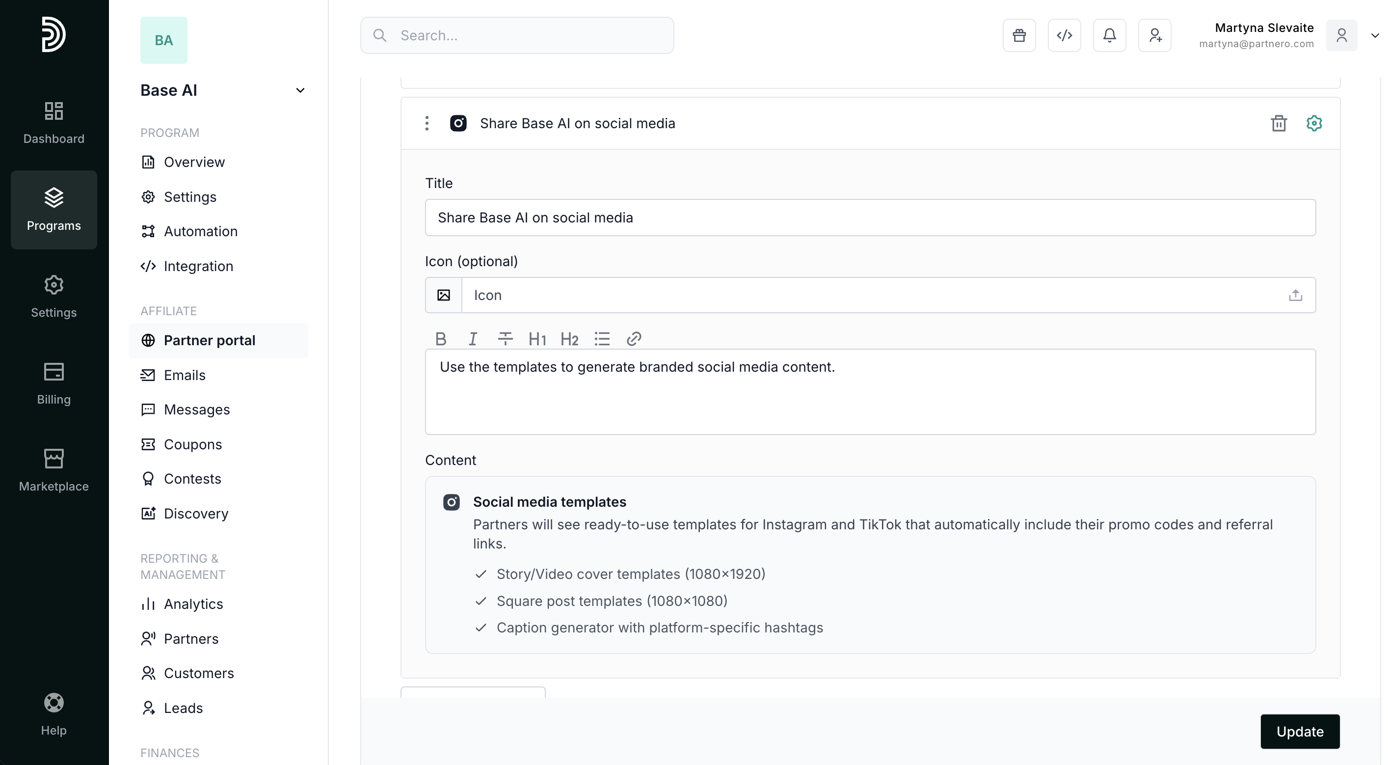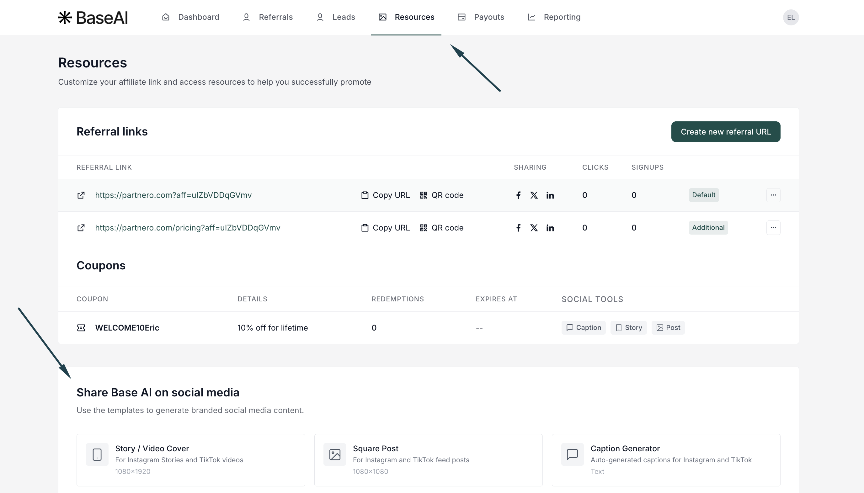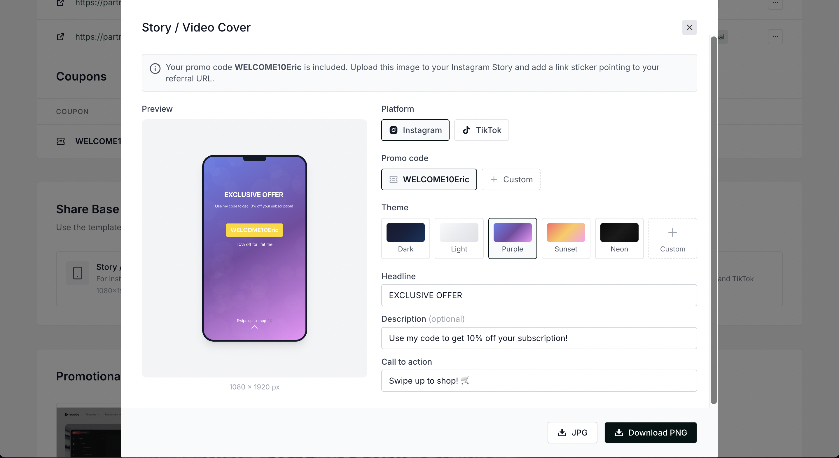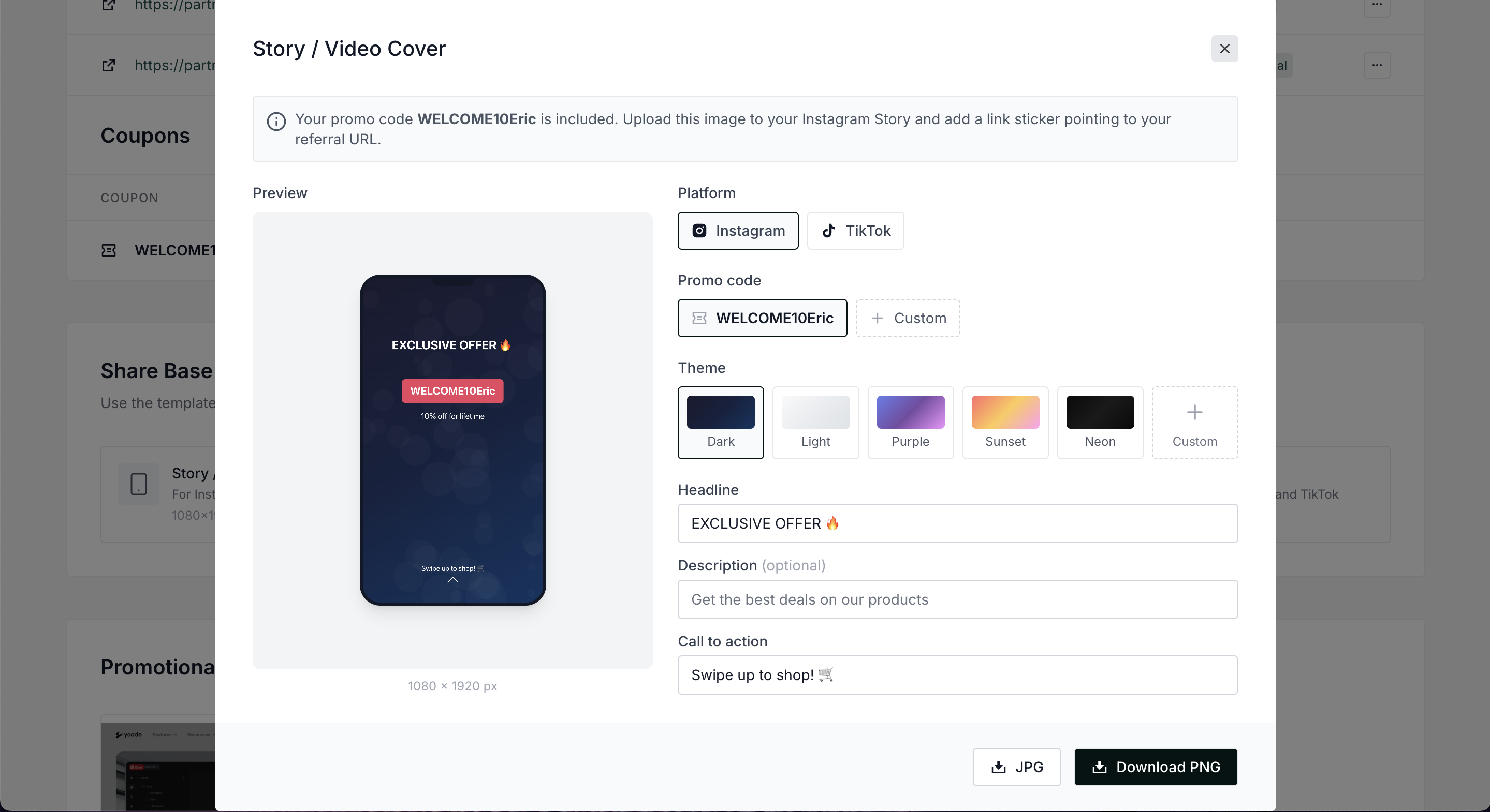 Partners will see ready-to-use templates for Instagram and TikTok that automatically include their promo codes and referral links: