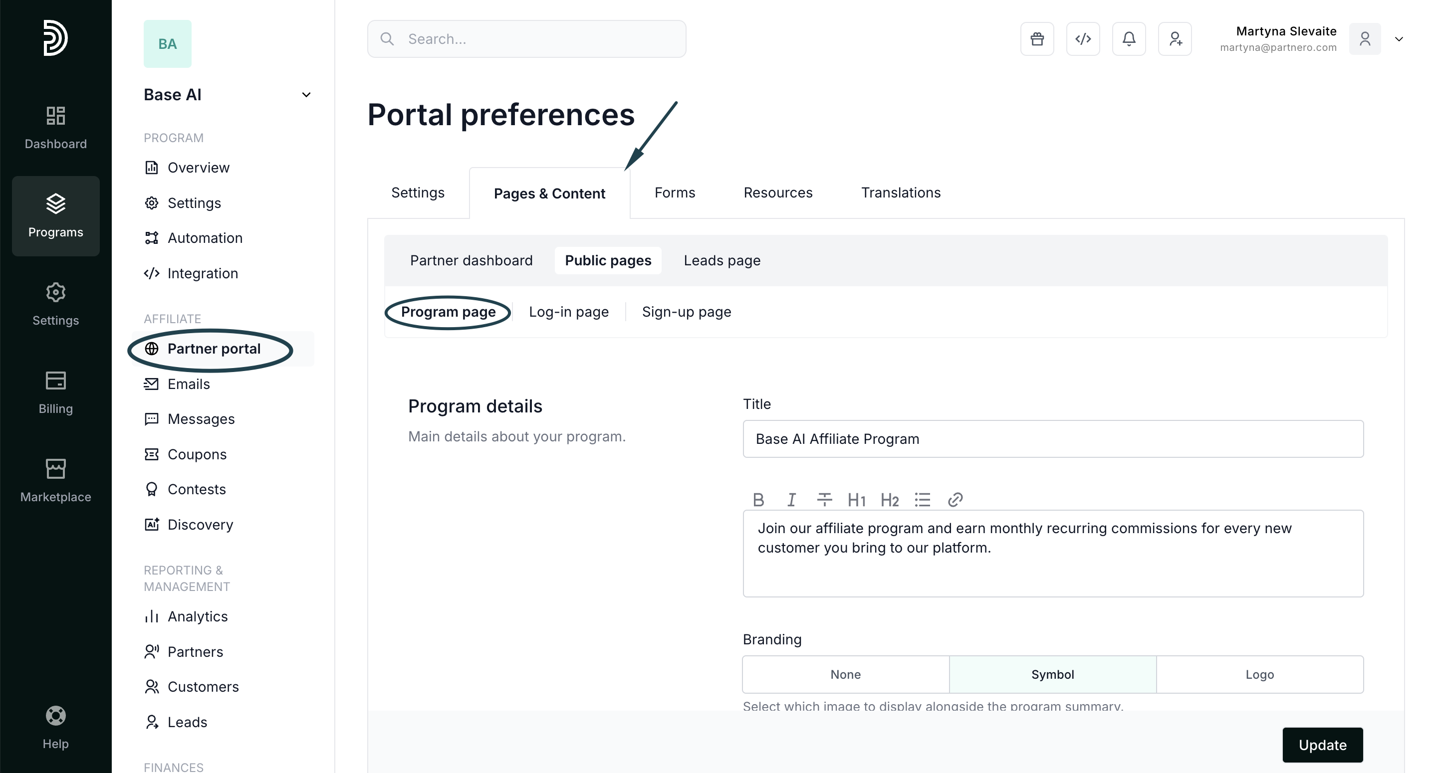 - Go to Partner portal → Pages & Content tab → Program page: