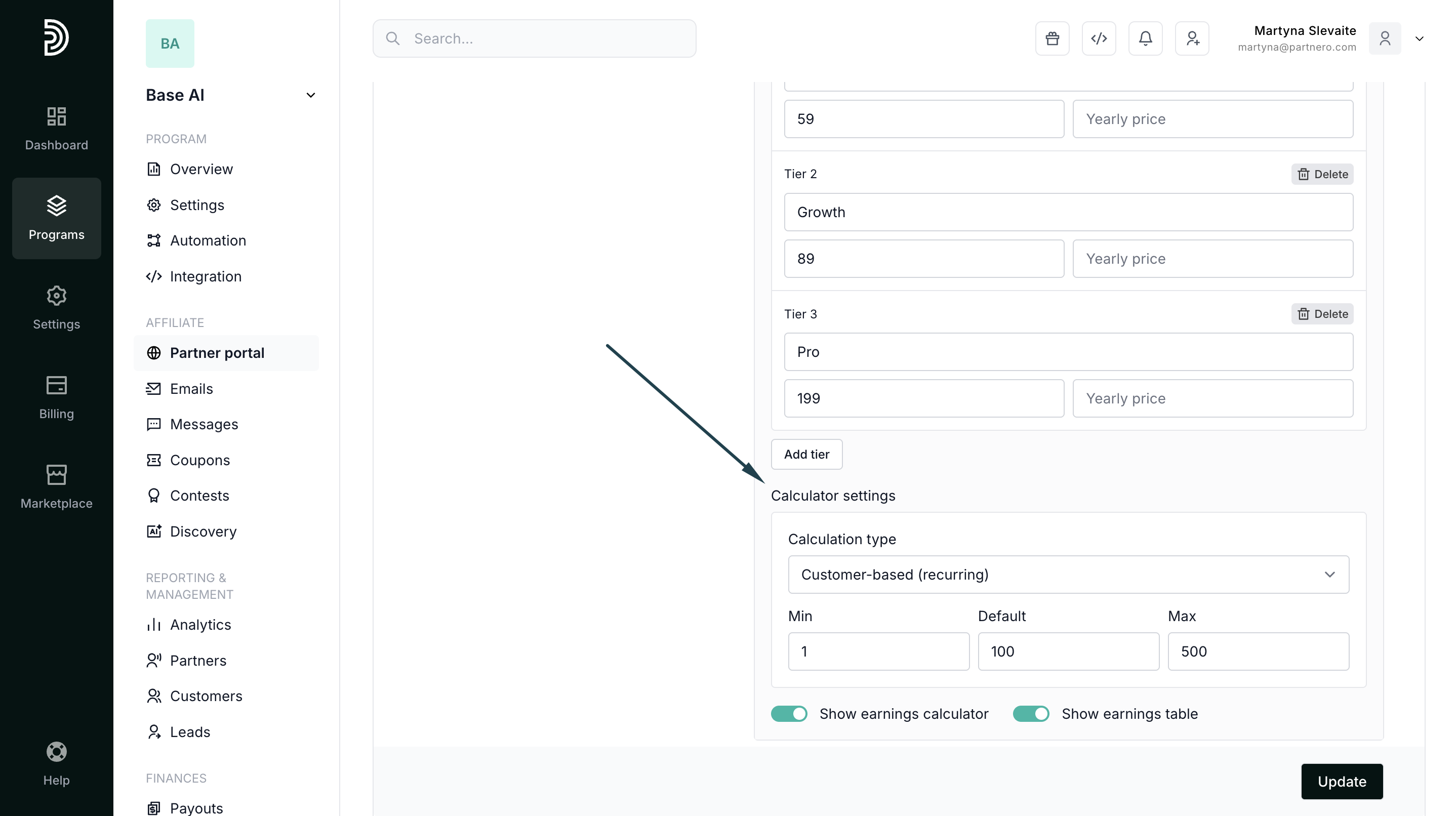 Configure your pricing tiers and commission calculation options: