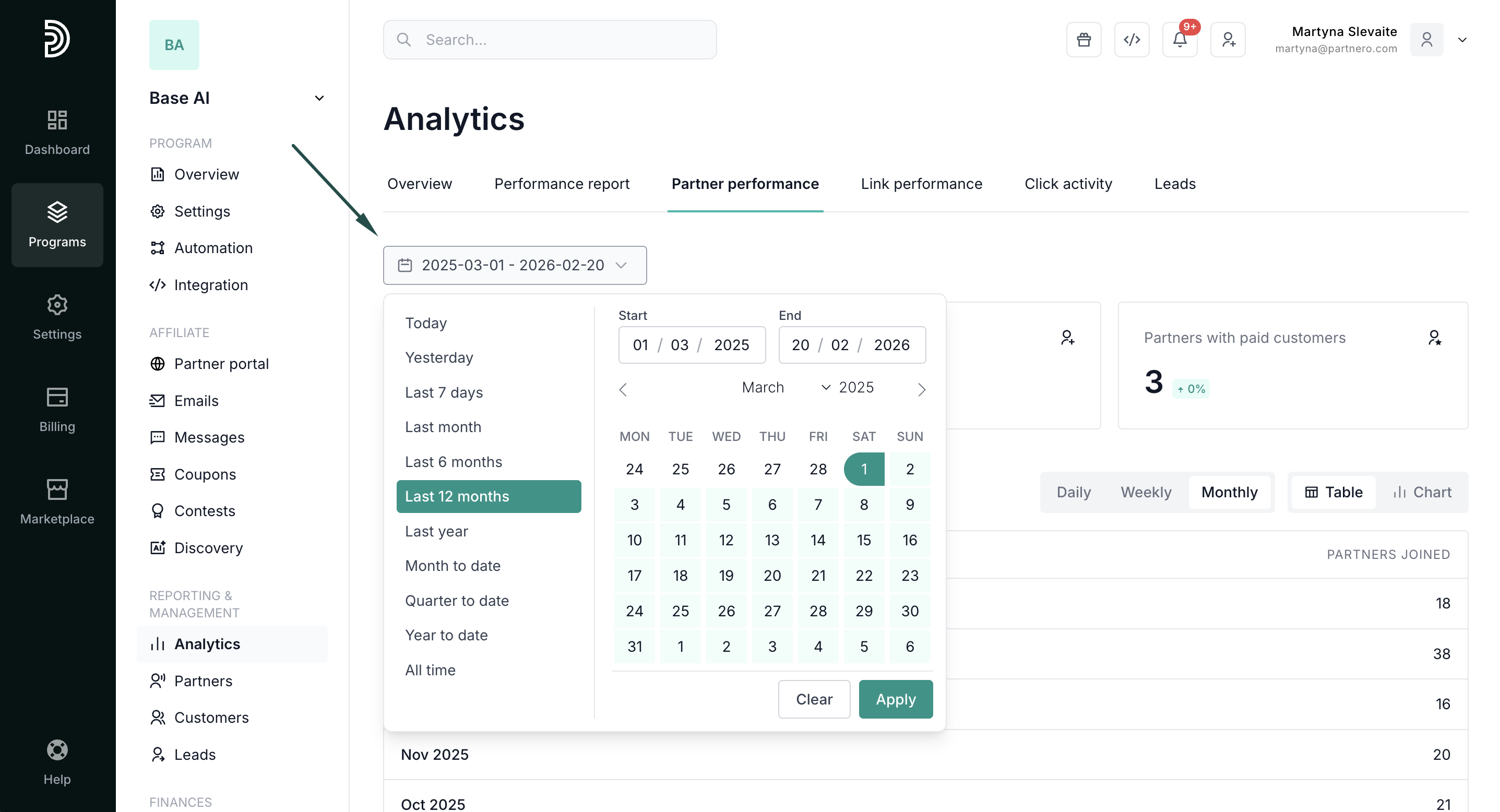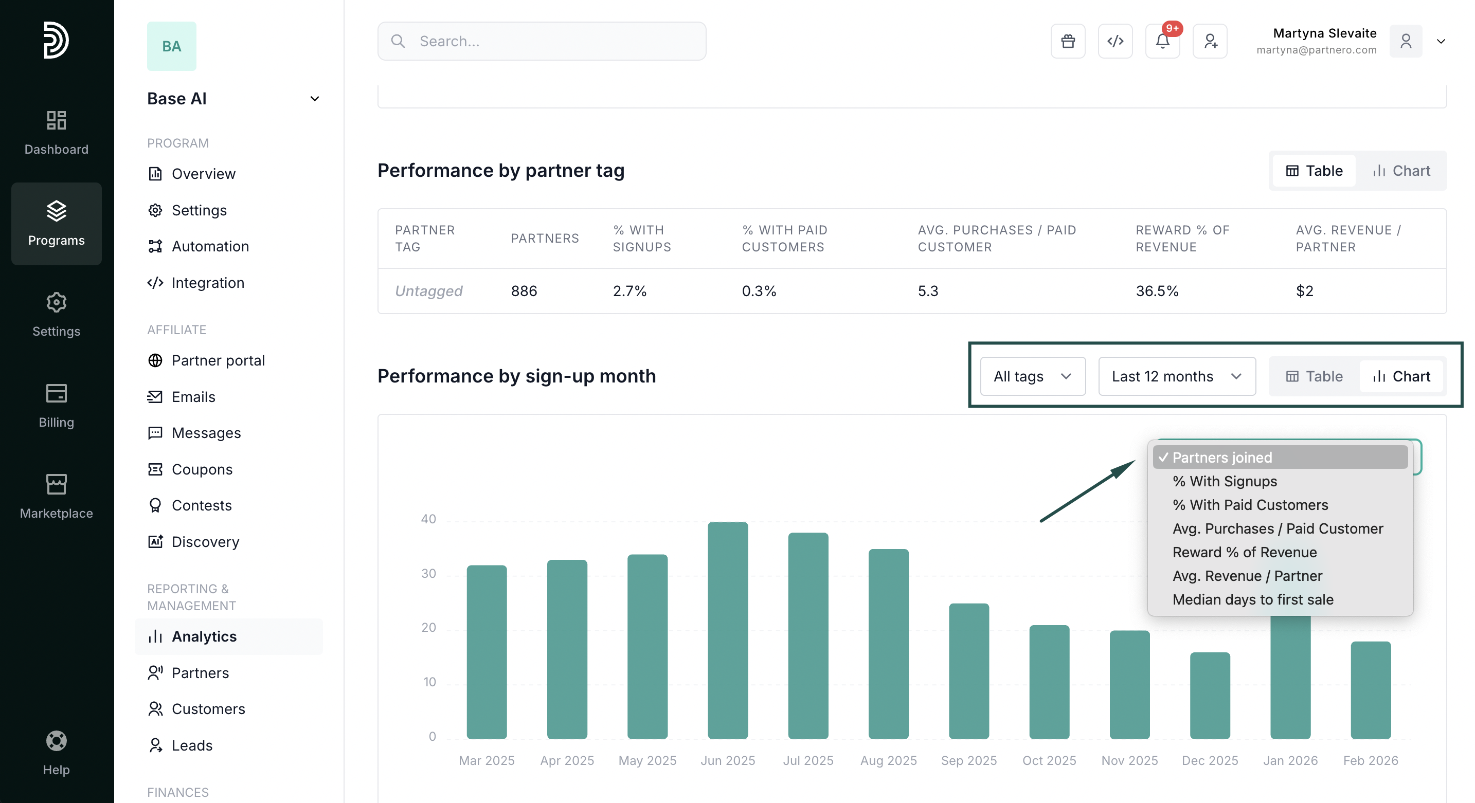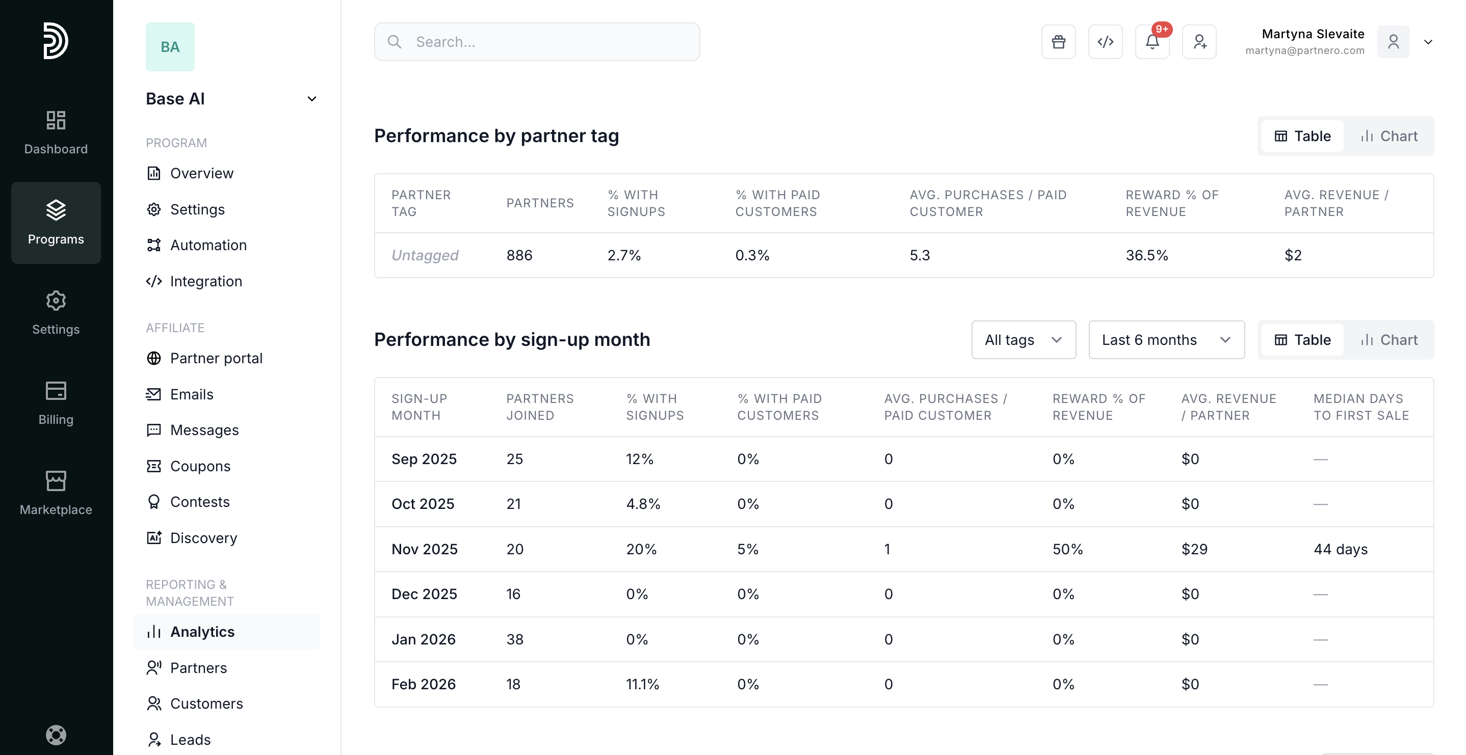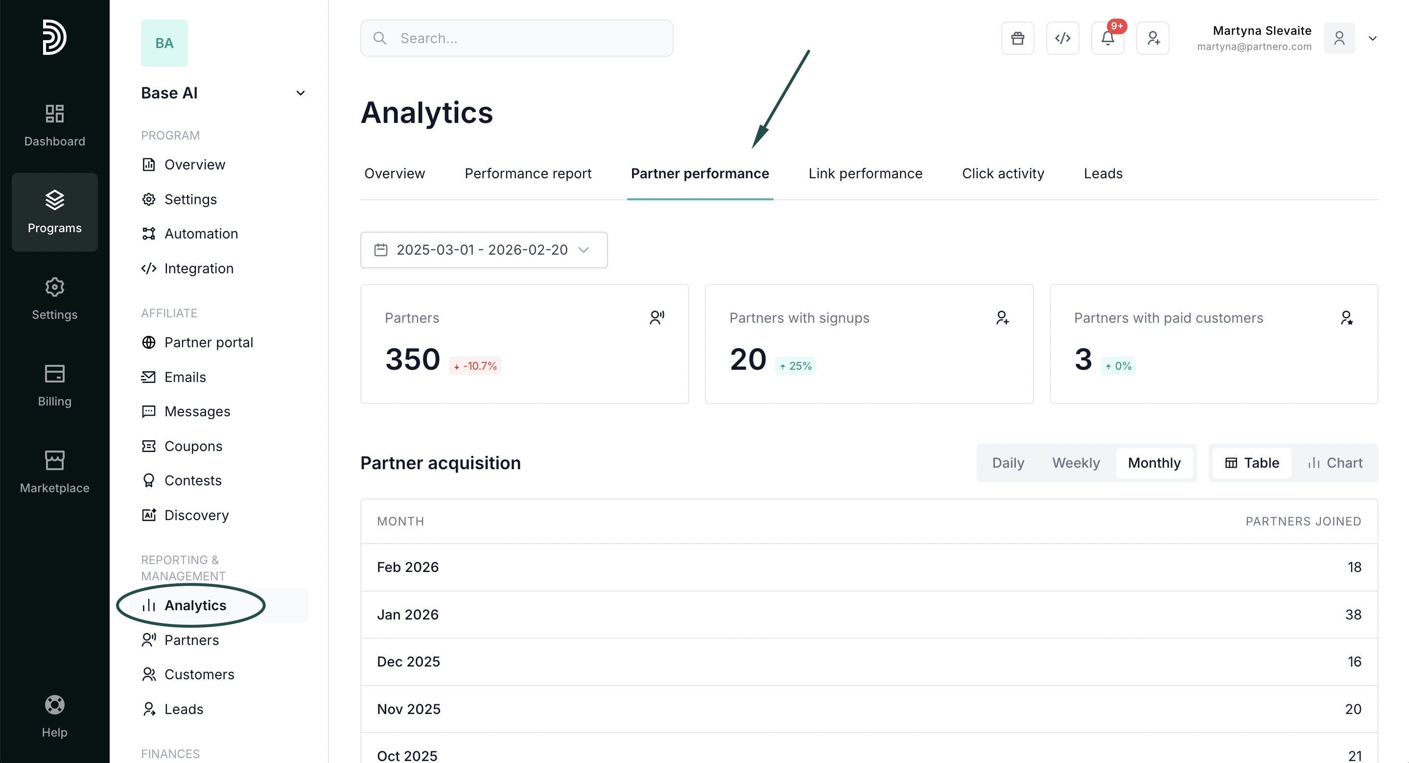 To access, open your program, click on Analytics, and switch to the Partner performance tab: