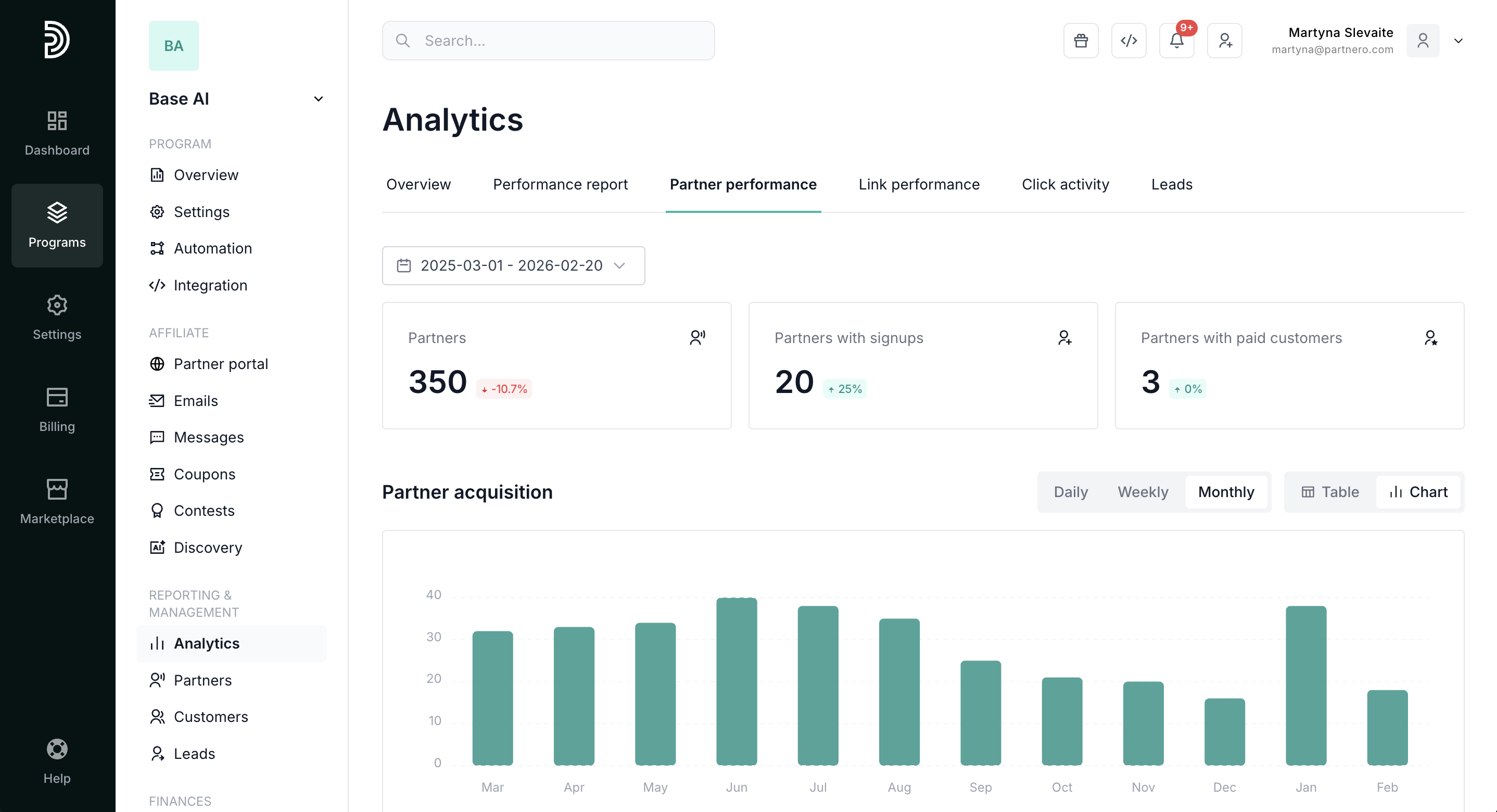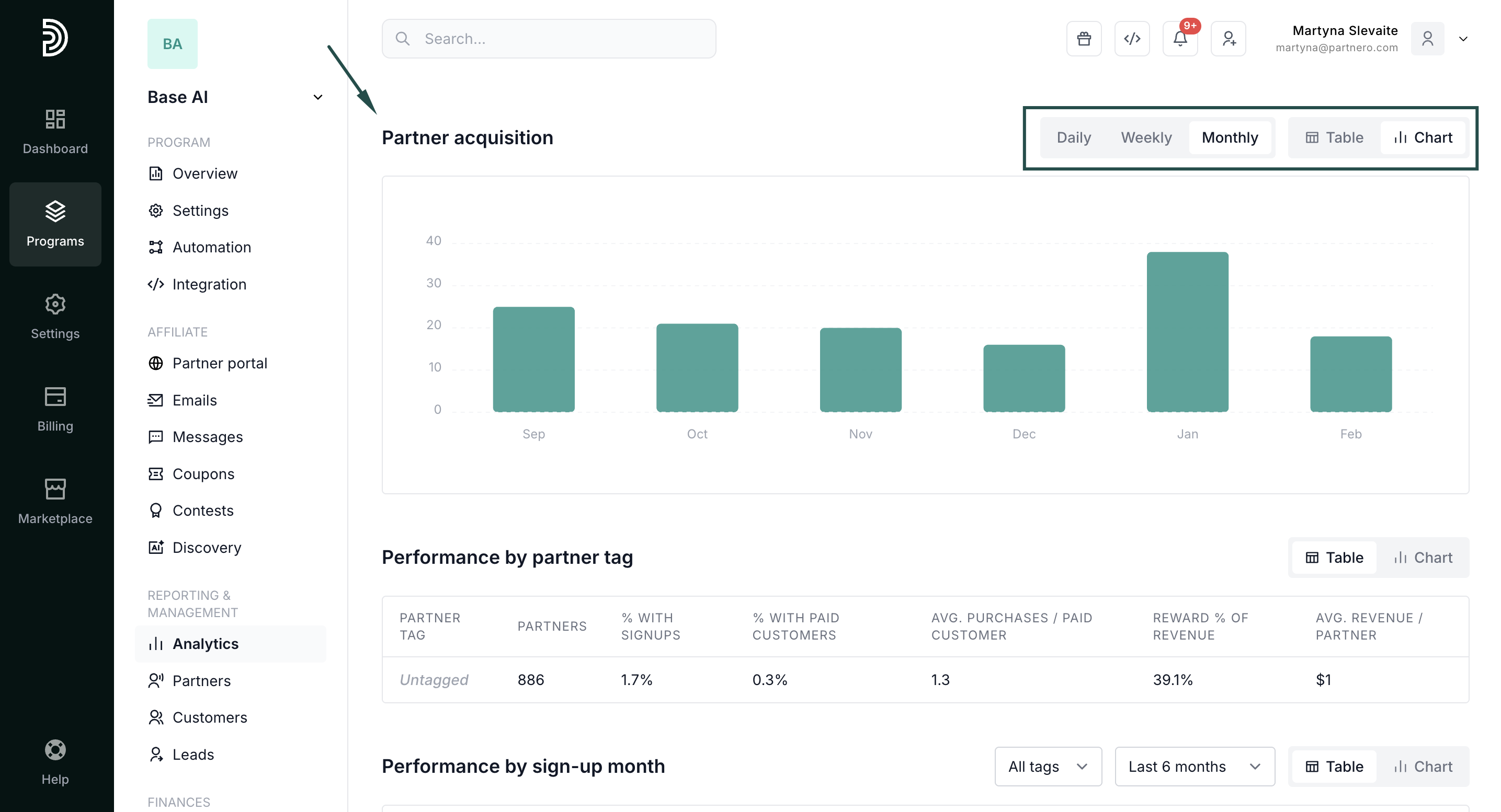 Further down, review your partner acquisition metrics. Switch between daily, weekly, or monthly reports. Also, select table or chart view: