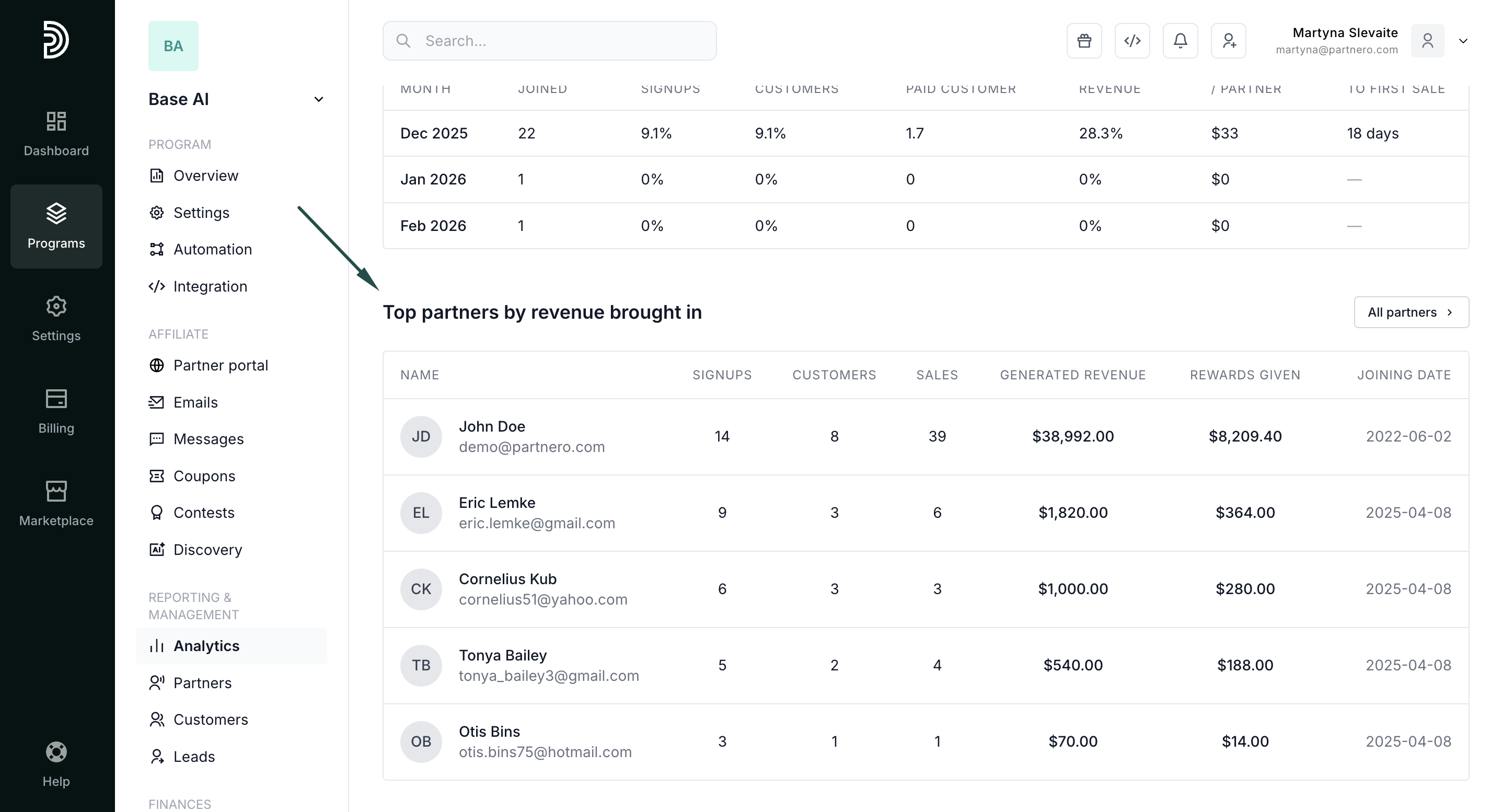 Top partners table: Lastly, you'll findour highest-performing affiliates ranked by signups, sales, revenue, and rewards. Click through to any partner's profile for a deep dive.