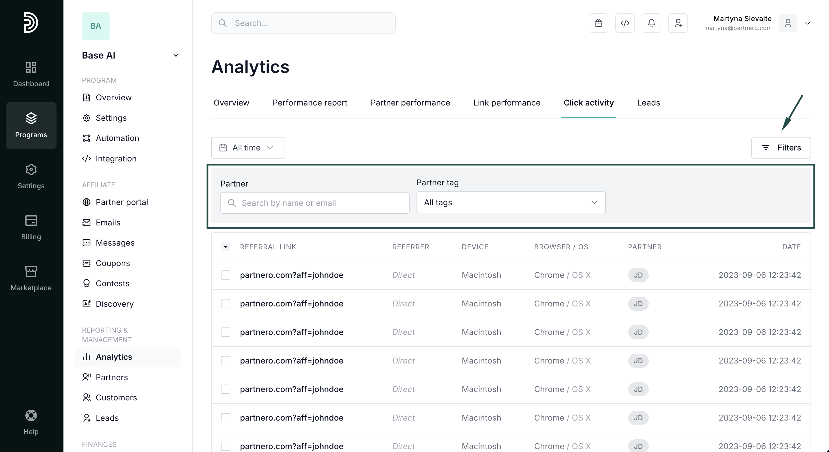 - Partner: Which affiliate drove the click, with a direct link to their profile.