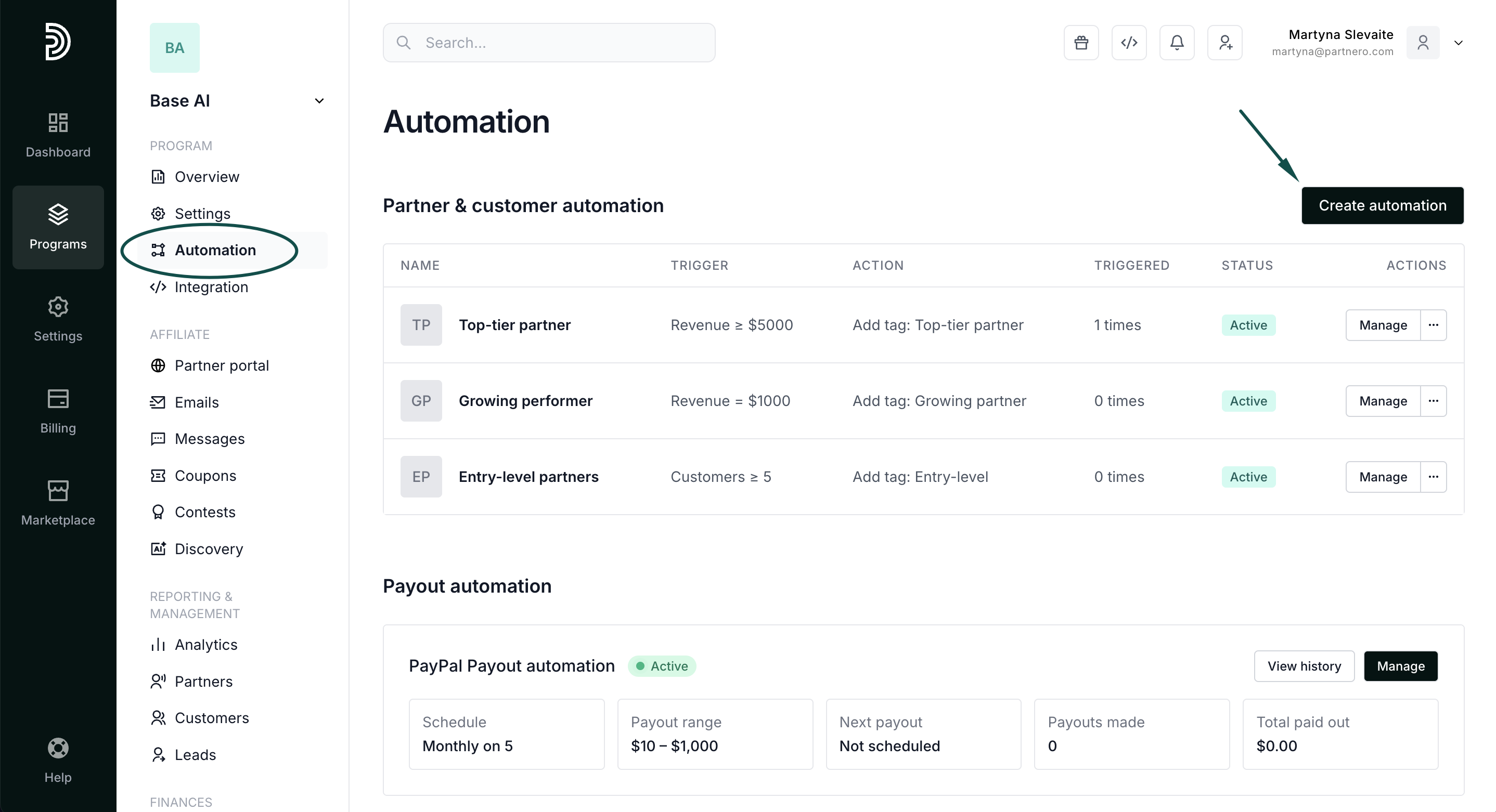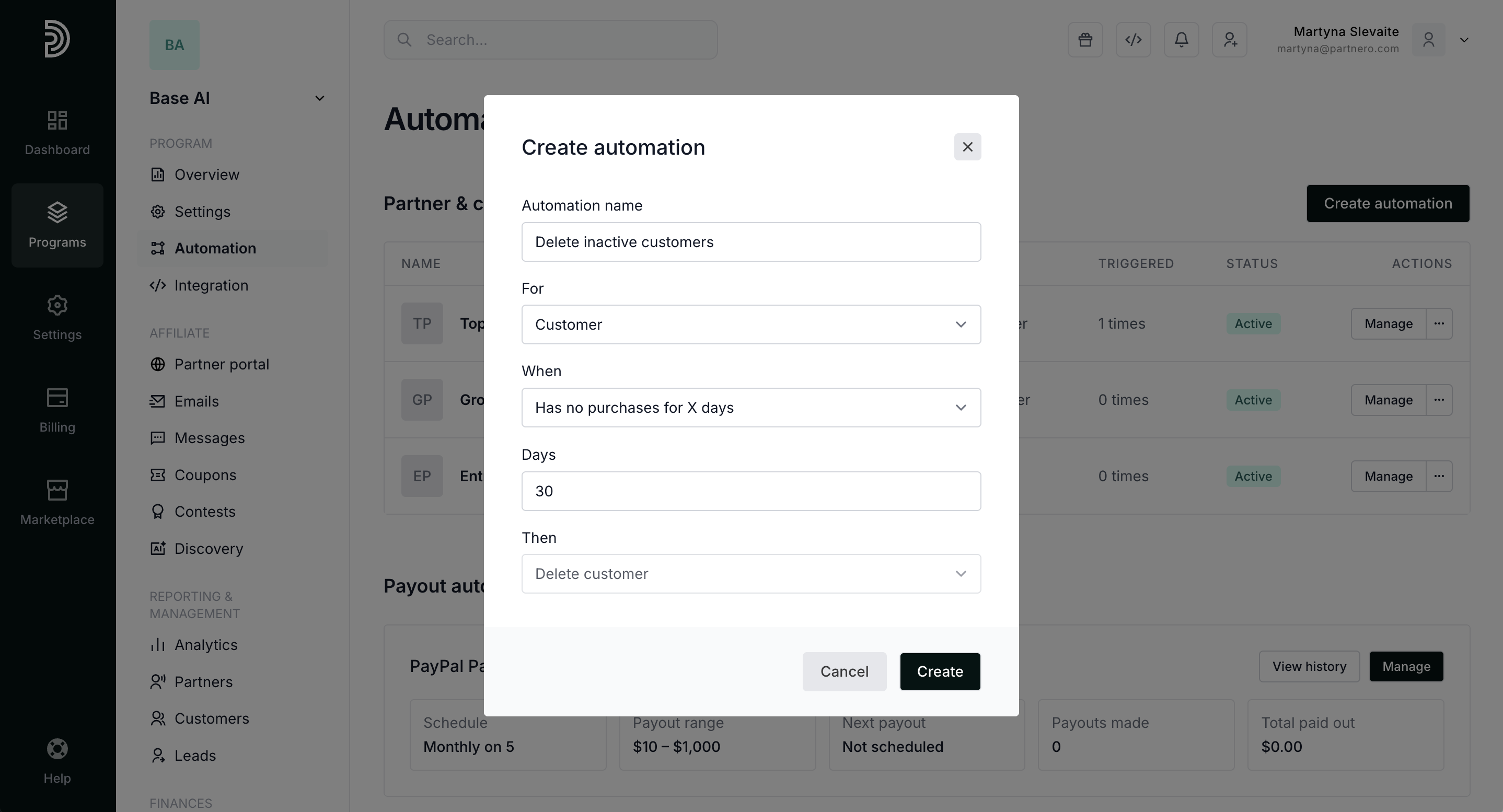 Partnero's automation feature lets you automatically delete customer records that have not made a purchase within a set number of days. This helps keep your customer list clean by removing records that are no longer relevant to your program.