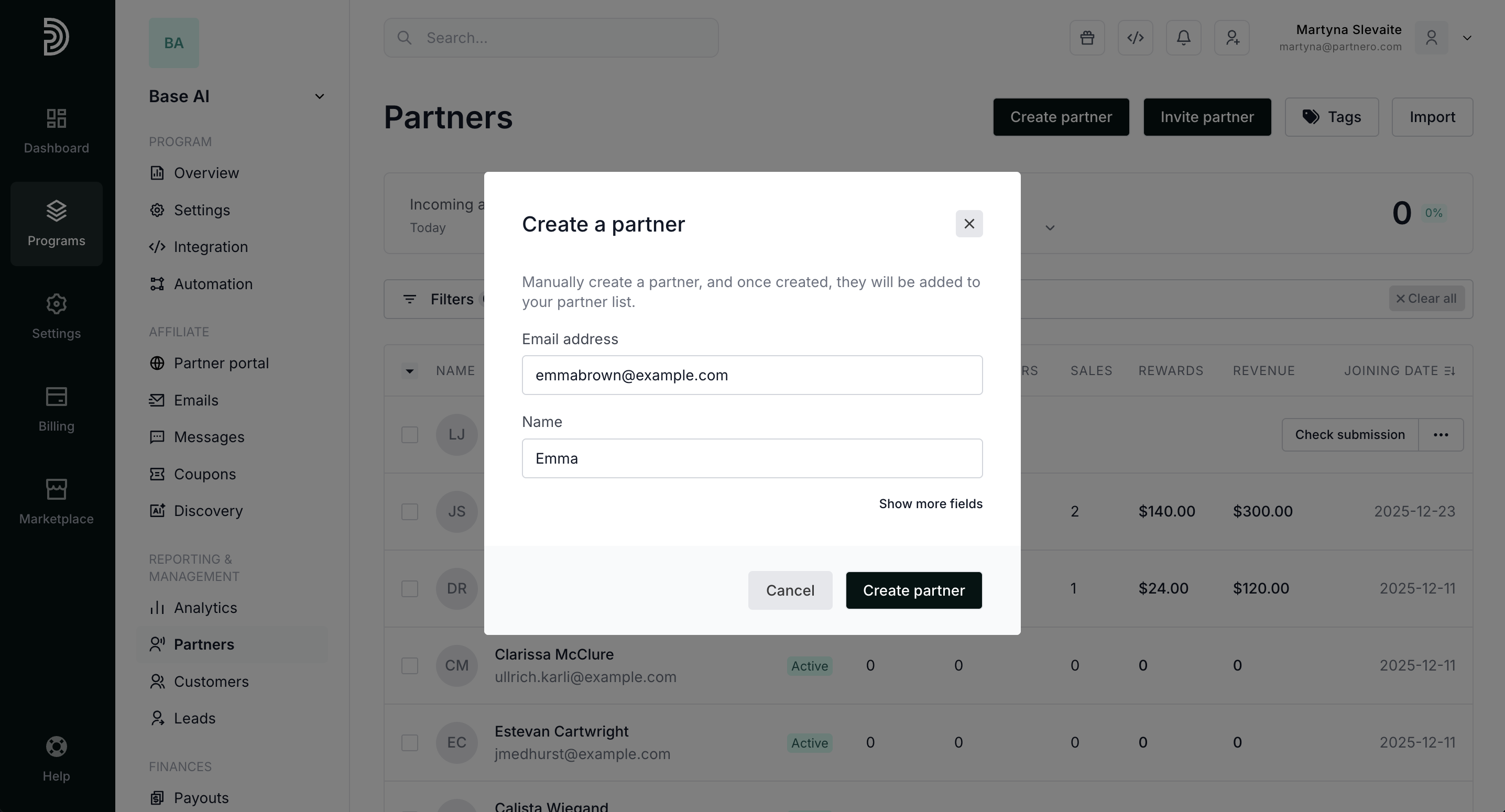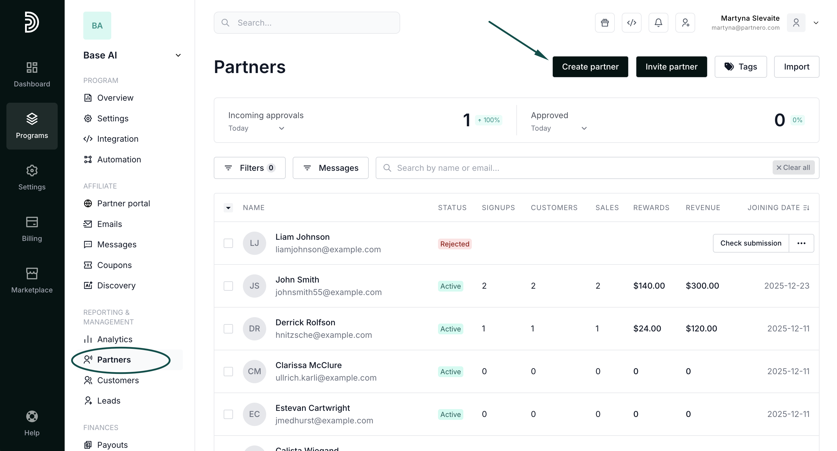 - In your affiliate program, navigate to Partners under Reporting and management.
