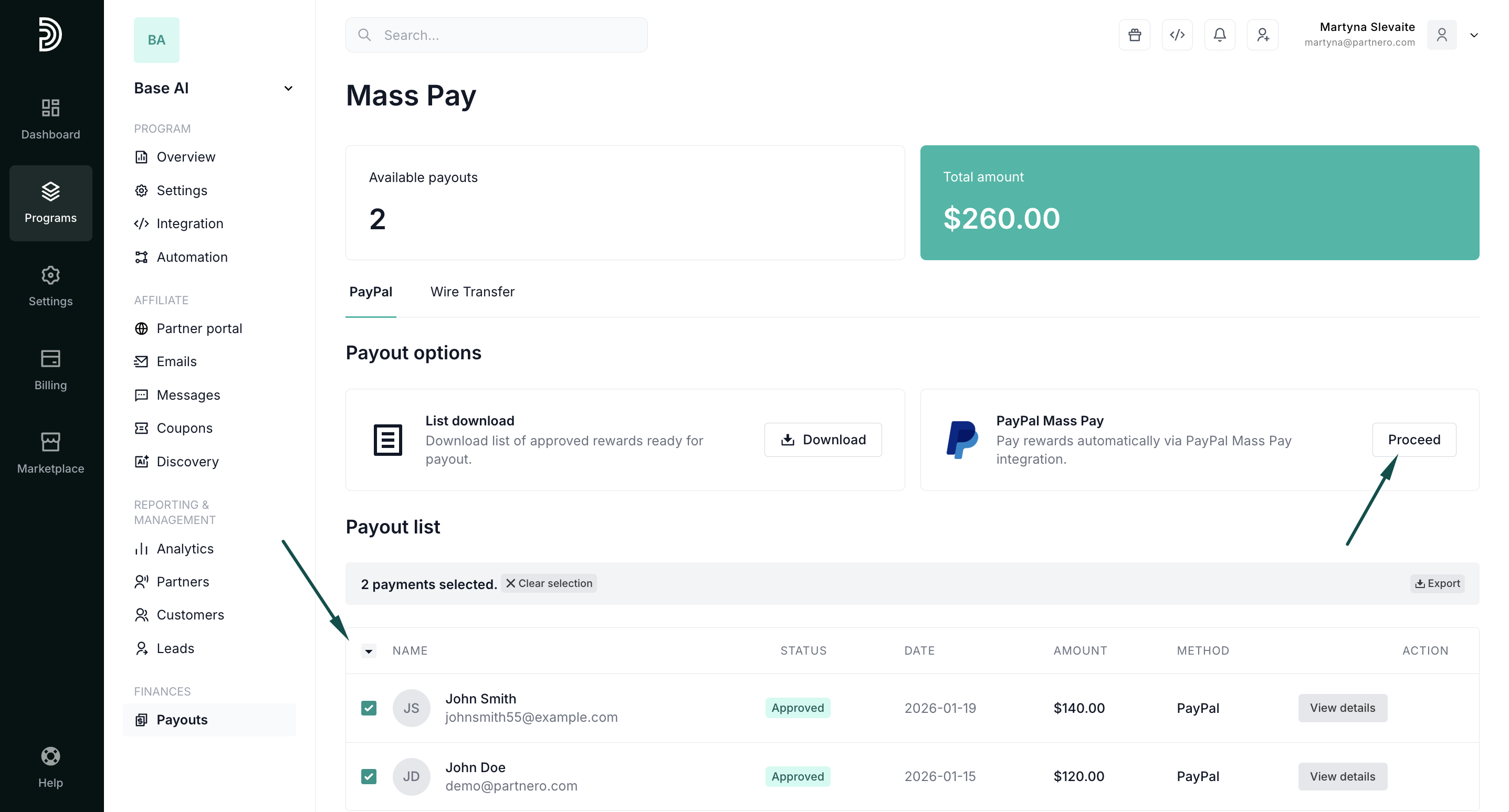 Approve the payout requests you'd like to process. This step will not be necessary if your program is set to automatically approve all payout requests.