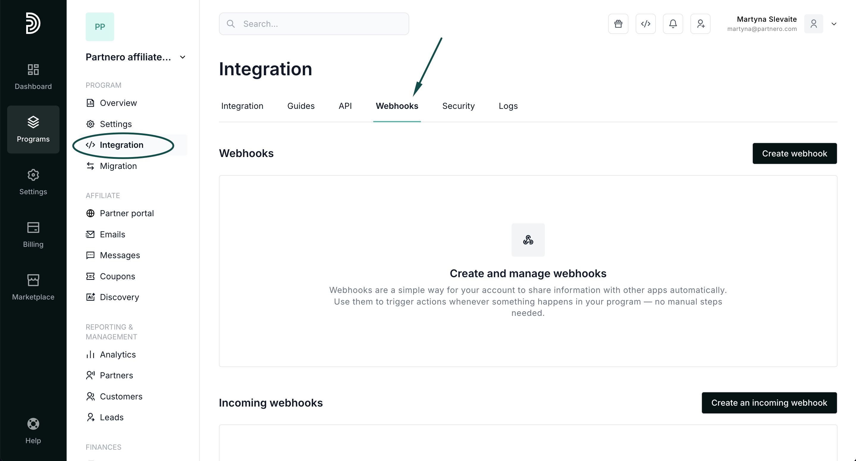- In your affiliate program, go to Integration and switch to the Webhooks tab: