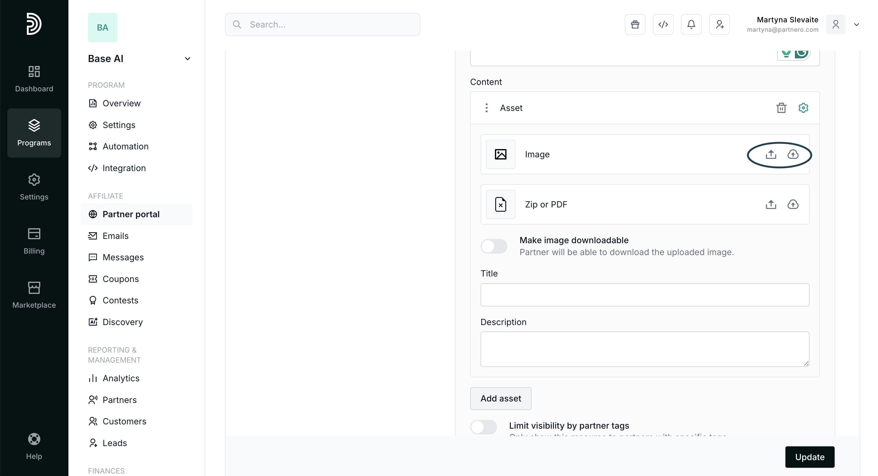 | Assets | Upload .zip, .png, .pdf, and .jpeg files for your partners to download. |