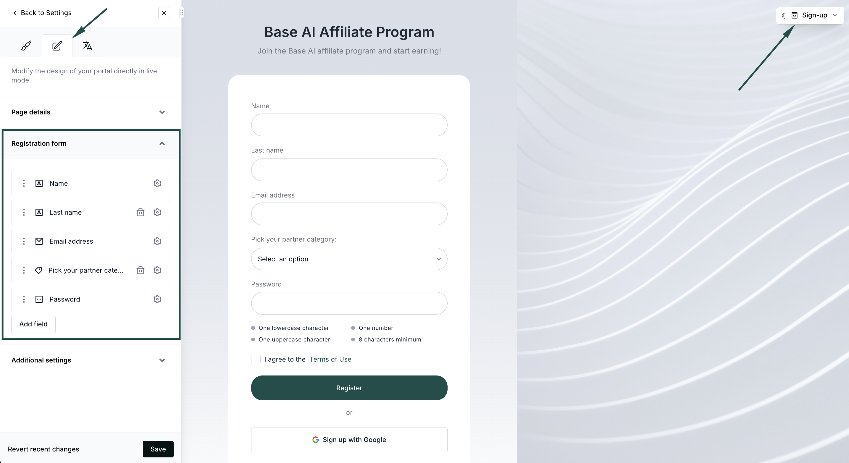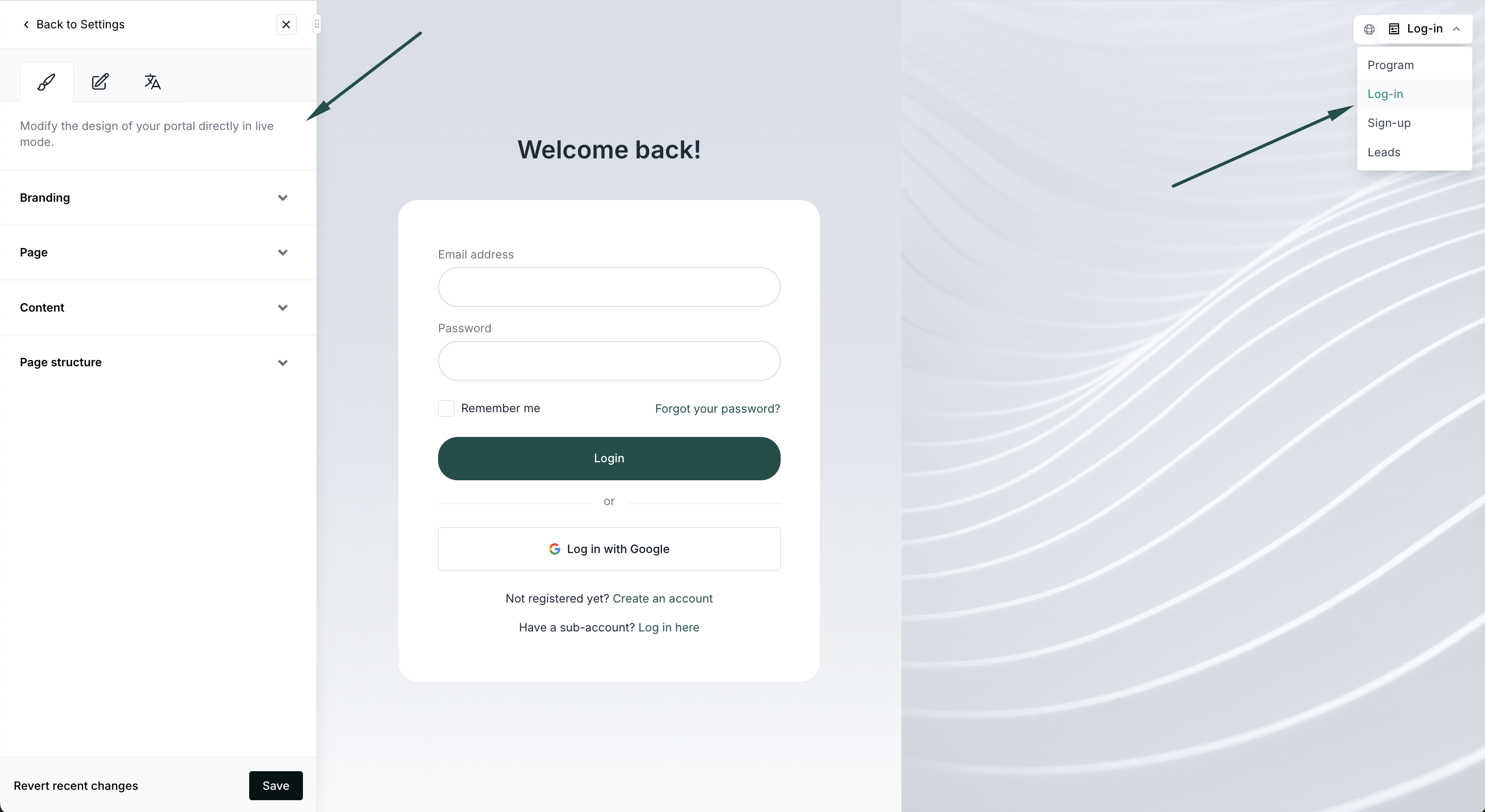 - This will open the Live Designer. You'll see the live preview on your partner portal with the editor on the left side. Switch between the signup and login pages in the upper right corner: