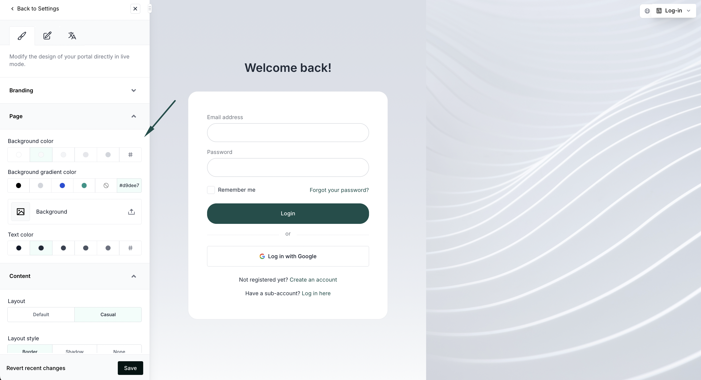 - Navigate to Pages & Content tab, Public pages, and then Log-in page: