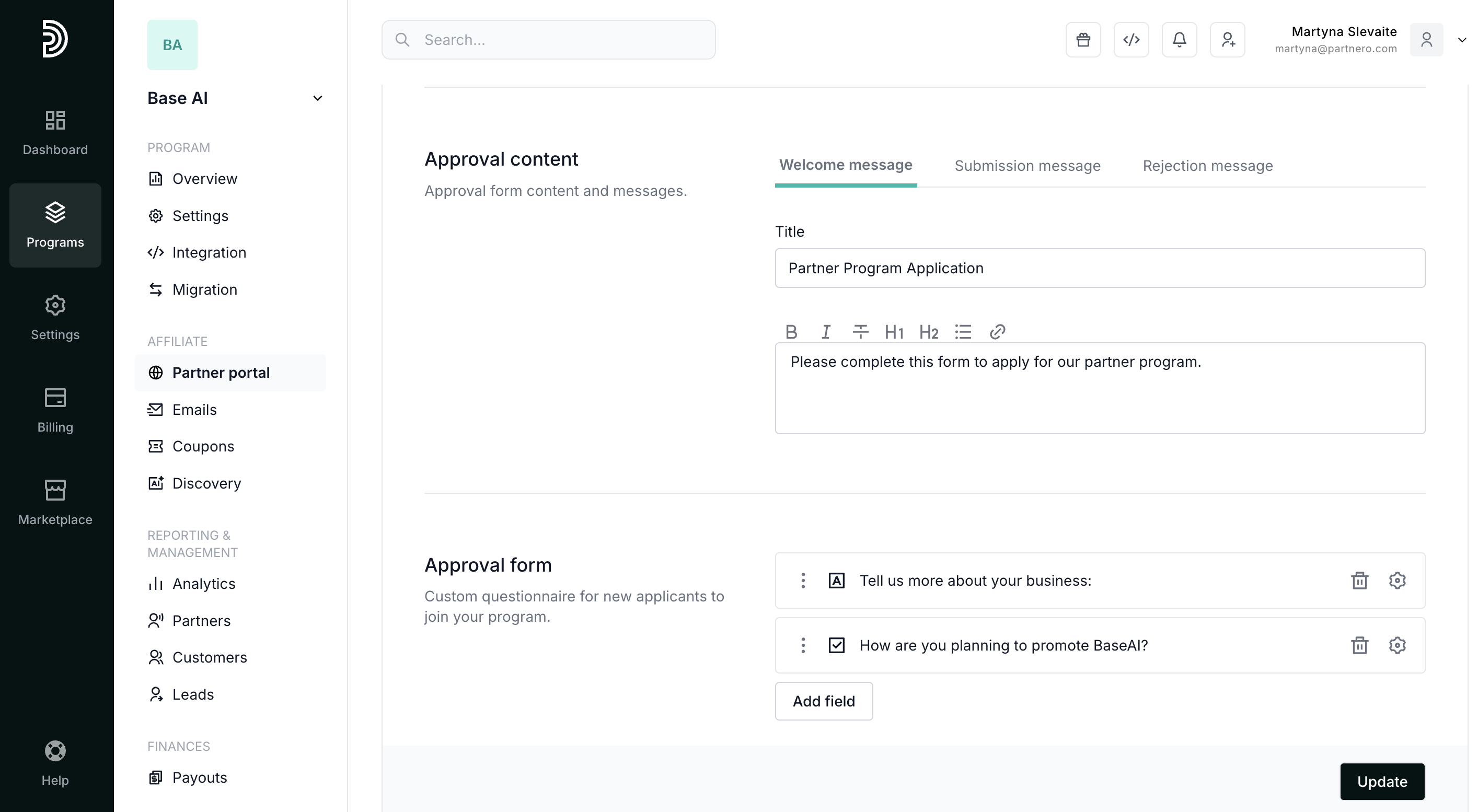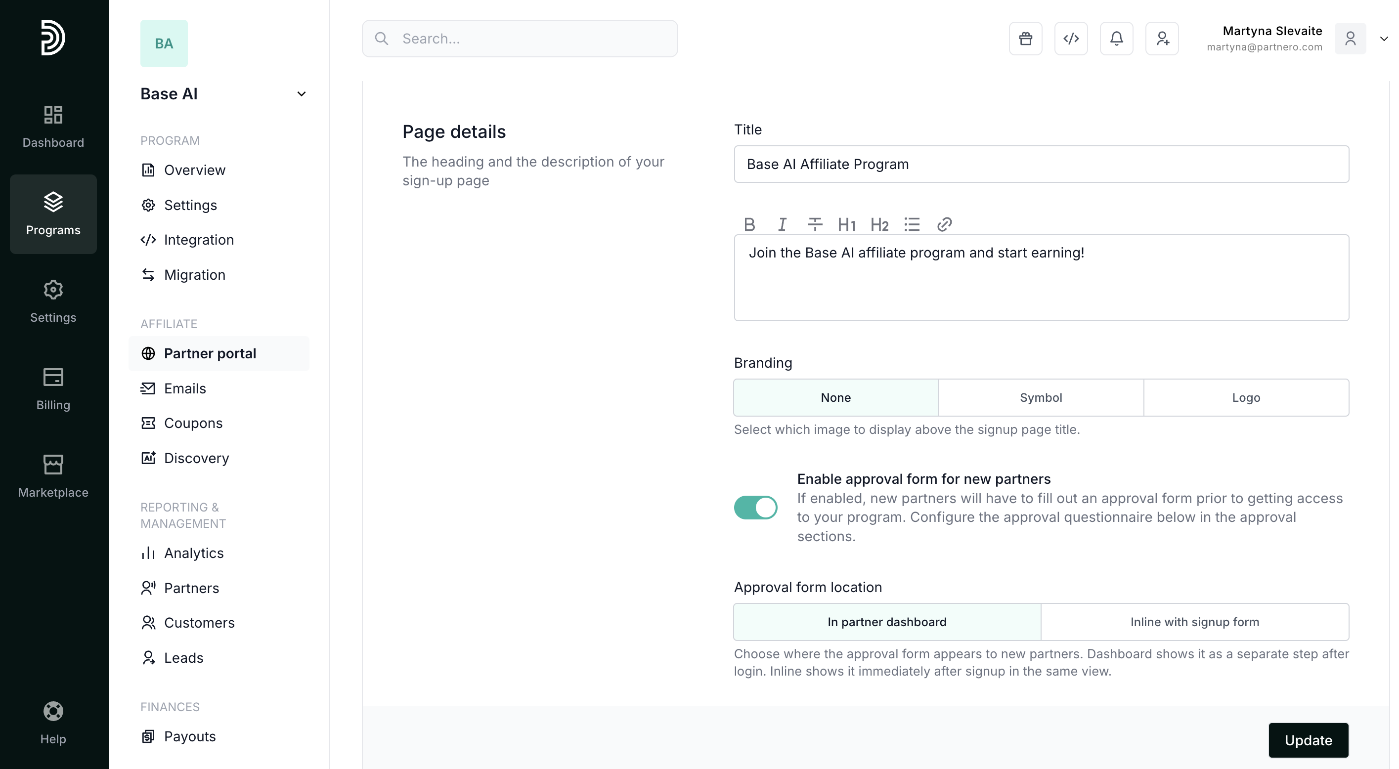 Add a title and description to welcome your new partners. Choose your branding option and enable partner approval forms.
