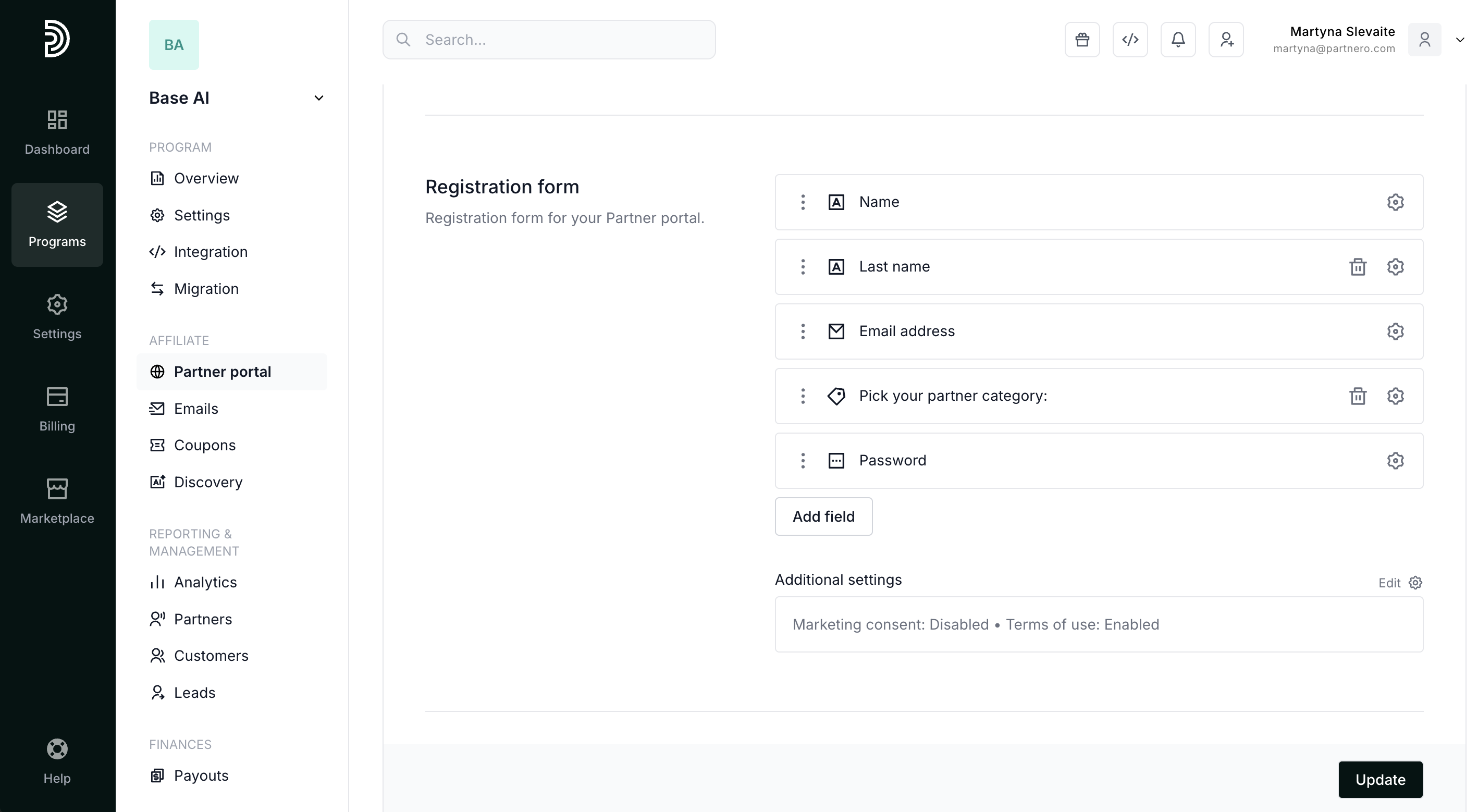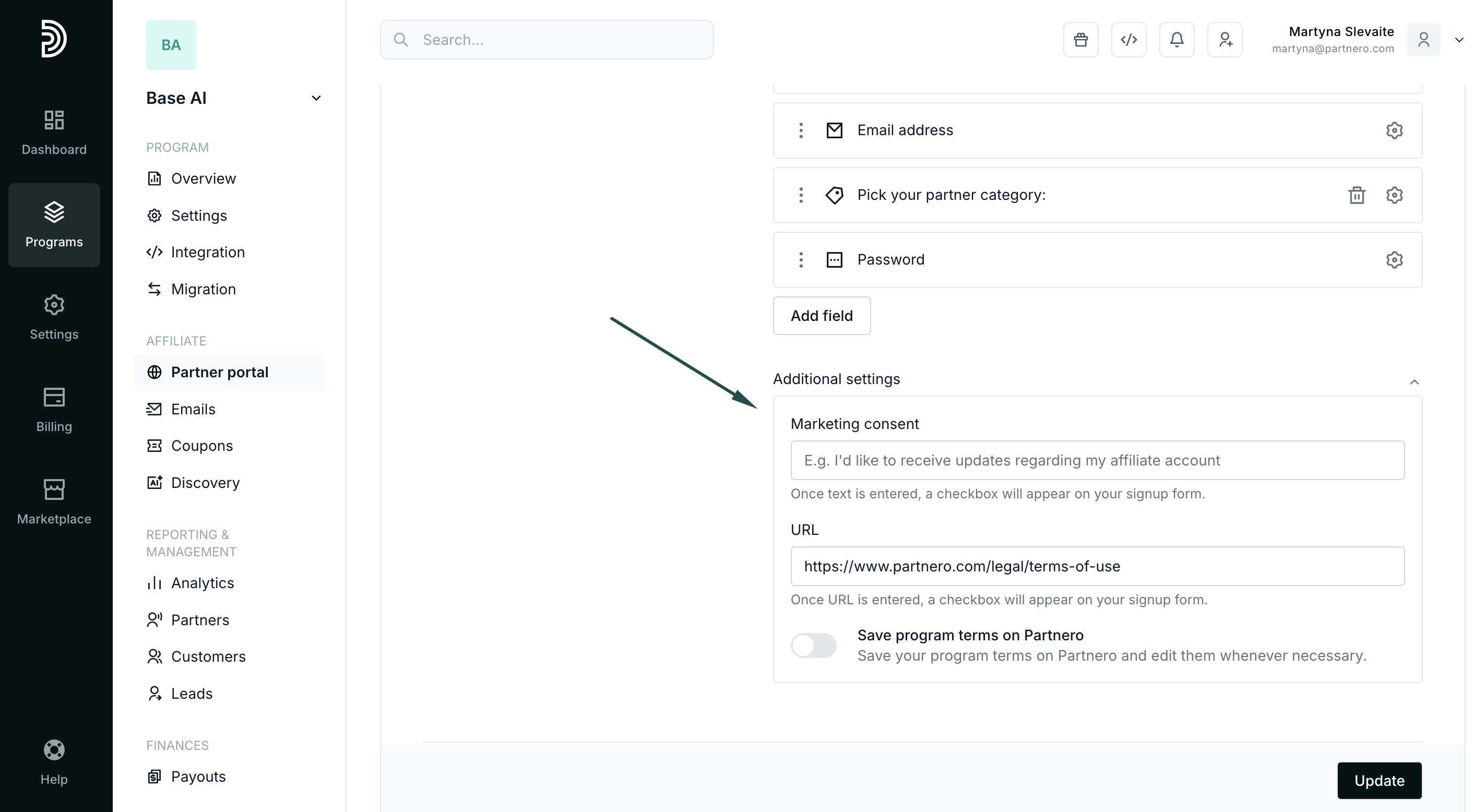Terms of use - add a link to your partner program terms. Once added, a checkbox will be shown under the registration form. Partners will have to check the box to proceed with the registration. Alternatively, you can save program terms on Partnero. Read more.
